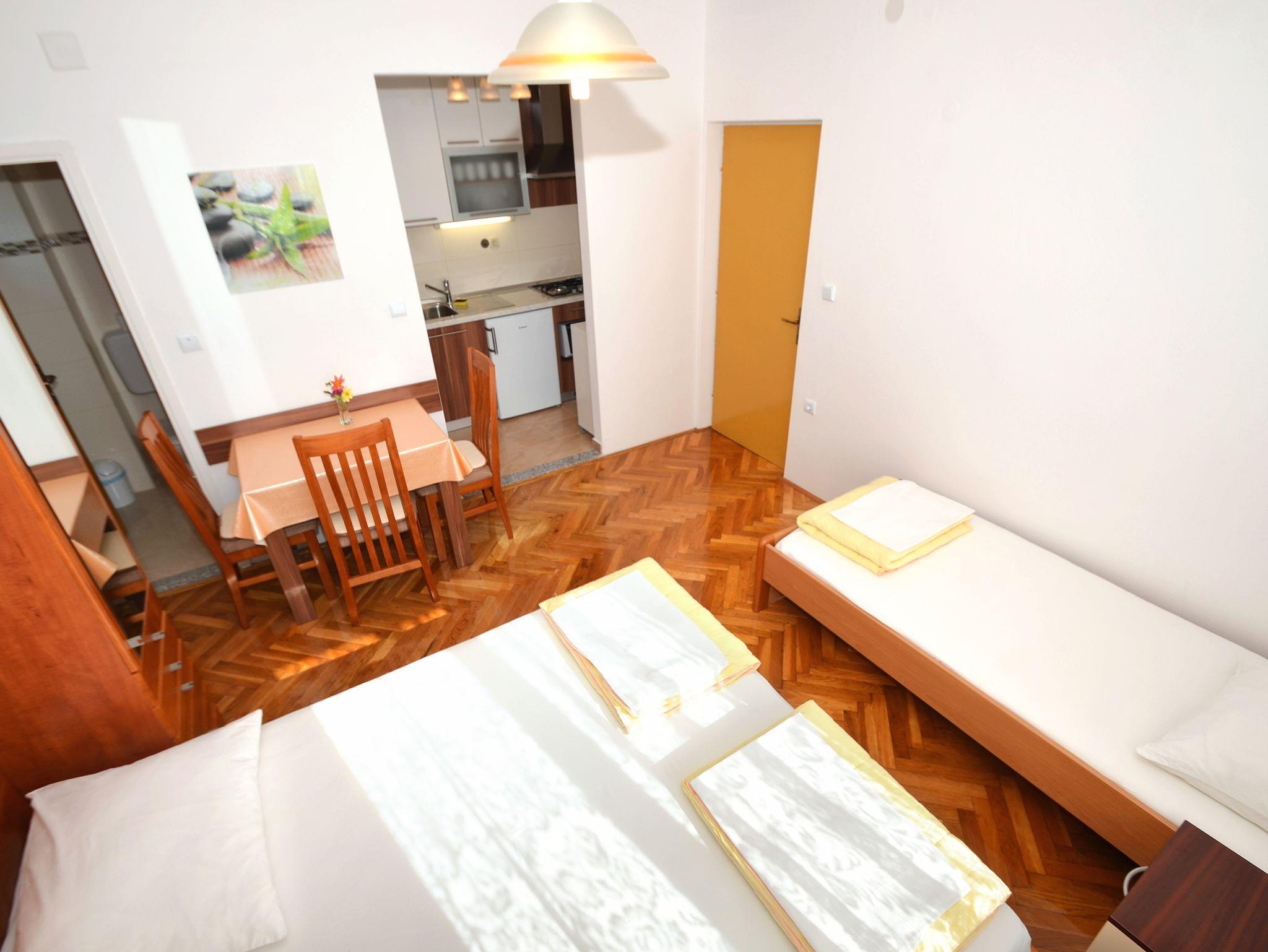 Studio bietet Platz für 3 Gäste. Die Betten sind in Schlafzimmern, die es 1 gibt, innerhalb einer Gesamtfläche von 21m2, angeordnet. Es ist erlaubt, Speisen auf dem Gemeinschafts-Grill vorzubereiten. Die reservierte Unterkunftseinheit hat keinen Balkon und keine Terrasse. IM PREIS INBEGRIFFEN: Kurtaxe, Endreinigung, Parkplatz, Internet, Wäschewaschen, Bootsanlegeplatz, Kinderbett, Bügeleisen, Bügelbrett. VERBINDLICHE ZUSÄTZLICHE KOSTEN: Aufzahlung für Kurzaufenthalte (prozentualer Zuschlag pro Nächtigungsanzahl: 30% - 1, 20% - 2, 10% - 3). Die Verfügbarkeit zusätzlicher Dienstleistungen in Ihrem reservierten Termin und die Preise derselben (falls nicht aufgeführt) müssen im Voraus überprüft werden. Zusätzliche Dienstleistungen die in der Zahlungsaufforderung nicht aufgeführt sind werden direkt beim Vermieter bezahlt, angenommen der Gast nutzt auch diese. Ermäßigung auf den Grundpreis: Gratistag 14=13 (bei einem Aufenthalt von 14 Tagen oder mehr erhalten Sie einen Gratistag für den Aufenthalt bis 31.12.26).