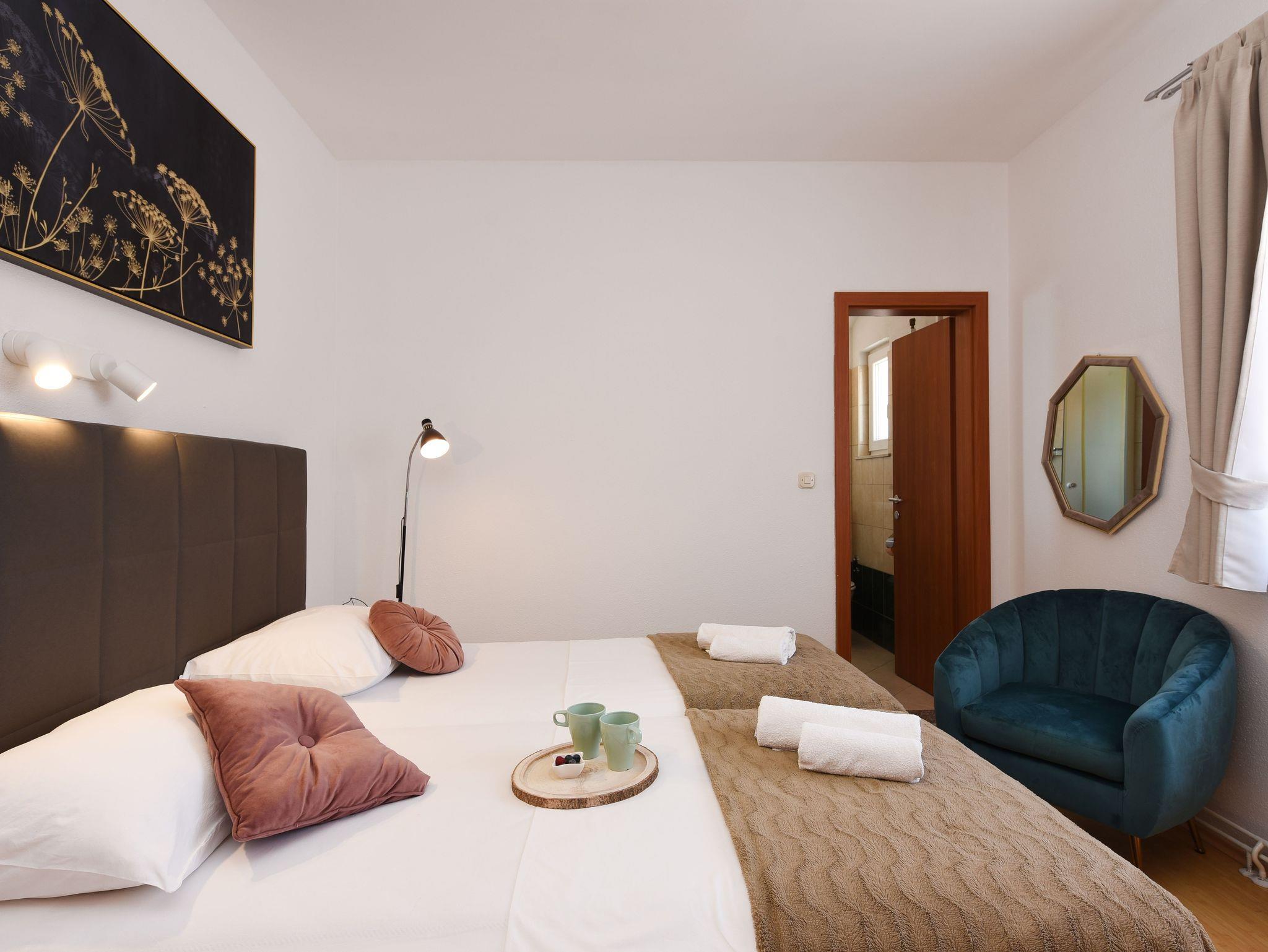 Ferienwohnung bietet Platz für 4 Gäste. Die Betten sind in Schlafzimmern, die es 2 gibt, innerhalb einer Gesamtfläche von 41m2, angeordnet. Die Gäste haben einen eigenen Balkon zur Verfügung, auf der sie in warmen Sommernächten genießen können. Das Apartment bietet Meerblick. In der gebuchten Unterkunftseinheit zahlt man am Ort ein Depositum ( der Preis ist an der Internetseite angeführt ). IM PREIS INBEGRIFFEN: Kurtaxe, Endreinigung, Klimatisierung, Zentralheizung, Parkplatz, Internet, Kinderbett, Bügeleisen, Föhn. VERBINDLICHE ZUSÄTZLICHE KOSTEN: Kaution (200,00 € Einmalzahlung), Aufzahlung für Kurzaufenthalte (prozentualer Zuschlag pro Nächtigungsanzahl: 30% - 1, 20% - 2, 10% - 3). Die Verfügbarkeit zusätzlicher Dienstleistungen in Ihrem reservierten Termin und die Preise derselben (falls nicht aufgeführt) müssen im Voraus überprüft werden. Zusätzliche Dienstleistungen die in der Zahlungsaufforderung nicht aufgeführt sind werden direkt beim Vermieter bezahlt, angenommen der Gast nutzt auch diese.
