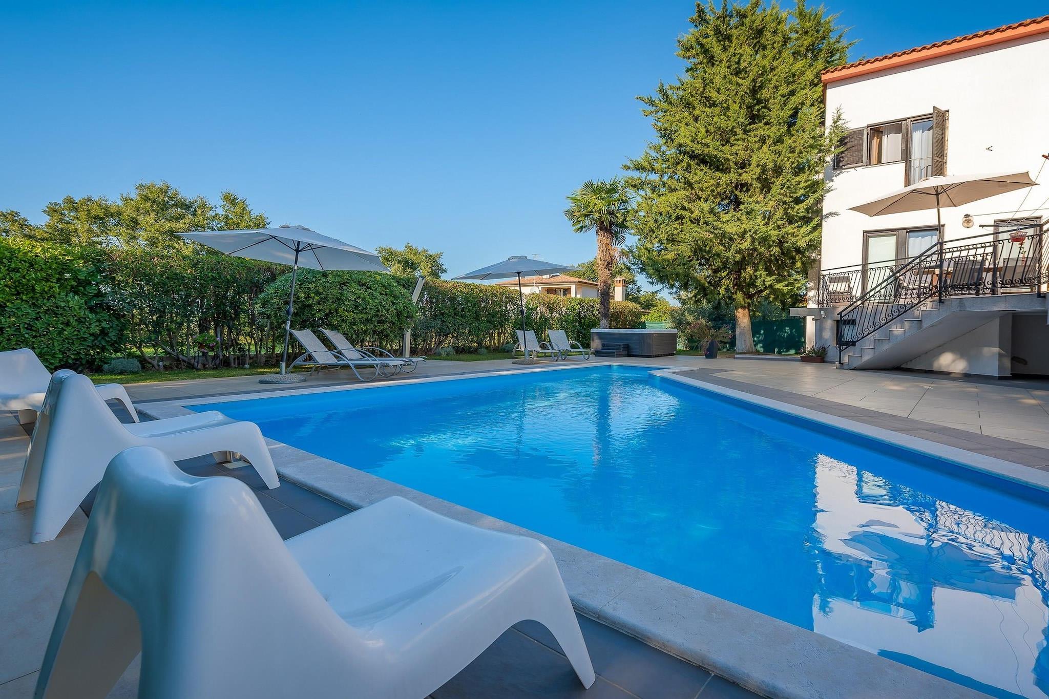 Ejendommen tilbyder sammen med sit rummelige og indbydende design en komfortabel villa med fire soveværelser, der kan rumme op til otte gæster. Det har en privat have, udendørs møbler og en privat swimmingpool, ideel til udendørs fritid. Indenfor har villaen væsentlige faciliteter såsom aircondition, en varmepumpe til komfort året rundt, Wi-Fi, en vaskemaskine, en pejs og et tv med satellitkanaler på tysk. Villaen tilbyder også terrasse, balkon, spabad og udendørs parkering i samme bygning. Villaen er beliggende i det naturskønne landdistrikt Stranici kod Nove Vasi og tilbyder nem adgang til lokale attraktioner og faciliteter. Den nærliggende by Porec ligger kun 7 km væk, hvor gæsterne kan udforske klippestrande, butikker og spisemuligheder. Vandlandet "Aquacolors" (9 km) og forlystelsesparken "Dinopark Funtana" (13 km) er ideelle til familieunderholdning. Naturelskere kan besøge "NP Brijuni" naturreservatet (54 km) eller nyde en naturskøn udsigt langs "floden Mirna" (19 km). For golfentusiaster ligger golfbanen "Crveni Vrh" 44 km væk. Derudover tilbyder Pula Lufthavn (61 km) og togstationerne i Pazin (36 km) nem adgang til villaen for rejsende. Villaen har et uafhængigt køkken designet til bekvemmelighed og funktionalitet. Køkkenet er udstyret med gaskomfur, køleskab, mikroovn, ovn, fryser, opvaskemaskine, kaffemaskine, brødrister og kedel, sammen med alt nødvendigt køkkenudstyr, tallerkener og bestik til at tilberede måltider. For ekstra komfort inkluderer ejendommen et spabad til afslapning og en grill til udendørs spisning. Villaen tilbyder også en sikkerhedsboks og en hårtørrer for ekstra bekvemmelighed.