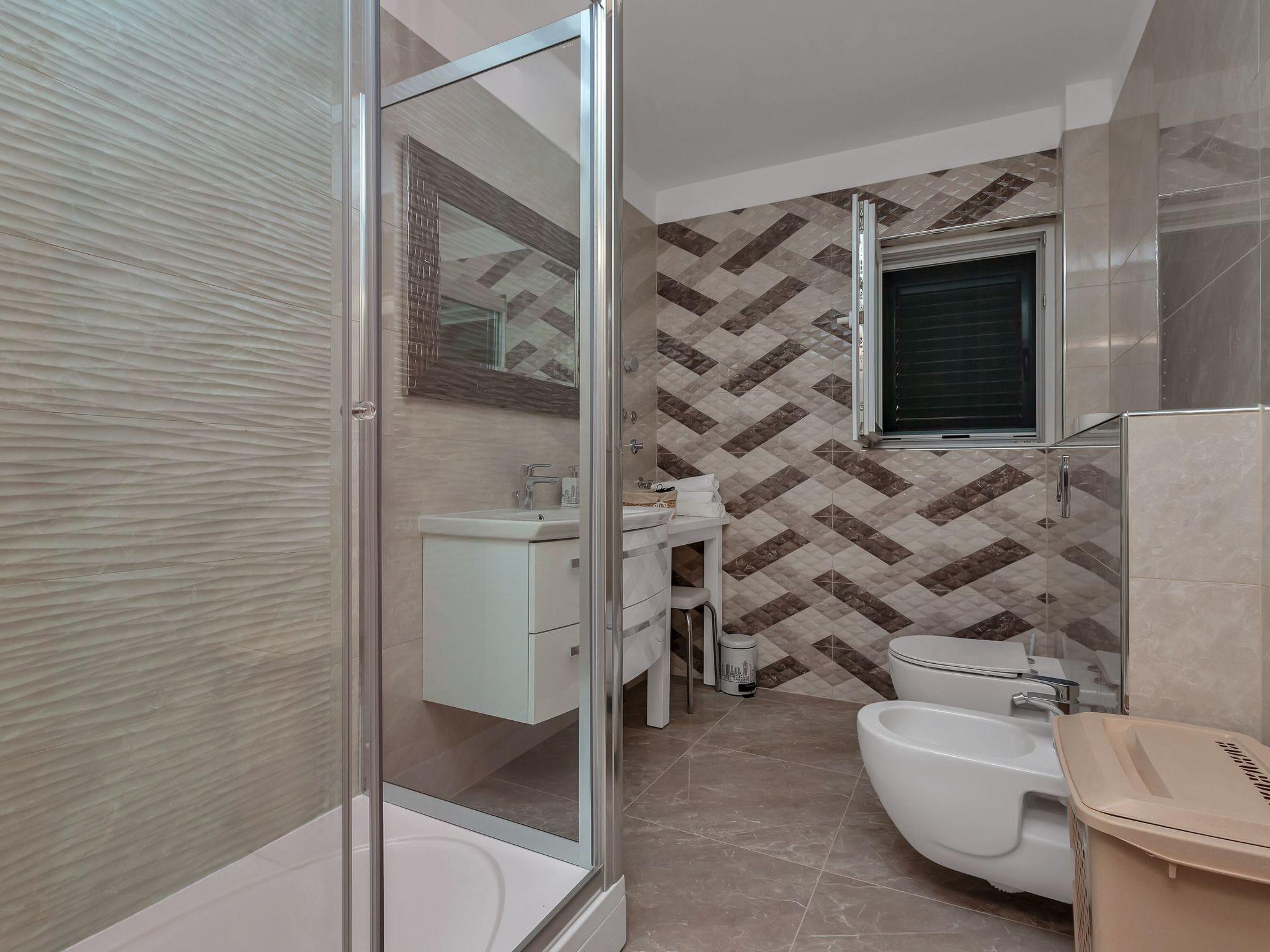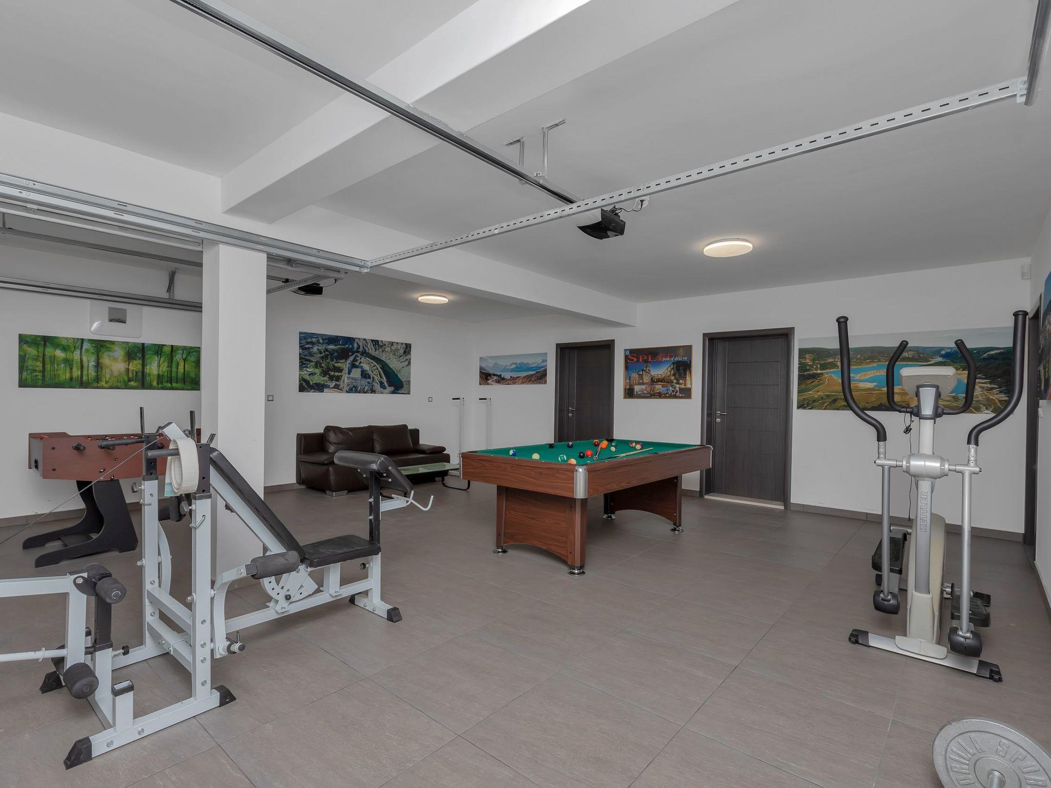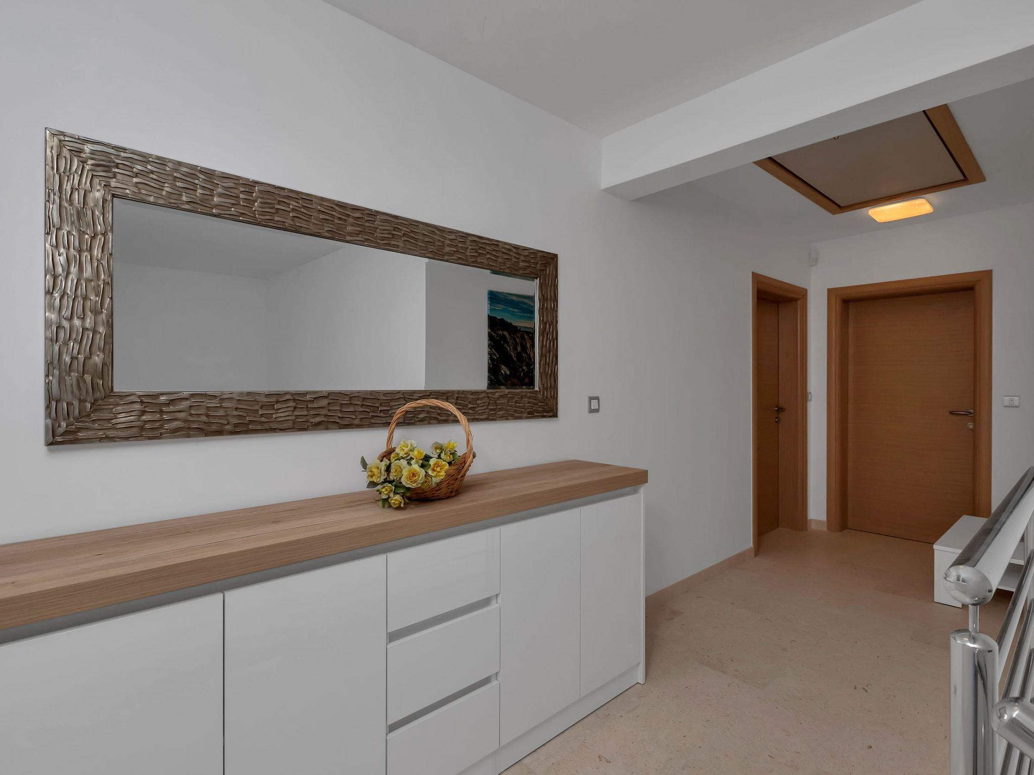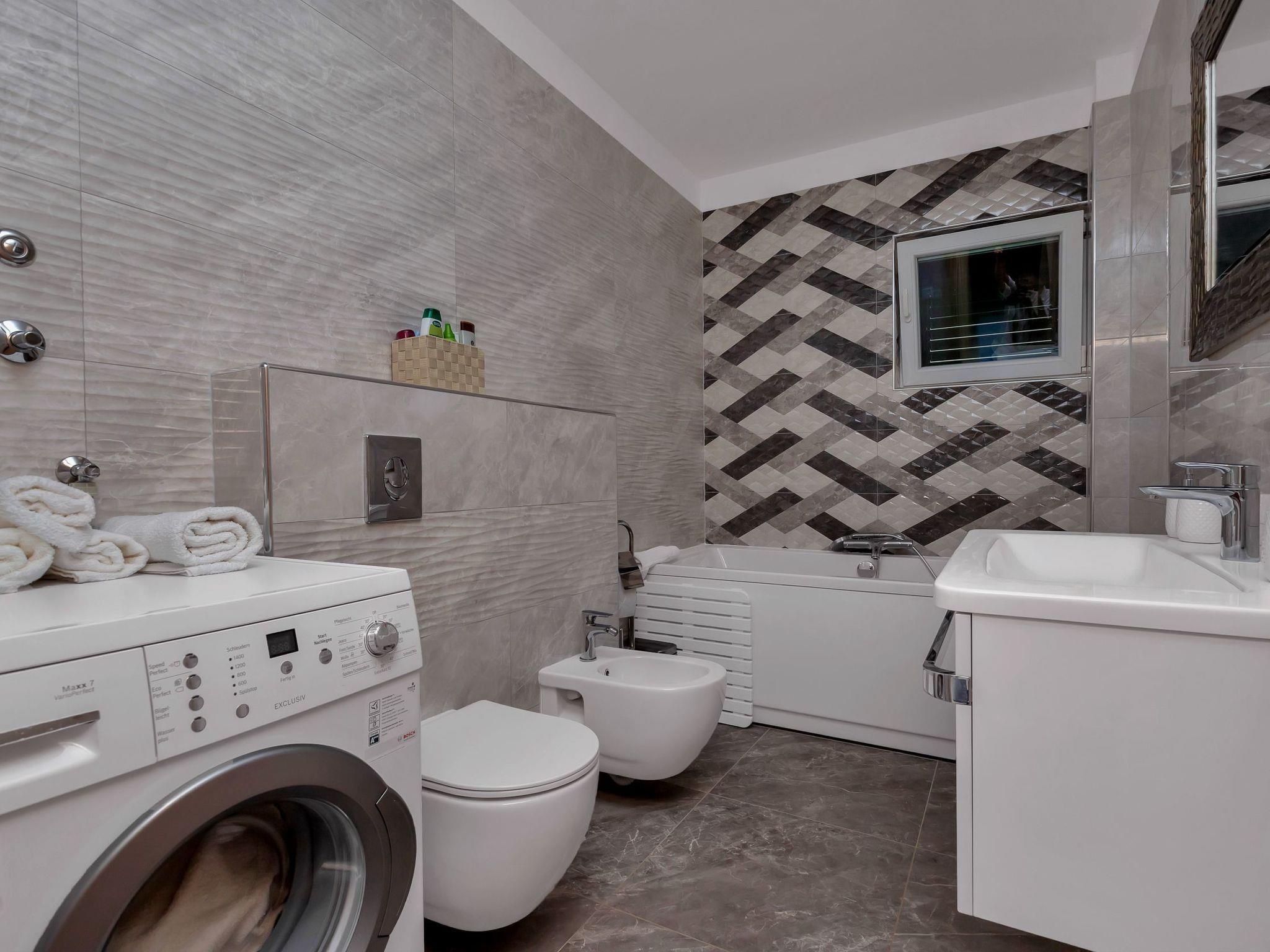 The house is fully air-conditioned, has underfloor heating and is divided into 3 units. On the ground floor there is a fitness room and lounge (sauna, billiards, table football, etc.) On the first floor there is a large flat (130m²) with a large living and dining area. The spacious kitchen is fully equipped (6 induction hobs, fridge-freezer, microwave, oven, dishwasher, dining table for 12 people). The living and dining area also has a seating area with a sofa bed for 2 people, TV and fireplace. On the same floor there are 2 additional bedrooms (each with a double bed) and 2 bathrooms. The staircase leads to the second floor, which is divided into two flats, one of which has a living and dining area with kitchen, a bedroom, a bathroom and a terrace with lake views. The other flat has a living and dining area with kitchen, as well as 2 bedrooms, a bathroom and two terraces with lake views.