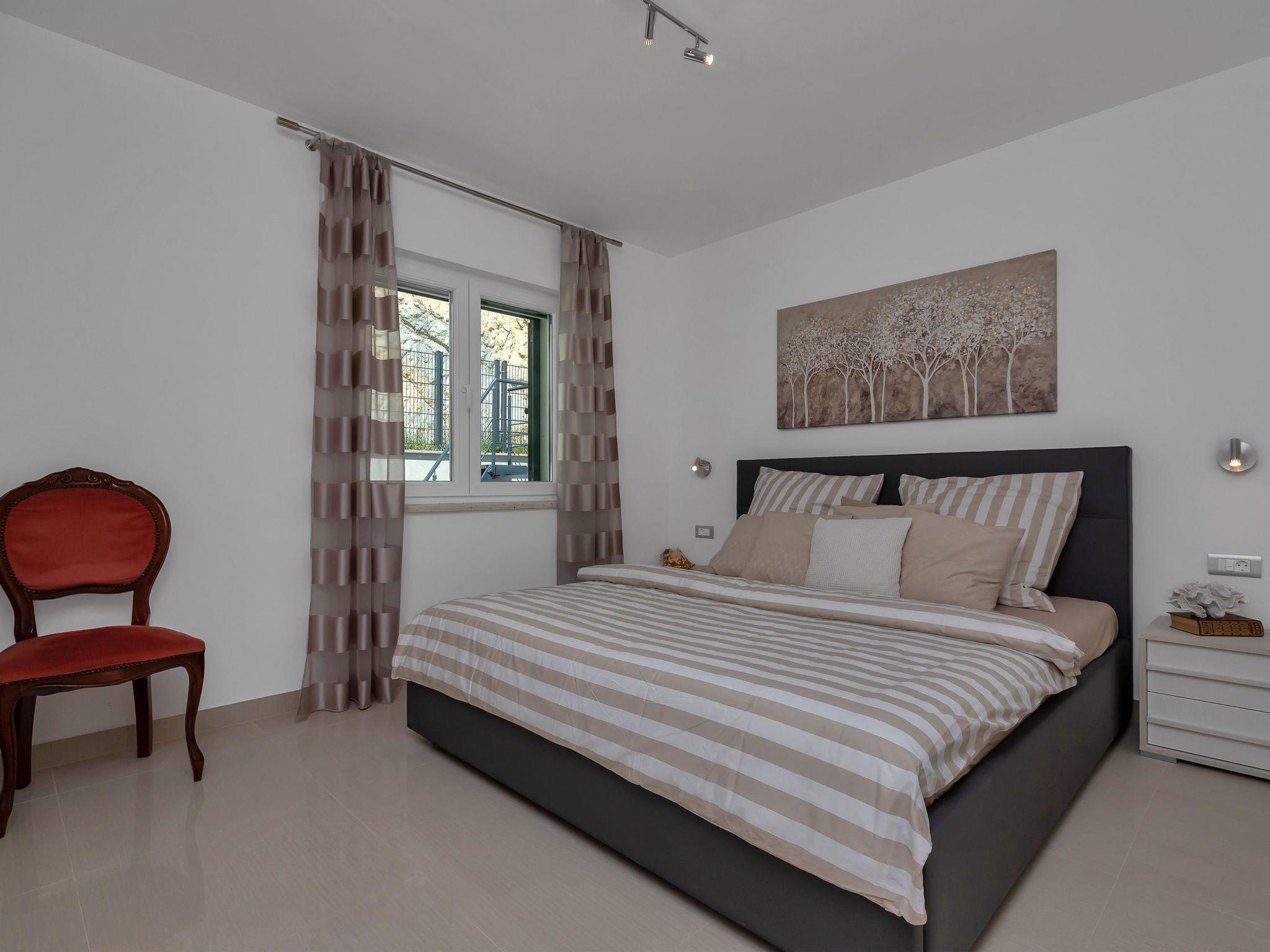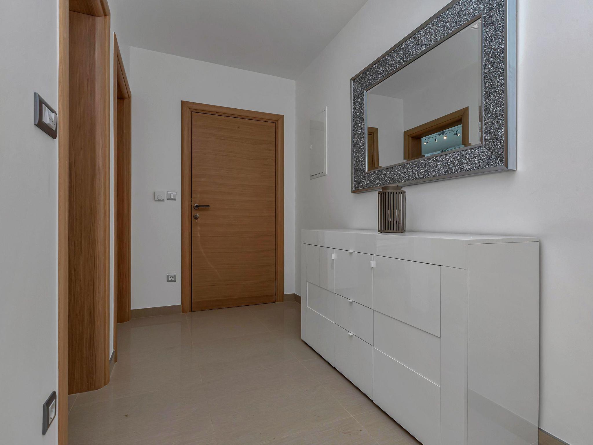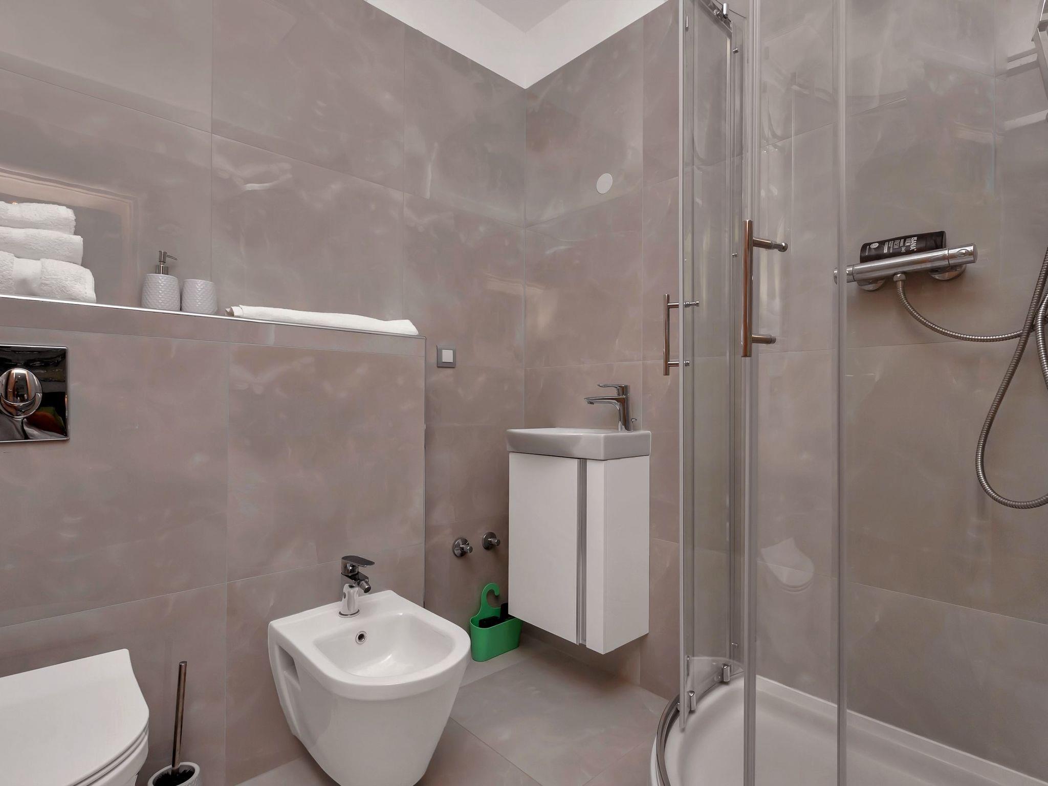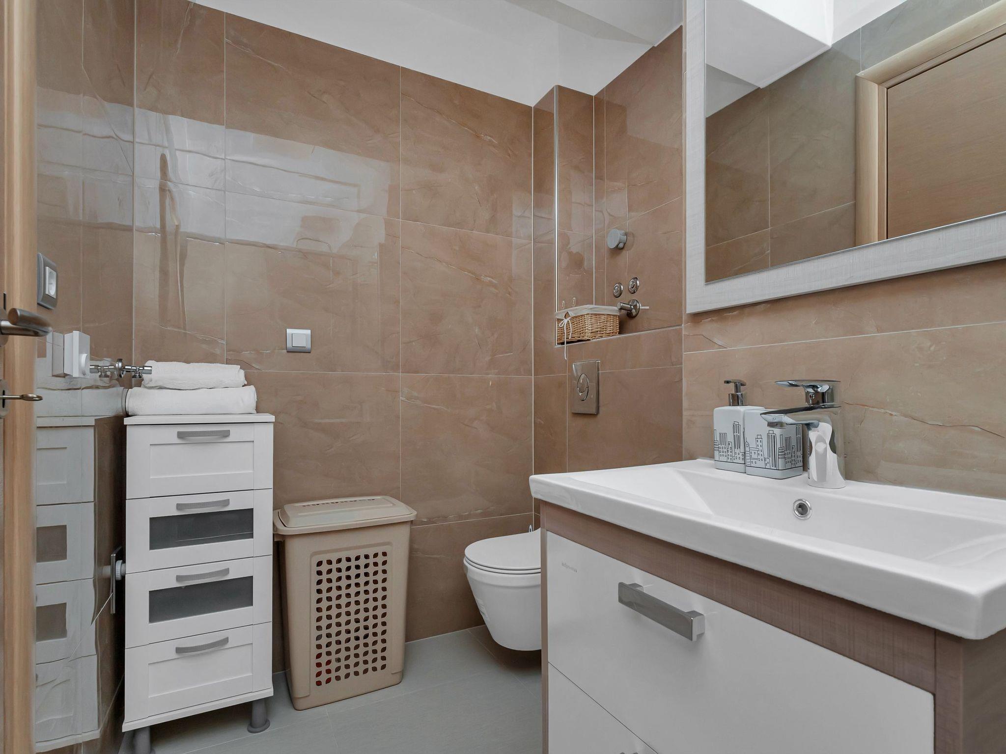 The house is fully air-conditioned, has underfloor heating and is divided into 3 units. On the ground floor there is a fitness room and lounge (sauna, billiards, table football, etc.) On the first floor there is a large flat (130m²) with a large living and dining area. The spacious kitchen is fully equipped (6 induction hobs, fridge-freezer, microwave, oven, dishwasher, dining table for 12 people). The living and dining area also has a seating area with a sofa bed for 2 people, TV and fireplace. On the same floor there are 2 additional bedrooms (each with a double bed) and 2 bathrooms. The staircase leads to the second floor, which is divided into two flats, one of which has a living and dining area with kitchen, a bedroom, a bathroom and a terrace with lake views. The other flat has a living and dining area with kitchen, as well as 2 bedrooms, a bathroom and two terraces with lake views.