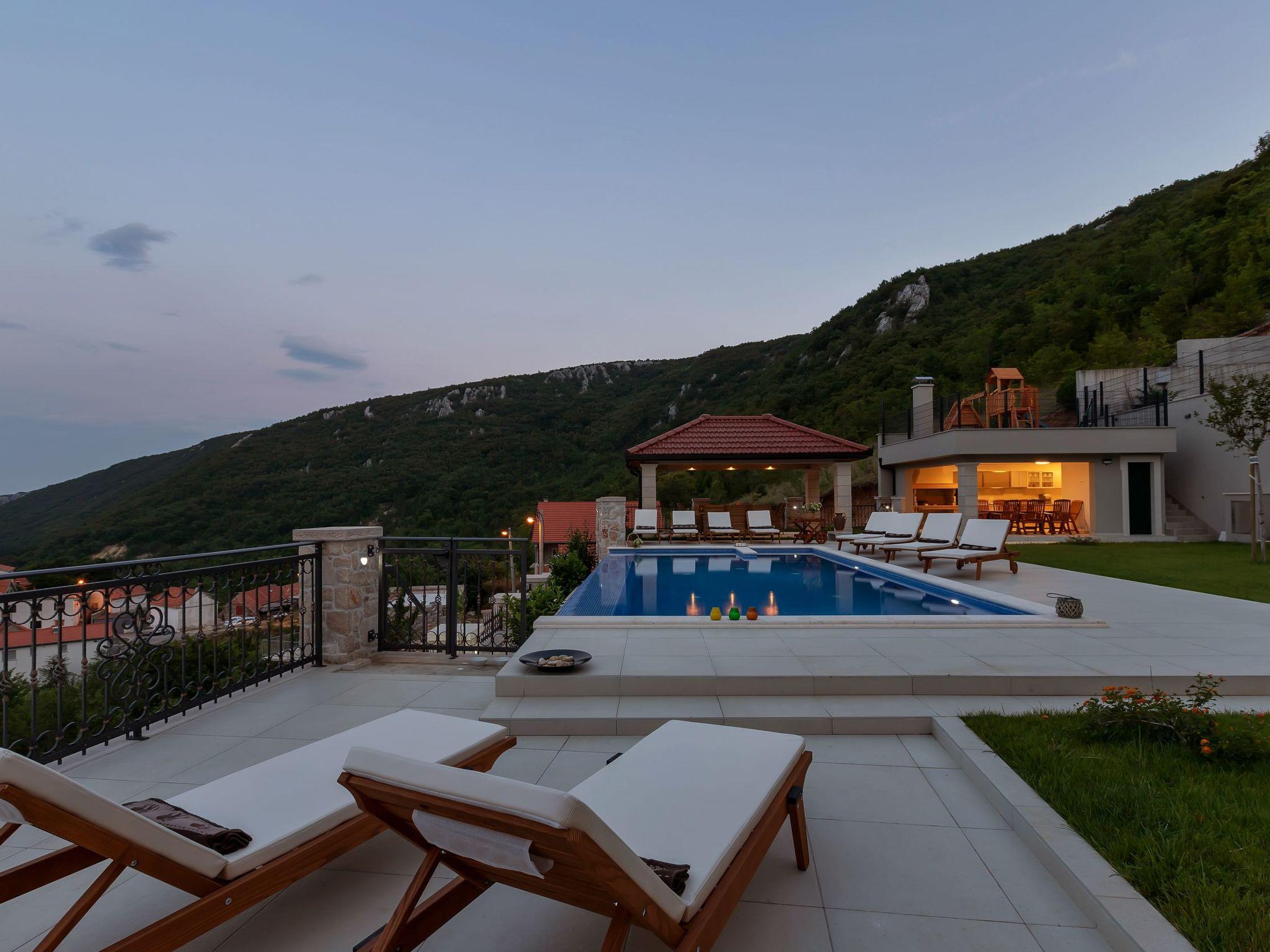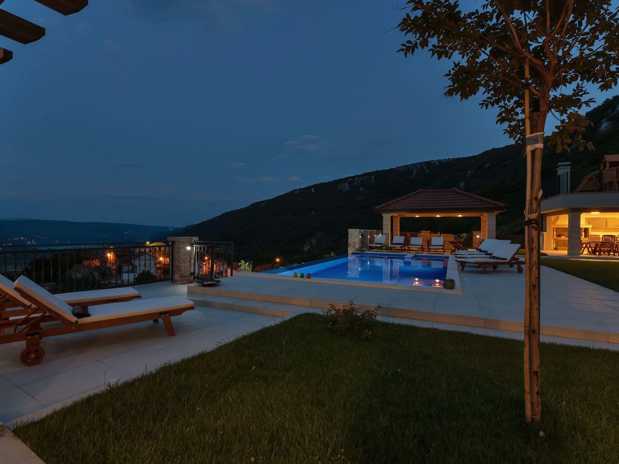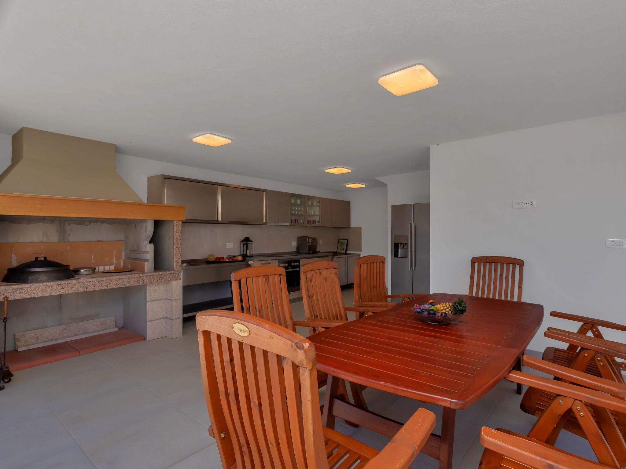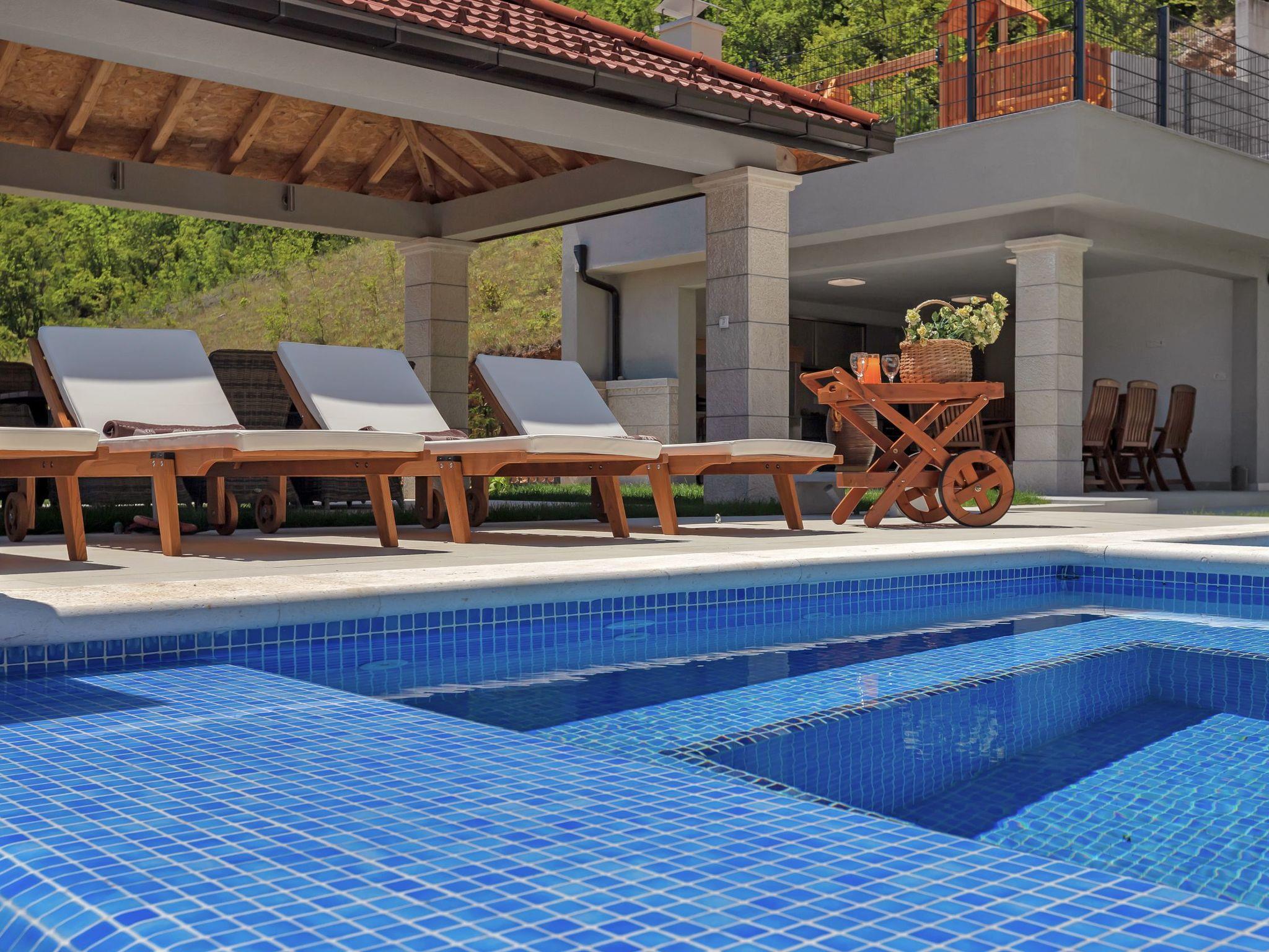 The outdoor area offers various lounge areas equipped with high-quality seating. There is also a fully equipped summer kitchen, a children's playground and much more. The infinity pool has an outdoor shower and a massage bench for 4 people. Sun loungers are set up around the pool and there is also a whirlpool for 7 people.