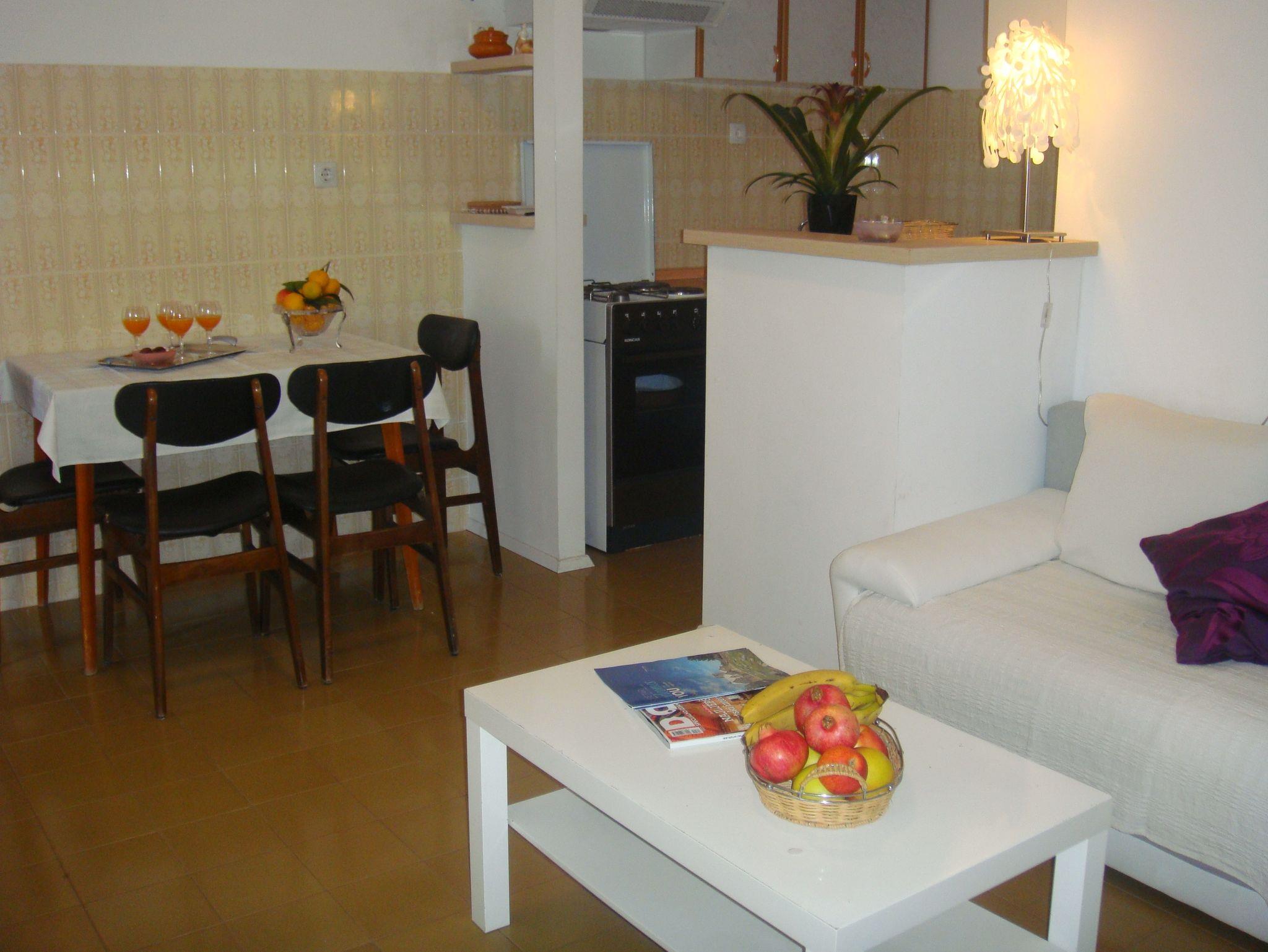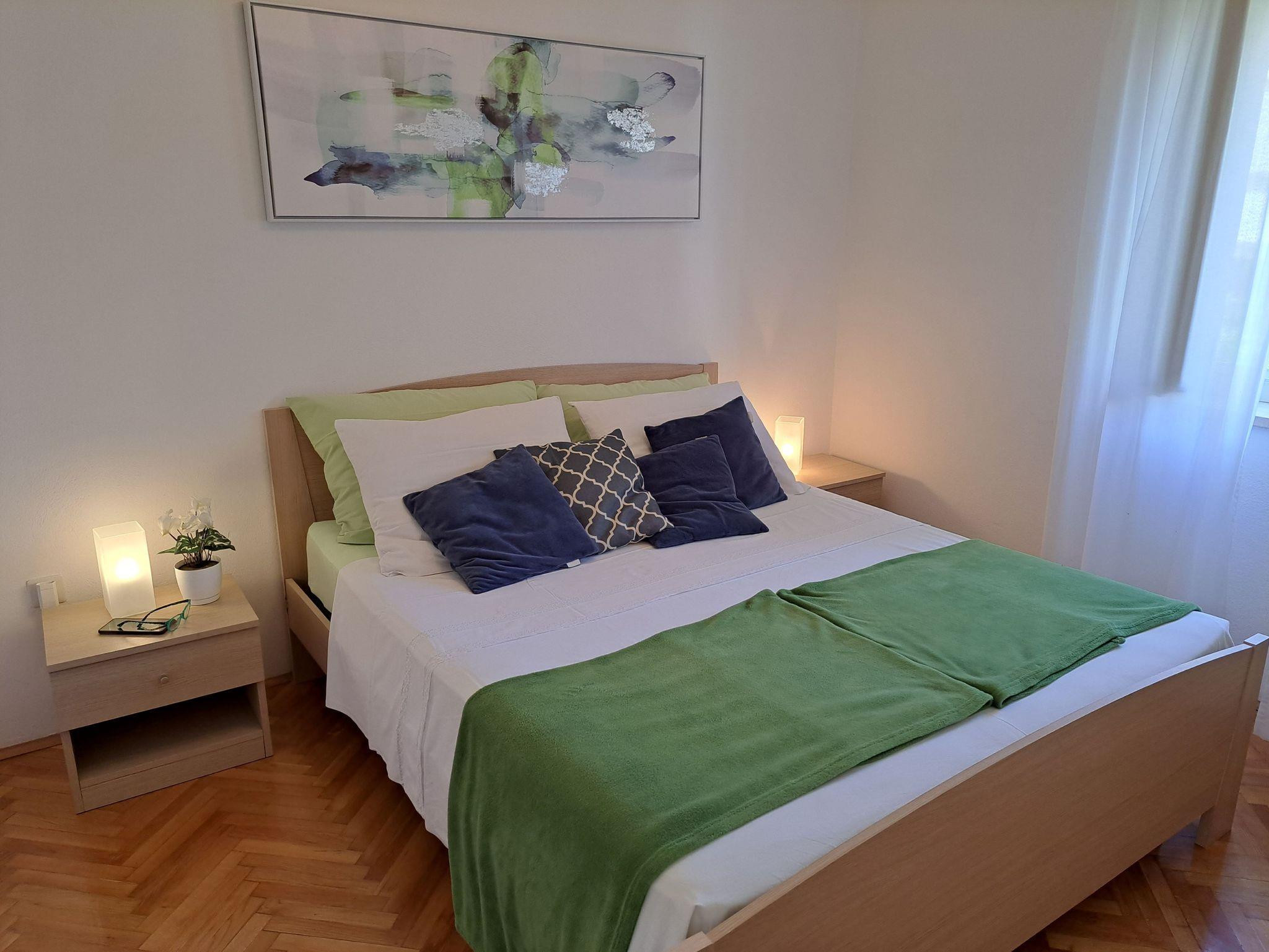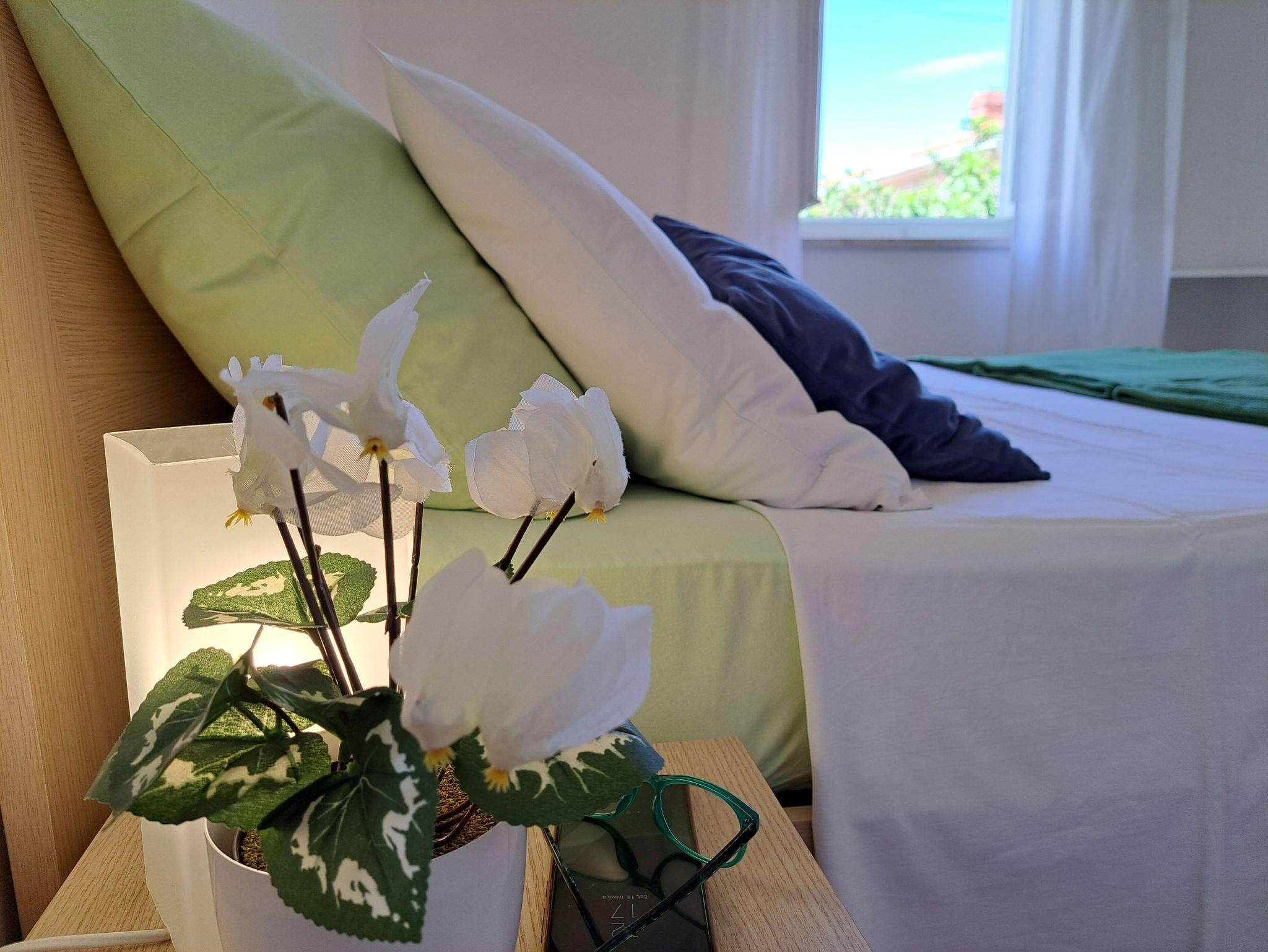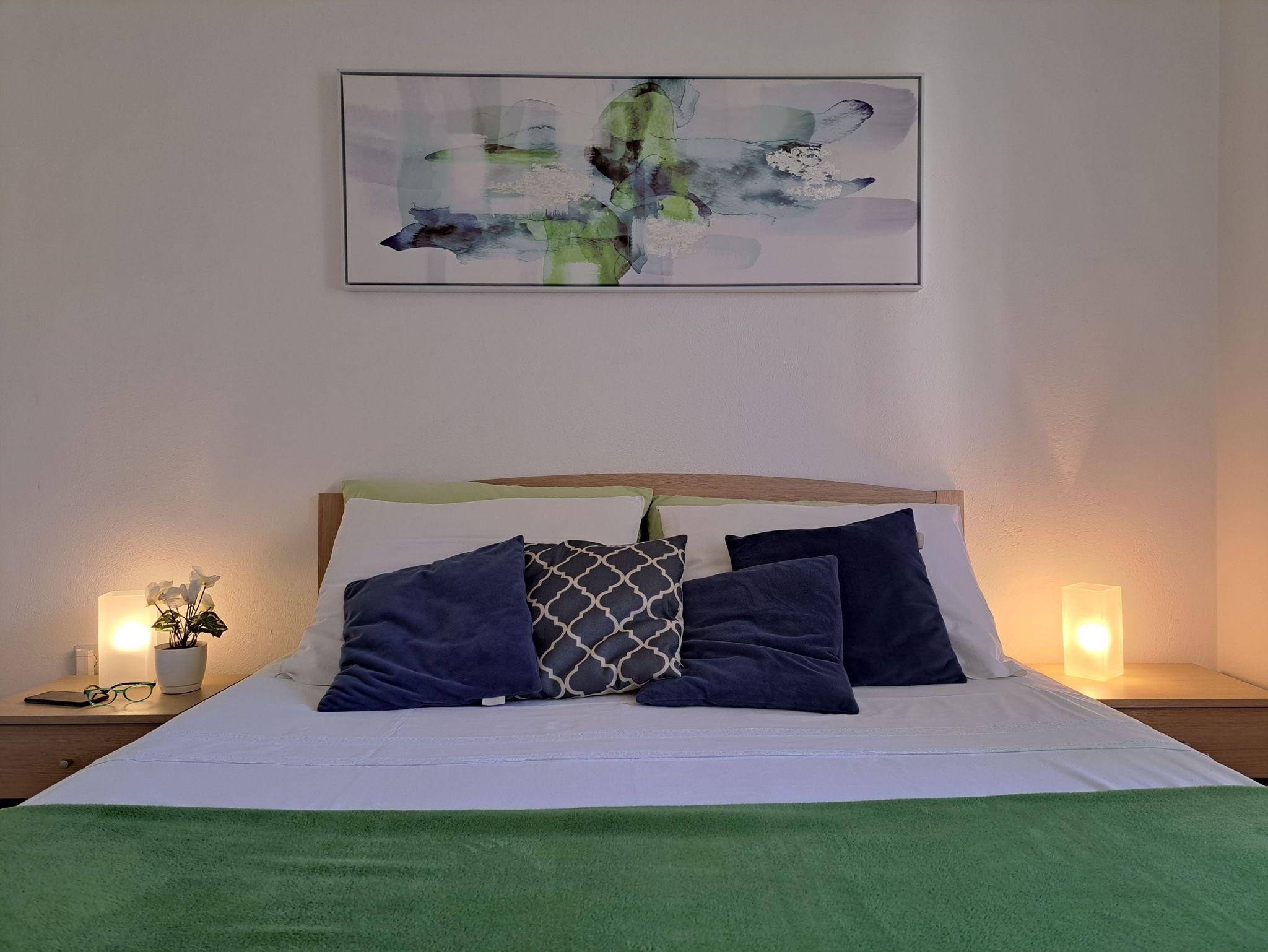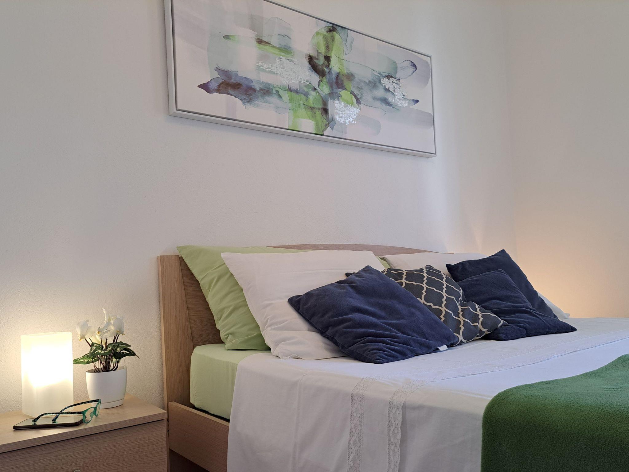 Ferienwohnung bietet Platz für 5 Gäste. Die Betten sind in Schlafzimmern, die es 2 gibt, und in Wohnzimmer, innerhalb einer Gesamtfläche von 45m2, angeordnet. Es ist erlaubt, Speisen auf dem Gemeinschafts-Grill vorzubereiten. Die reservierte Unterkunftseinheit verfügt über einen gemeinsame Terrasse. IM PREIS INBEGRIFFEN: Kurtaxe, Endreinigung, Klimatisierung, Parkplatz, Internet, Kinderbett, Bügeleisen, Bügelbrett, Föhn. VERBINDLICHE ZUSÄTZLICHE KOSTEN: Aufzahlung für Kurzaufenthalte (prozentualer Zuschlag pro Nächtigungsanzahl: 30% - 1, 20% - 2, 10% - 3). UNVERBINDLICHE ZUSÄTZLICHE KOSTEN: Zusatzbett (5,00 € pro Nacht). Die Verfügbarkeit zusätzlicher Dienstleistungen in Ihrem reservierten Termin und die Preise derselben (falls nicht aufgeführt) müssen im Voraus überprüft werden. Zusätzliche Dienstleistungen die in der Zahlungsaufforderung nicht aufgeführt sind werden direkt beim Vermieter bezahlt, angenommen der Gast nutzt auch diese. Ermäßigung auf den Grundpreis: Gratistag 14=13 (bei einem Aufenthalt von 14 Tagen oder mehr erhalten Sie einen Gratistag für den Aufenthalt bis 31.12.26).