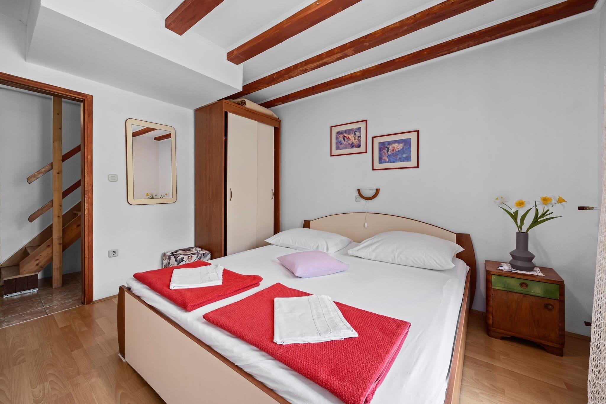 Denne indbydende to-værelses lejlighed, beliggende på anden sal, tilbyder en fantastisk havudsigt og et behageligt tilflugtssted for familier eller små grupper. Det har to rummelige soveværelser med store dobbeltsenge, en stue og et veludstyret køkken. Det andet soveværelse er placeret på et galleri og er perfekt til to børn (op til 15 år) efter anmodning og mod ekstra gebyrer. En privat balkon er ideel til at nyde din morgenkaffe eller morgenmad, mens du nyder den friske sommerbrise. Gæsterne har også adgang til en fælles grill i haven og gratis privat parkering på stedet. Lejligheden er beliggende i Supetarska Draga, et fredeligt område omgivet af ubeboede øer, hvilket gør den perfekt for naturelskere og dem, der søger en rolig ferie. Den nærmeste sandstrand ligger kun 400 meter væk, og regionen er kendt for nautisk turisme. Historieentusiaster vil sætte pris på benediktinerklosteret på øen, som giver et indblik i fortiden. Supetarska Draga er et paradis for afslapning med sin naturlige skønhed, der tilbyder masser af muligheder for at udforske solen, havet og sandet. Ud over de vigtigste faciliteter er lejligheden udstyret med et køkken med køleskab, mikroovn, ovn, fryser, kaffemaskine og andet vigtigt køkkenudstyr. Et badeværelse med bruser og hårtørrer sikrer komfort under dit ophold. Andre faciliteter omfatter aircondition, gratis trådløs internetadgang, tv med satellitkanaler og havemøbler. Gæster bedes respektere stille tider fra kl. 23.00 til 07.00, med rygning kun tilladt udenfor.