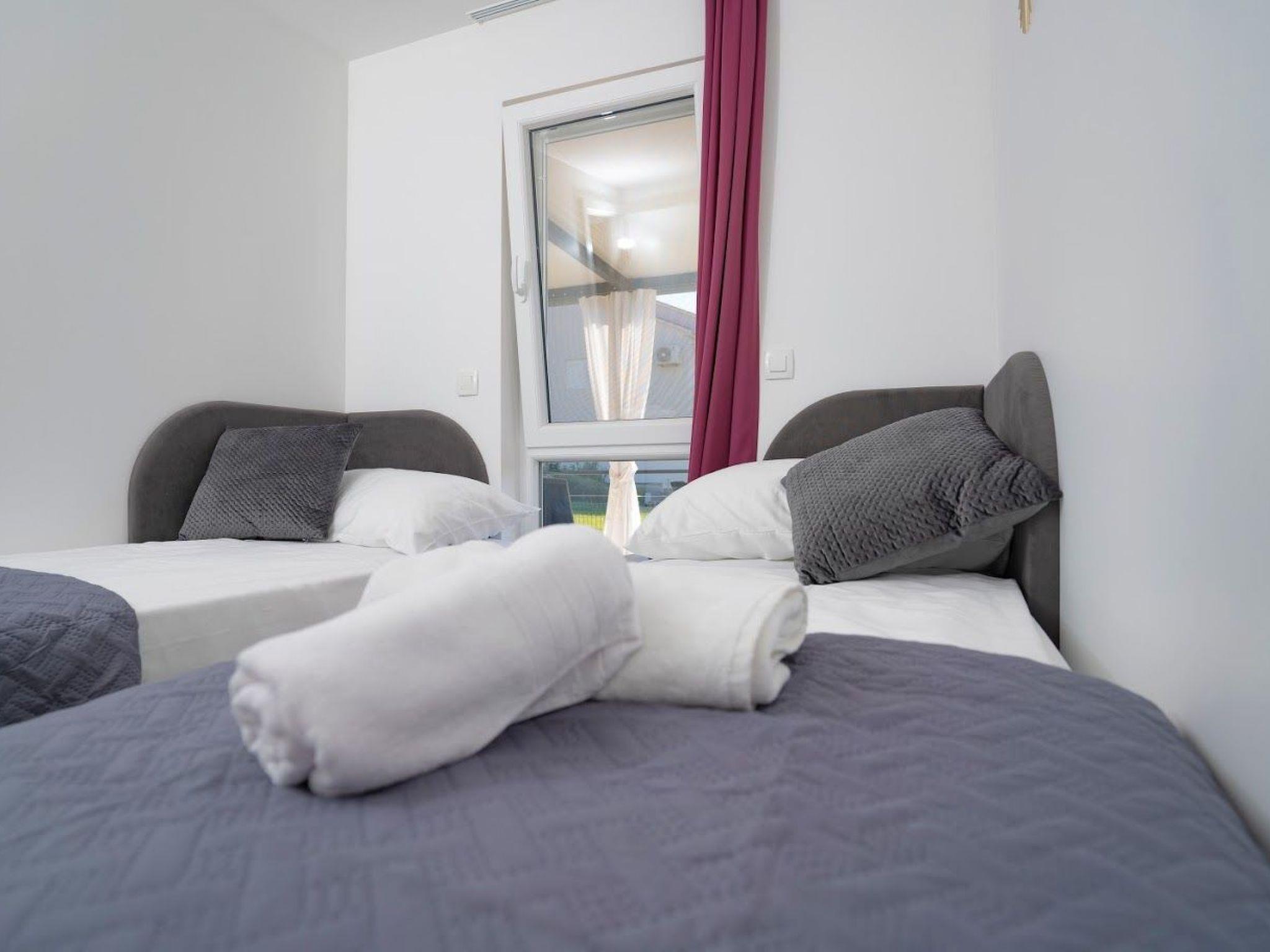 On entering the mobile home, you'll find it well-appointed with all the amenities needed for a relaxing stay. The interior boasts two cozy bedrooms - one with a comfortable double bed measuring 160x200 and the other with two single beds of 90x200, making it suitable for families or a group of friends. Each bedroom is complemented by its own bathroom, equipped with a shower, ensuring privacy and convenience for all guests. The living/dining area features a sofa that doubles as an additional bed for two, perfect for lounging during the day or accommodating extra guests at night. The kitchen is fully equipped with a dishwasher, electric stove, fridge, and freezer compartment, catering to all your culinary needs. For entertainment and comfort, the mobile home offers a TV, Wi-Fi, and air conditioning throughout, ensuring a pleasant living environment regardless of the weather outside.