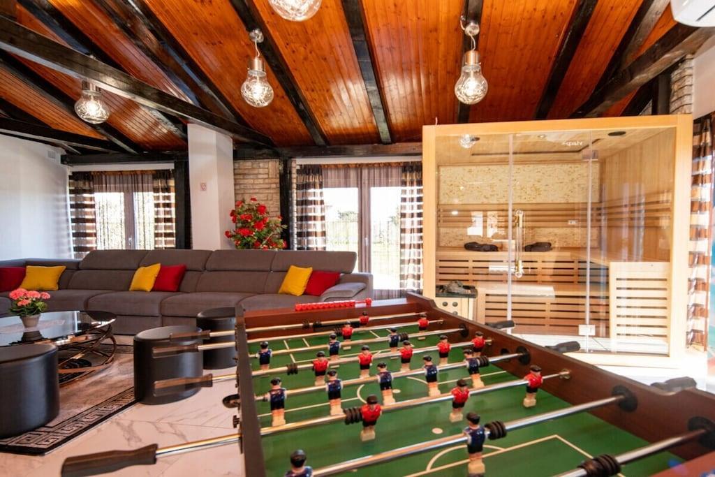 Die schön gestaltete Einrichtung bietet 8 klimatisierte Schlafzimmer mit 8 Badezimmern. Es gibt auch eine Gemeinschaftsküche und ein gemütliches Wohnzimmer mit vielen Möglichkeiten für Unterhaltung und Entspannung. Für zusätzlichen Komfort gibt es eine finnische Sauna, einen beheizten Pool und Jacuzzi und eine schöne Sonnenterrasse. Für die kleinsten Gäste gibt es ein 9 m² großes Kinderbecken, aber auch andere Einrichtungen für Kinder sind vorhanden. Außerdem stehen 8 Fahrräder zur Verfügung und der Ort selbst verfügt über gut ausgebaute Radwege. Nur 200 Meter vom Haus entfernt befindet sich ein Kieselstrand.