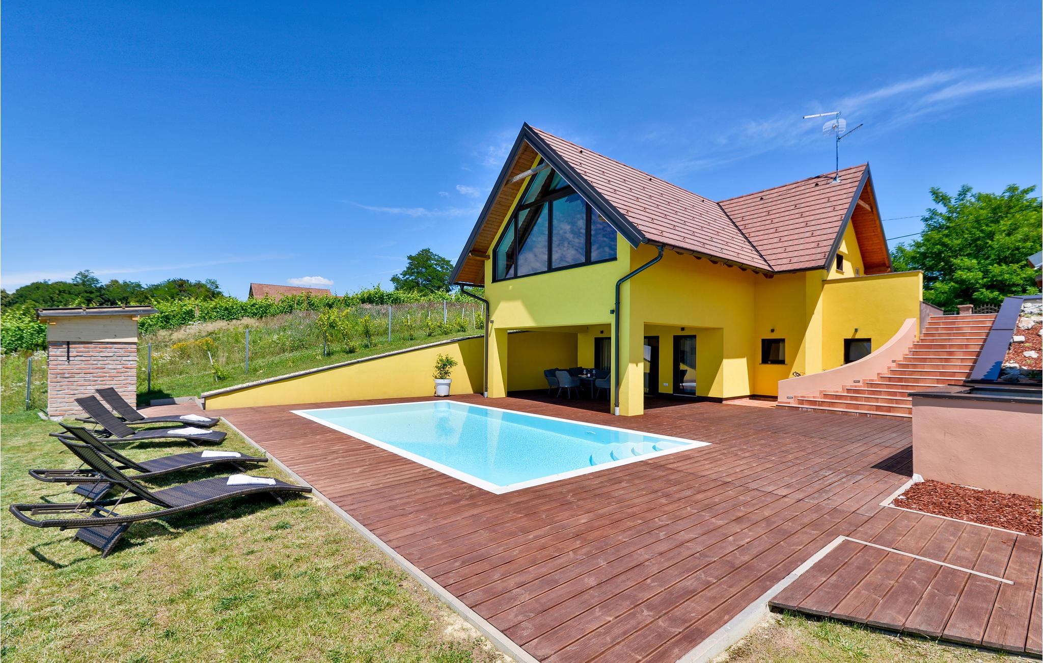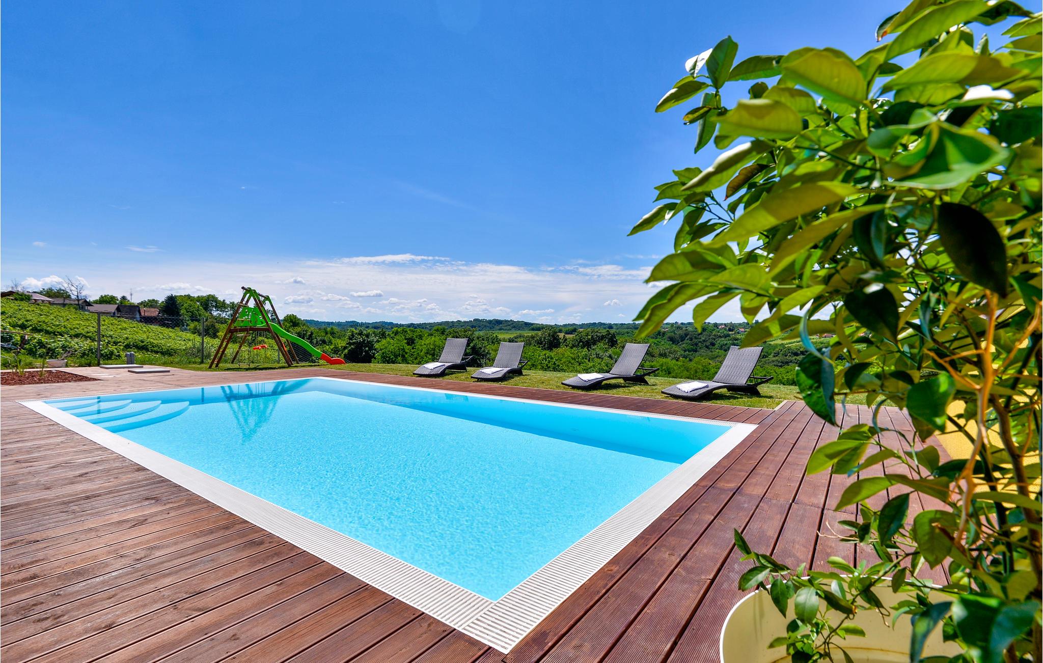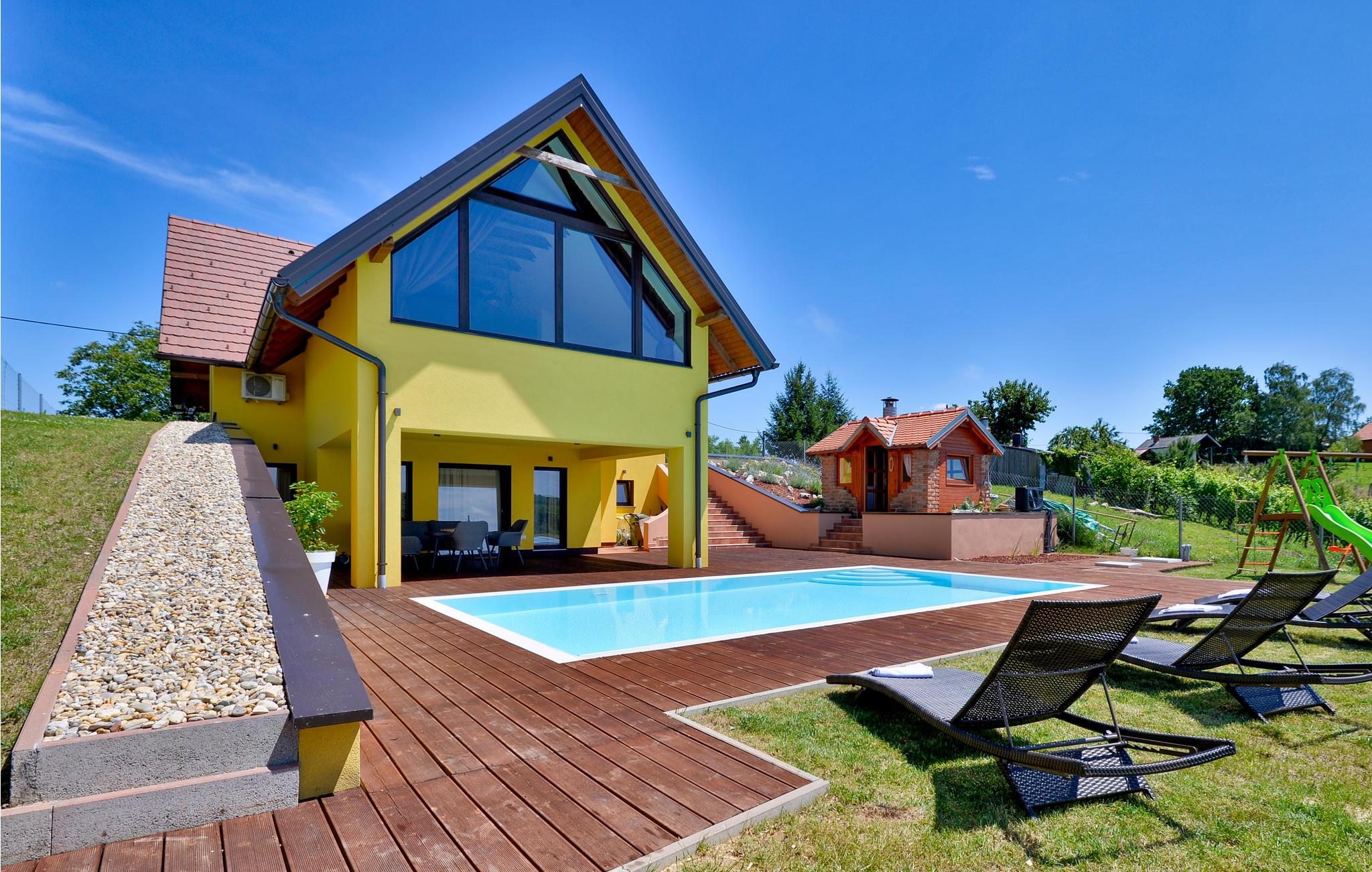 I nærheden af Sveri Martin na Muri's termalbade ligger dette feriehus. Det er smagfuldt indrettet og indeholder alt til en dejlig ferie. Huset er i 2 etager: Stueplan med åbent køkken, opholdsstue og spiseplads samt et toilet. Førstesalen har 2 soveværelser samt et badeværelse. I det ene soveværelse findes en sauna og et hydromassage badekar, der byder på afslapning for både krop og sjæl. Nyd at lave mad og spise udendørs ved sommerkøkkenet. Foran huset ligger den opvarmede swimmingpool med tilhørende solterrasse og liggestole.
