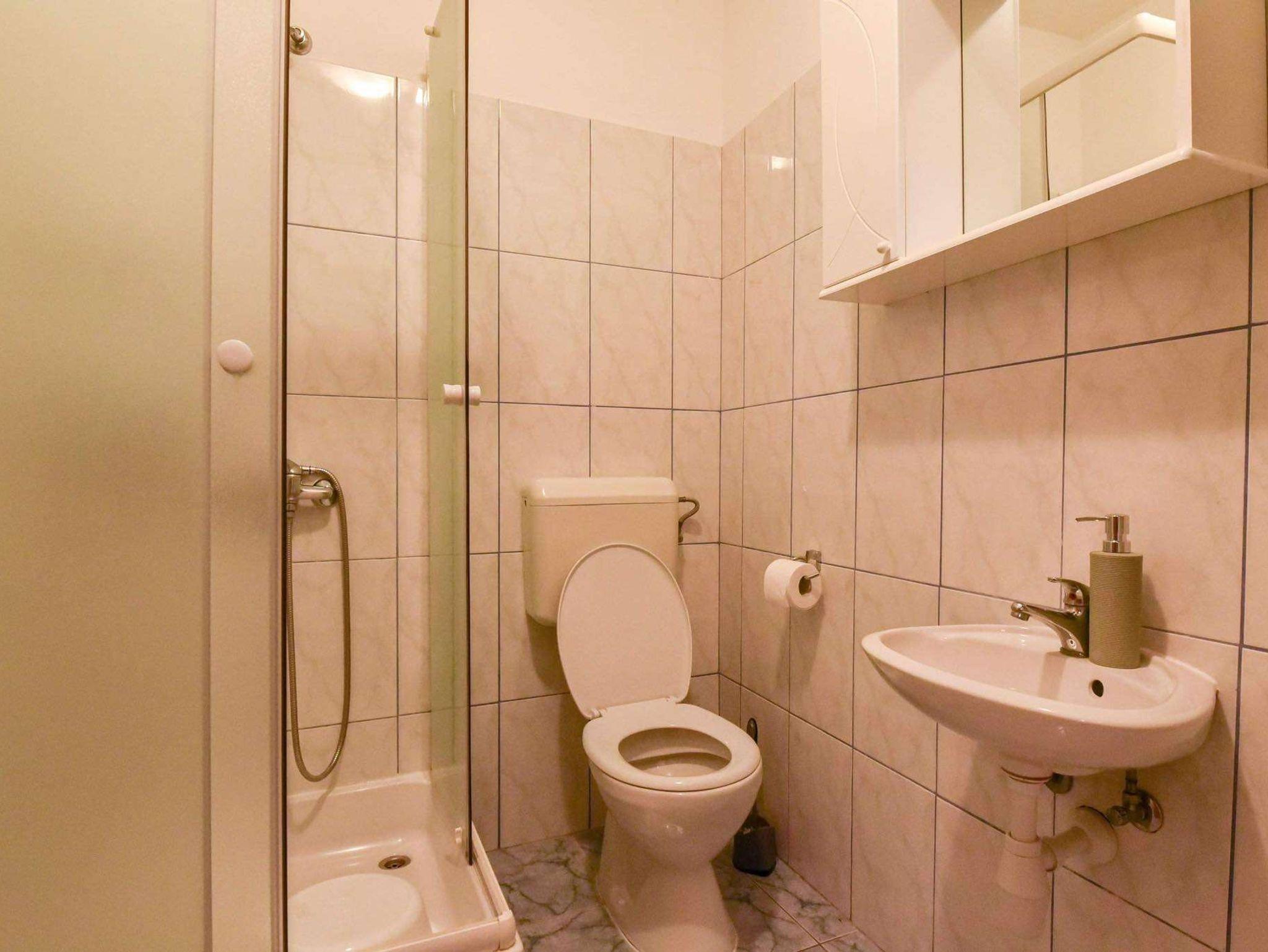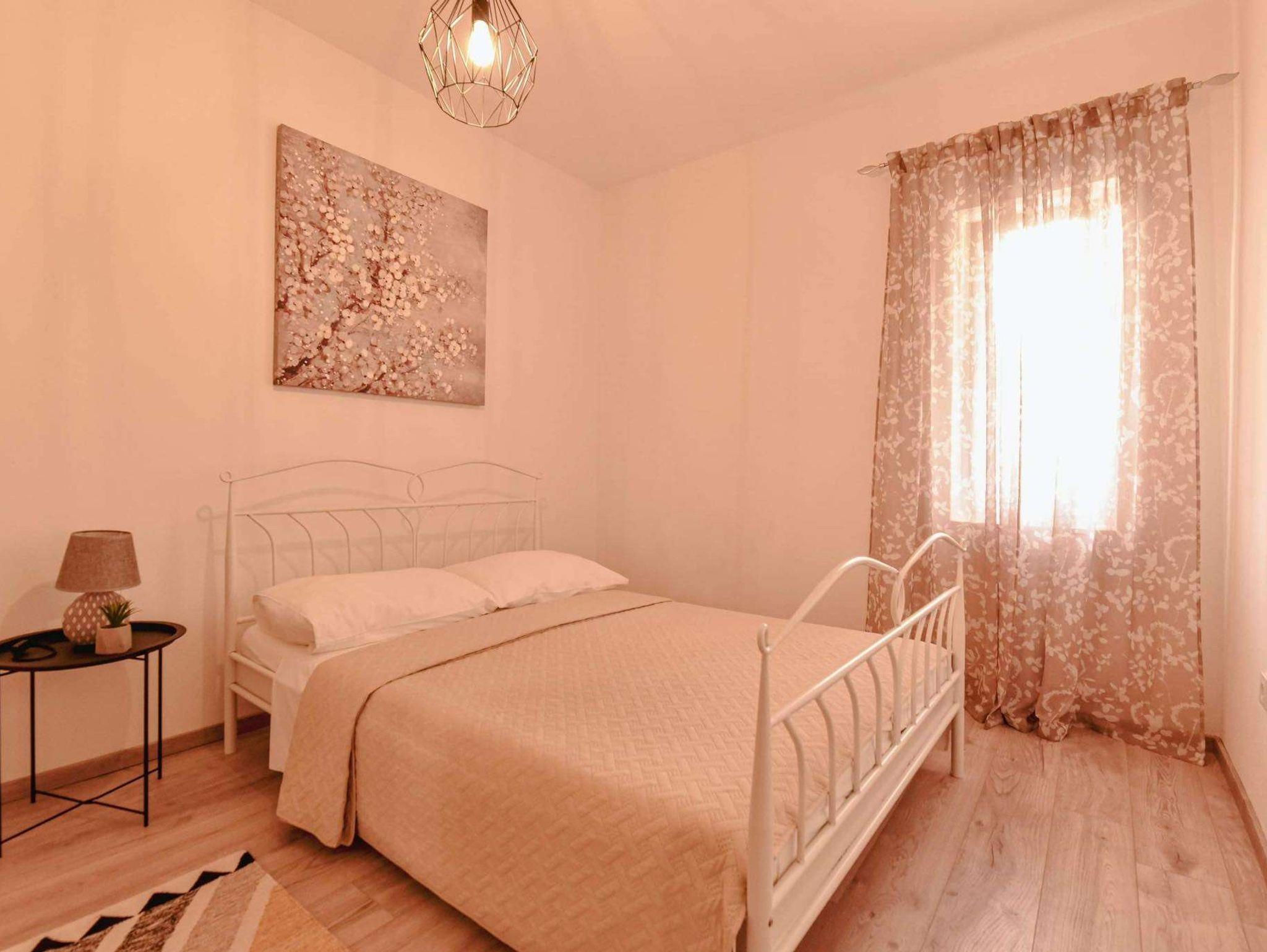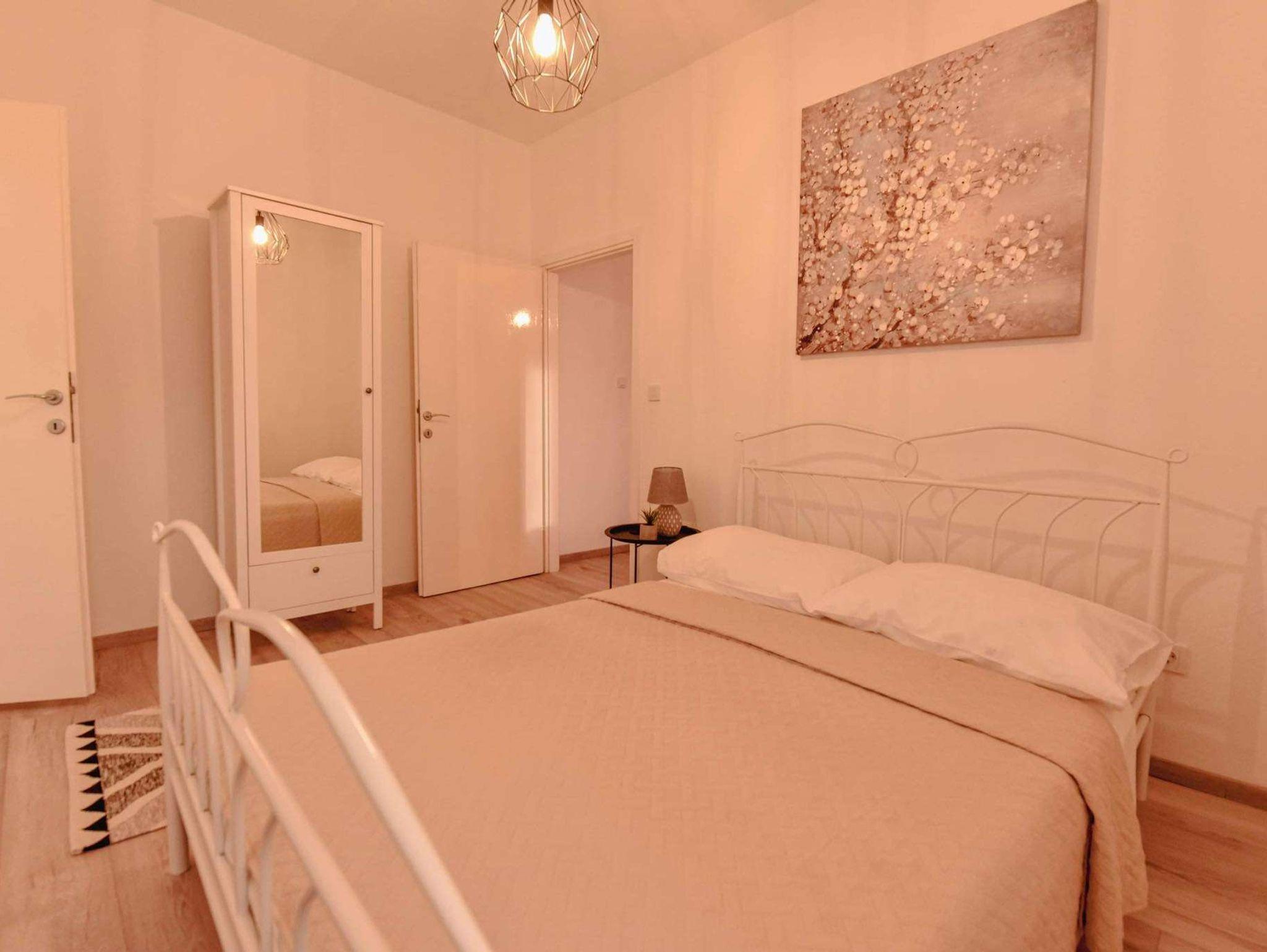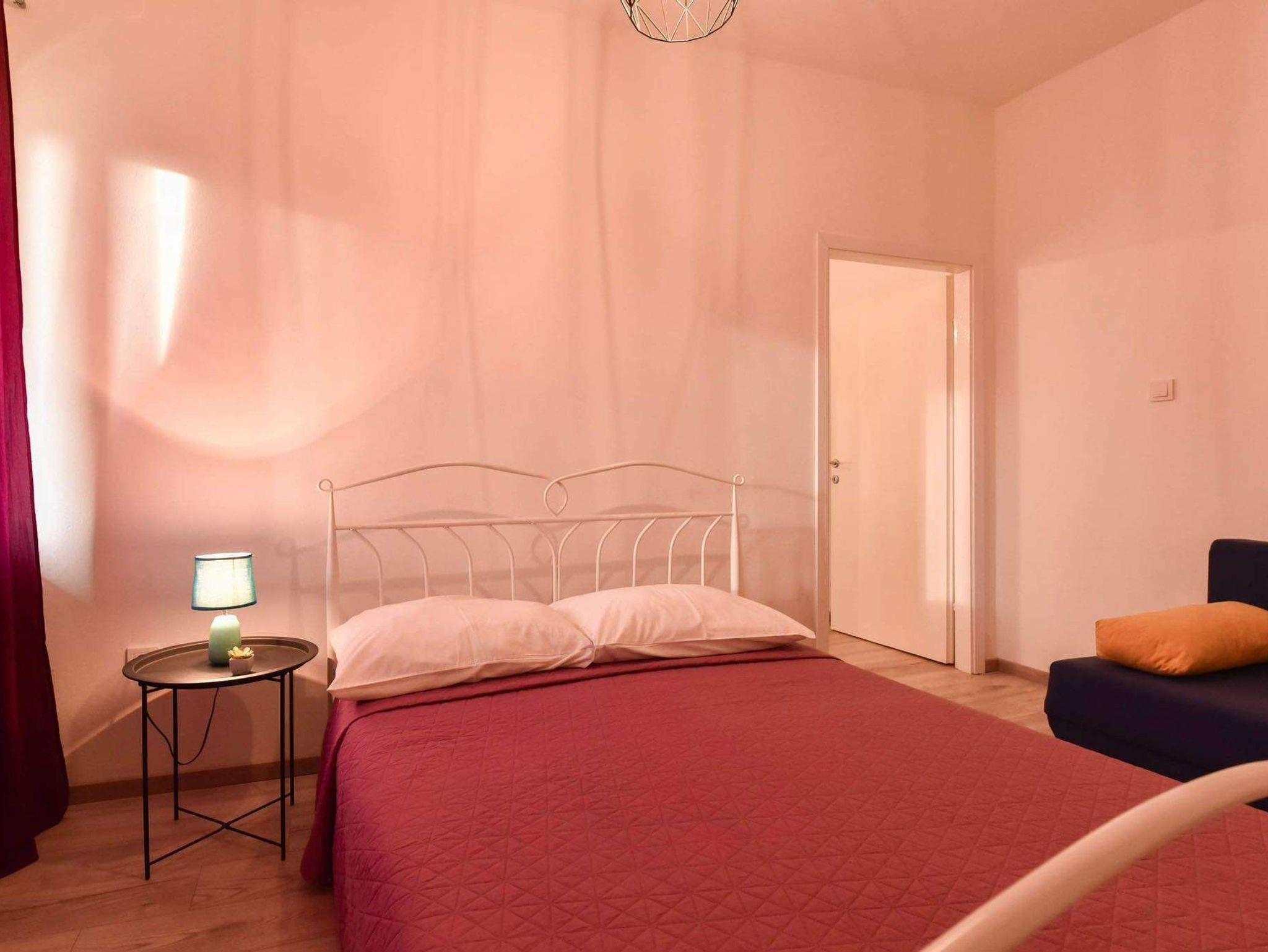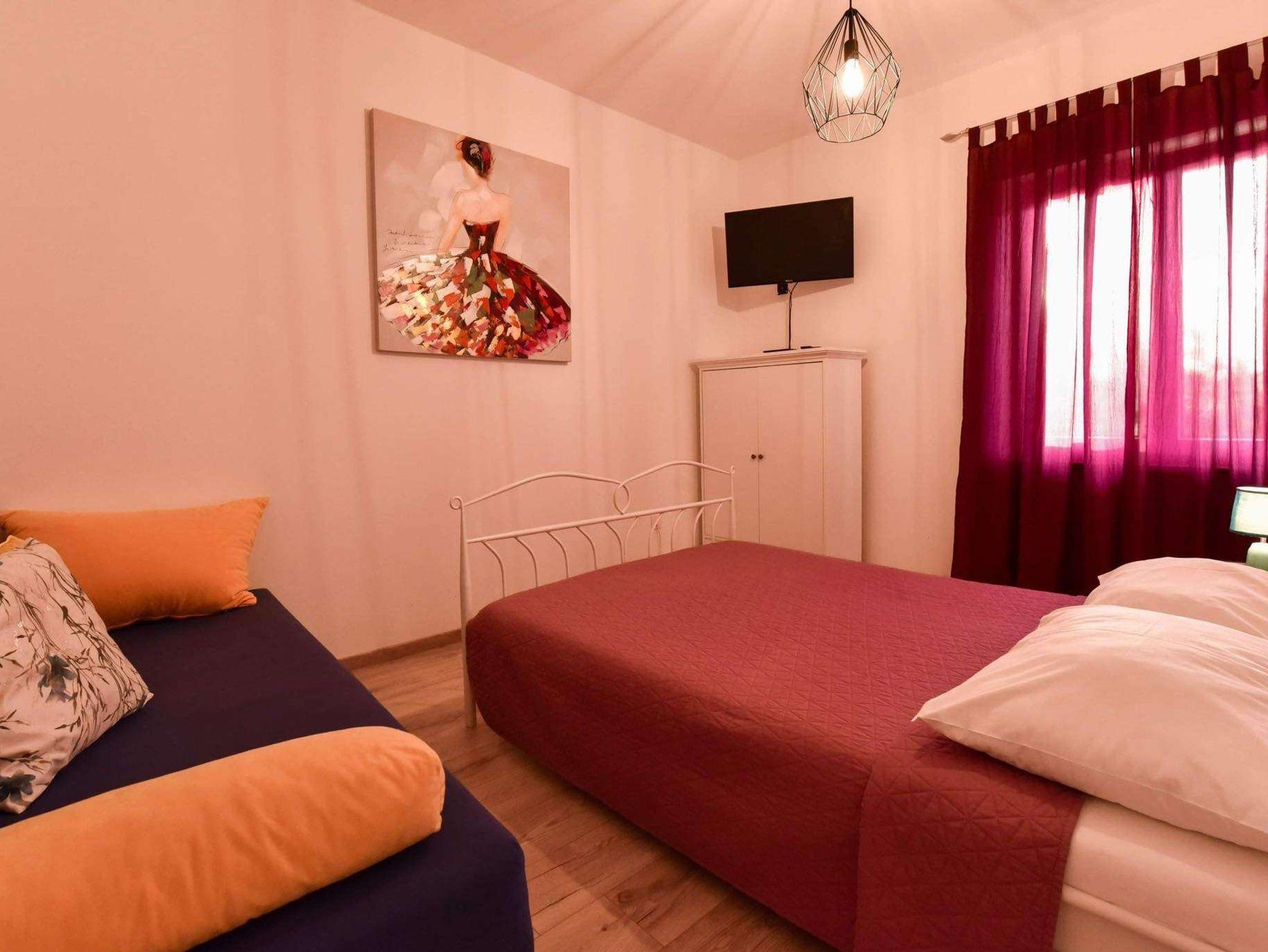 Ferienwohnung bietet Platz für 5 Gäste. Die Betten sind in Schlafzimmern, die es 2 gibt, innerhalb einer Gesamtfläche von 39m2, angeordnet. Die Gäste haben eine eigene Terrasse zur Verfügung, auf der sie in warmen Sommernächten genießen können. Es ist erlaubt, Speisen auf dem Gemeinschafts-Grill vorzubereiten. IM PREIS INBEGRIFFEN: Kurtaxe, Endreinigung, Klimatisierung, Parkplatz, Internet, Kinderbett, Bügeleisen, Bügelbrett. VERBINDLICHE ZUSÄTZLICHE KOSTEN: Aufzahlung für Kurzaufenthalte (prozentualer Zuschlag pro Nächtigungsanzahl: 30% - 1, 20% - 2, 10% - 3). Die Verfügbarkeit zusätzlicher Dienstleistungen in Ihrem reservierten Termin und die Preise derselben (falls nicht aufgeführt) müssen im Voraus überprüft werden. Zusätzliche Dienstleistungen die in der Zahlungsaufforderung nicht aufgeführt sind werden direkt beim Vermieter bezahlt, angenommen der Gast nutzt auch diese. Ermäßigung auf den Grundpreis: Gratistag 14=13 (bei einem Aufenthalt von 14 Tagen oder mehr erhalten Sie einen Gratistag für den Aufenthalt bis 31.12.26).