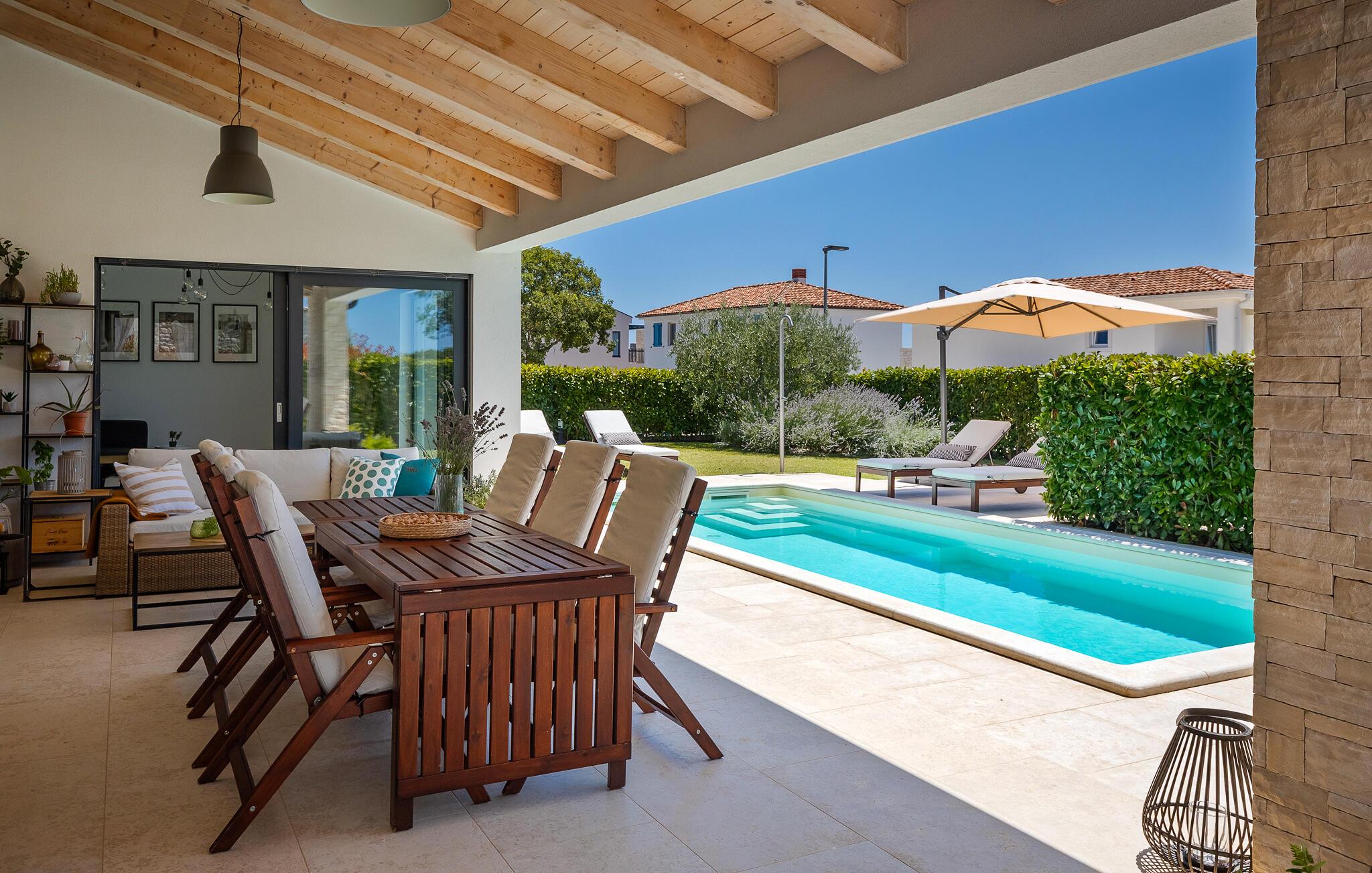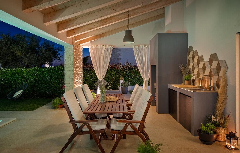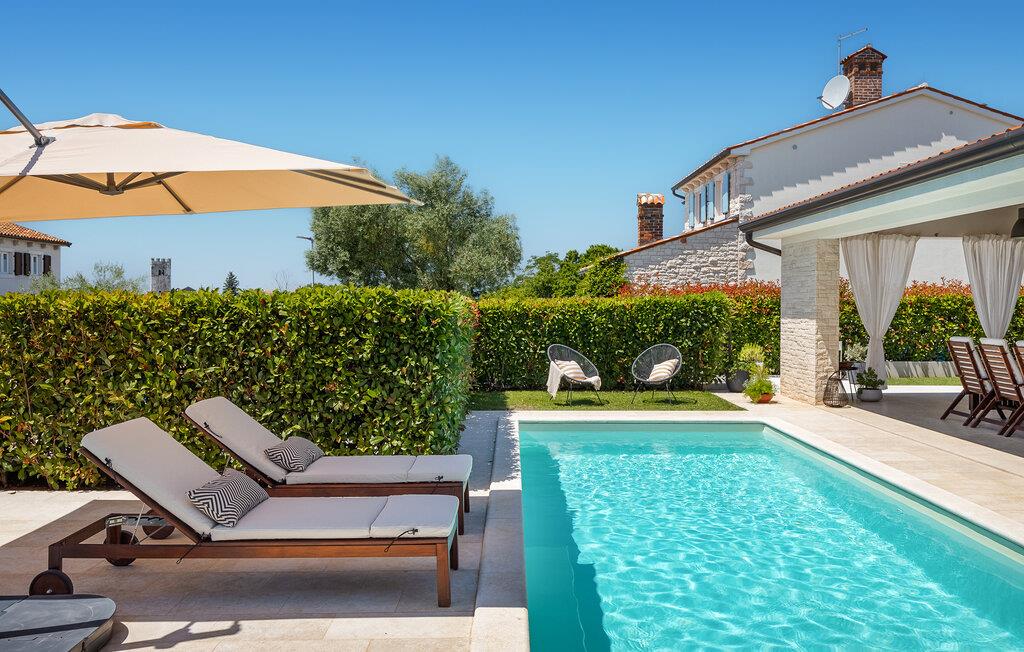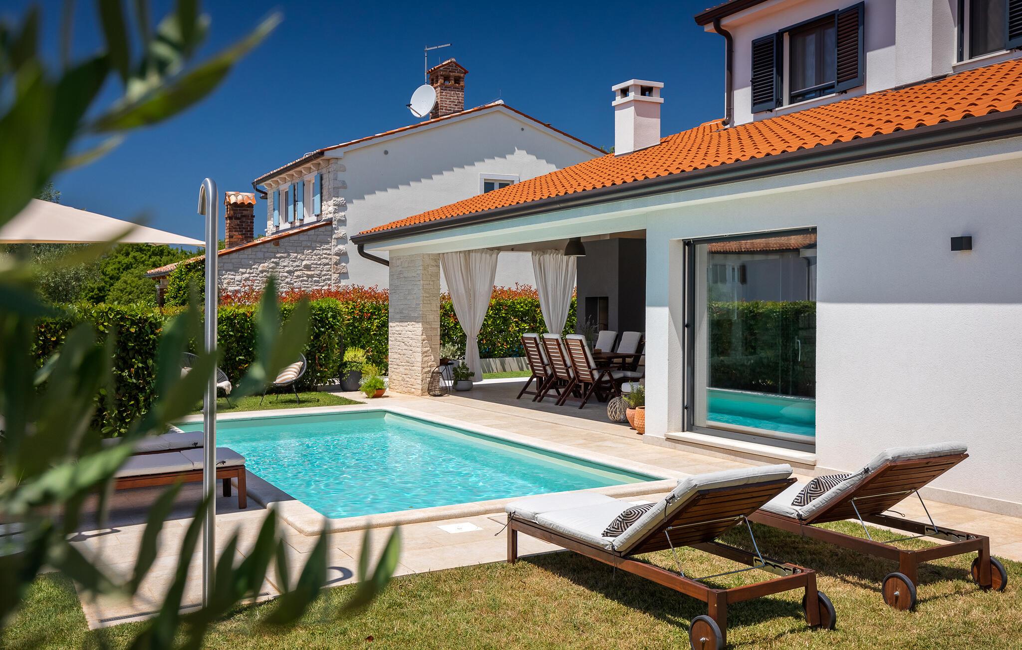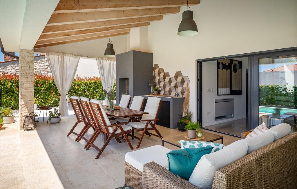 Im Außenbereich befindet sich die überdachte Terrasse. Hier können Sie auch alle köstlichen Speisen und Ihre Lieblingsgetränke genießen. Es gibt auch einen privaten Pool, an dem Sie bequem auf Liegestühlen sitzen und den Blick auf das Grün genießen können, das die Villa umgibt. Mit seinem liebevoll dekorierten Interieur und dem privaten Pool mit Blick auf die Altstadt, ermöglicht diese Villa einen wirklich erholsamen und entspannten Urlaub in Istrien.Die Villa befindet sich in einer der am besten erhaltenen mittelalterlichen Festungsstädte Istriens - dem pittoresken Sveti Lovrec. In seinen gewundenen Gässchen finden Sie gemütliche Bars und Restaurants, eine Post, Lebensmittelgeschäft und Arztpraxis. Herrliche Strände sind ebenfalls nur wenige Fahrminuten weg, die nächsten rund um das charmante Fischerdorf Vrsar (9 km). Die nahegelegene wichtigste regionale Straße macht zudem auch alle berühmtesten historischen Städte Istriens, wie Porec (15 km), Rovinj (20 km) und Pula (40 km), leicht erreichbar. Abenteuersuchende sollten auf jeden Fall die Pferderanch im benachbarten Dorf Jakici besuchen, sowie ausgezeichnete Kletterstellen in der spektakulären Lim Bucht. Das Hinterland ist von Olivenhainen bedeckt, welche hervorragendes, jetzt schon weltbekanntes Olivenöl herstellen.