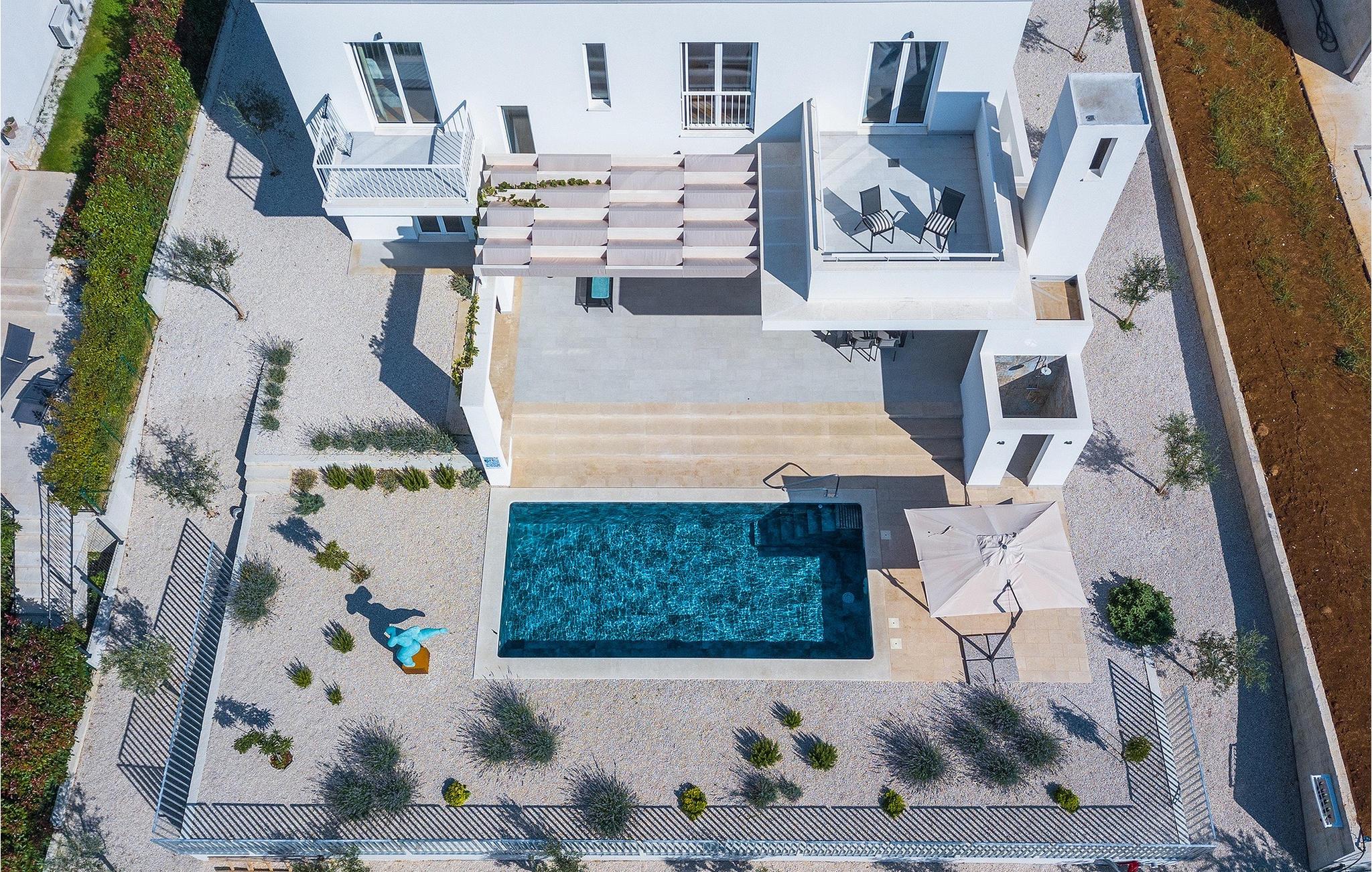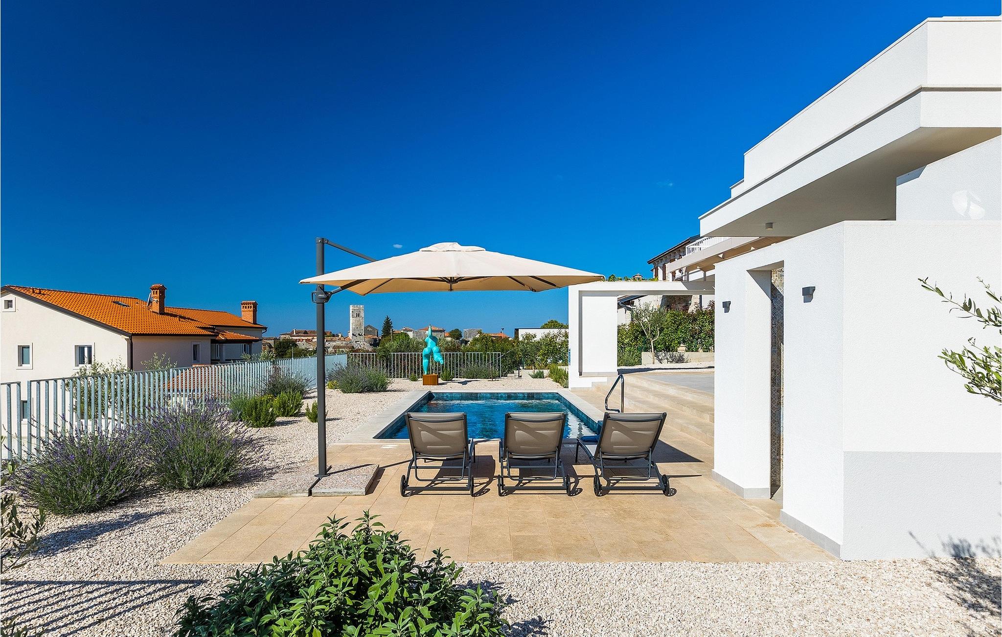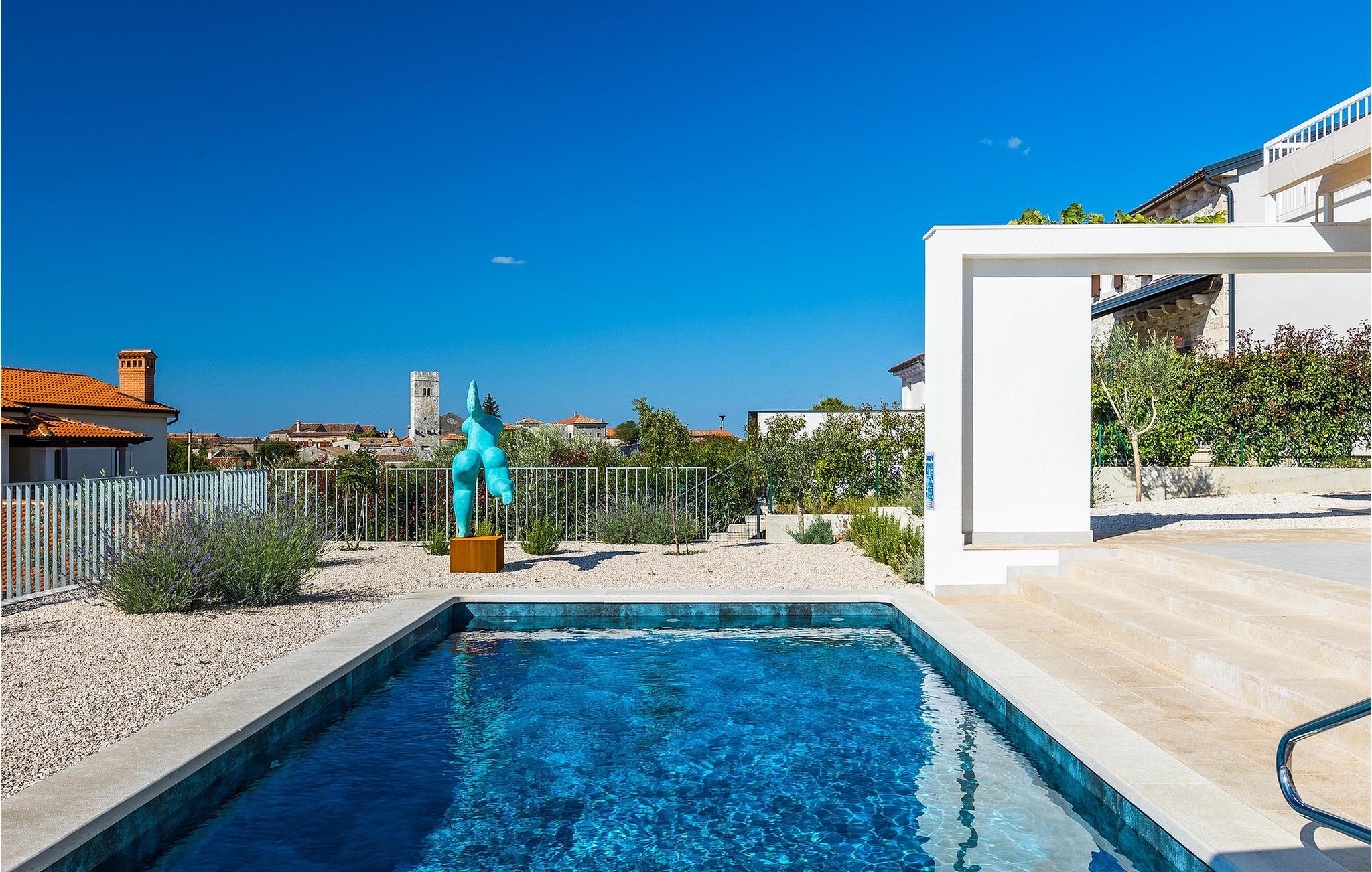 Den smukke terrasse har en pool med modstrømsanlæg. Det er det perfekte sted at bade, slappe af i en liggestol eller ligge i skyggen af ??parasollerne. Det veludstyrede udendørs køkkenområde er velegnet til familiegrill om aftenen. Terrassen er også kendetegnet ved en fantastisk skulptur, der forestiller kvindefiguren, et kunstværk af en af ??de vigtigste kroatiske billedhuggere i dag. Villaen ligger i middelalderbyen Sveti Lovrec i det centrale Istrien. Den maleriske lille by er kendetegnet ved sine smalle, snoede gader og stenhuse, hvor man kan spise i den lokale restaurant om aftenen og så gå en tur.