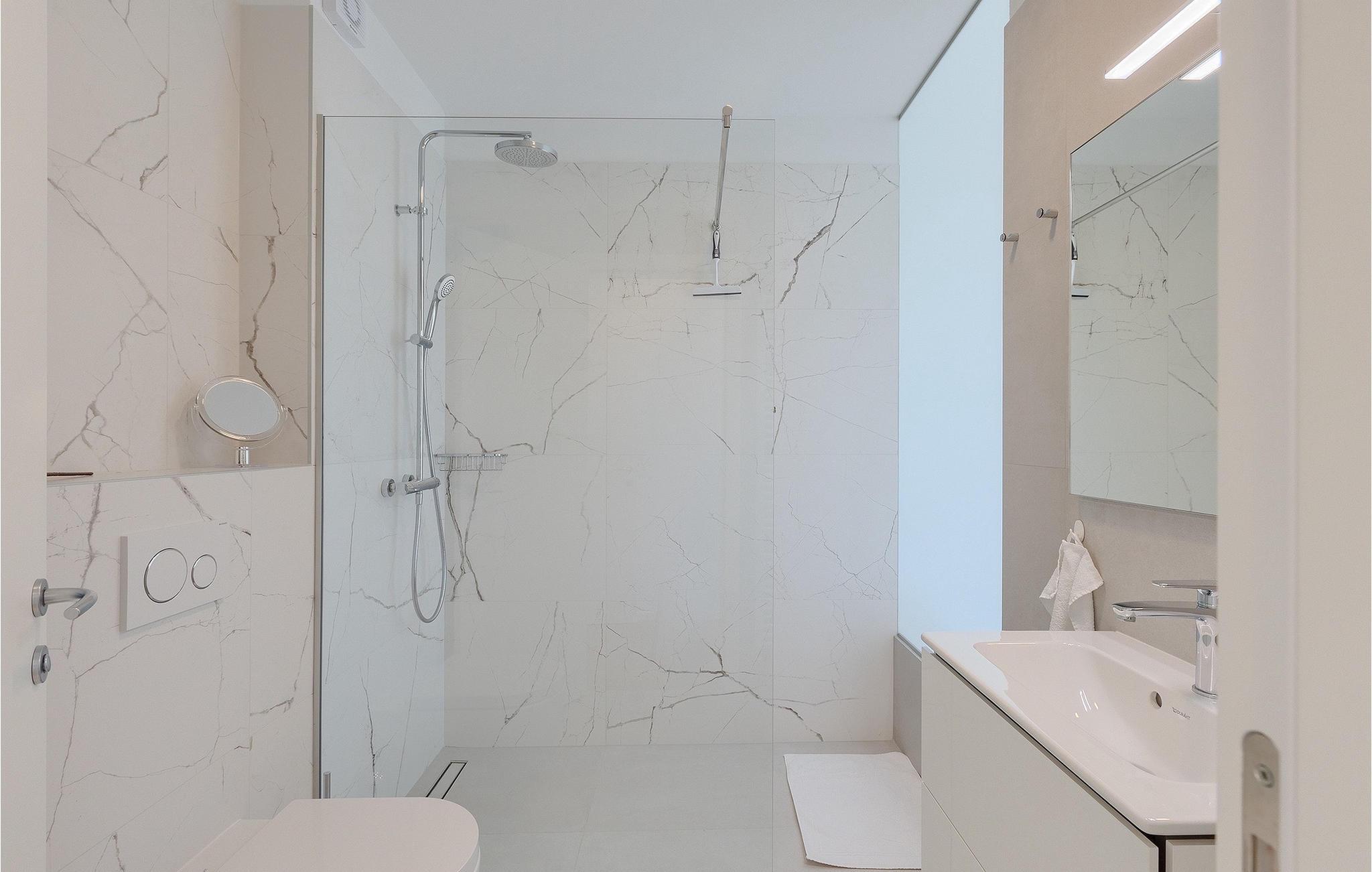 De øvrige tre soveværelser, hver med eget badeværelse med bruser, er på første sal. Et af dobbeltværelserne har udgang til den øverste terrasse, det andet dobbeltværelse har udgang til altanen og det tredje soveværelse har fransk dør. Alle tre værelser har en smuk panoramaudsigt over den charmerende by Sveti Lovrec og dens storslåede omgivelser. Et veludstyret vaskerum er ligeledes placeret på denne etage.