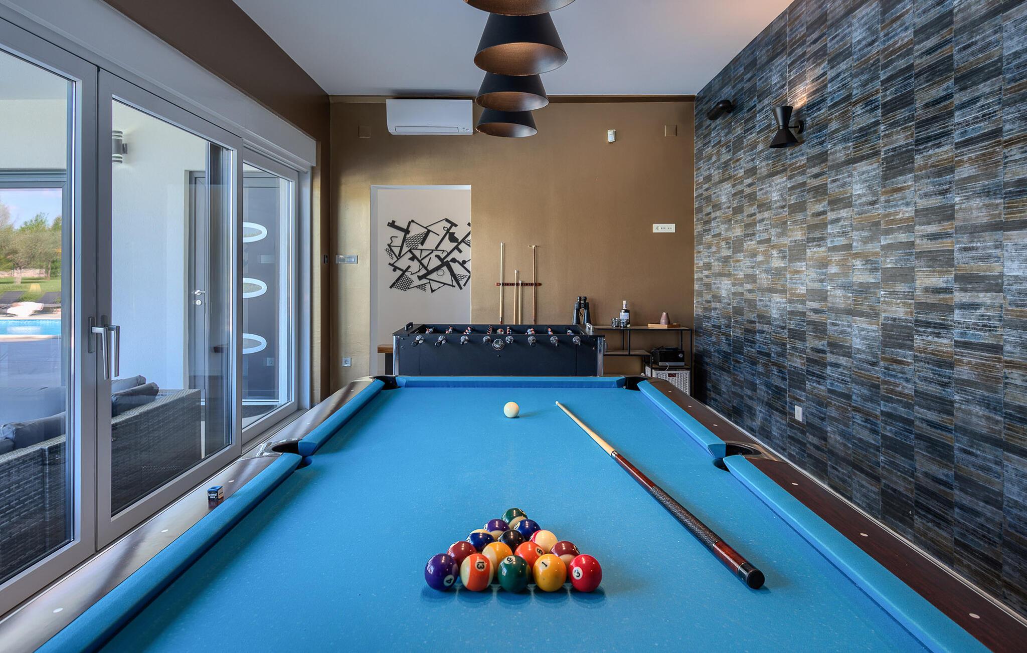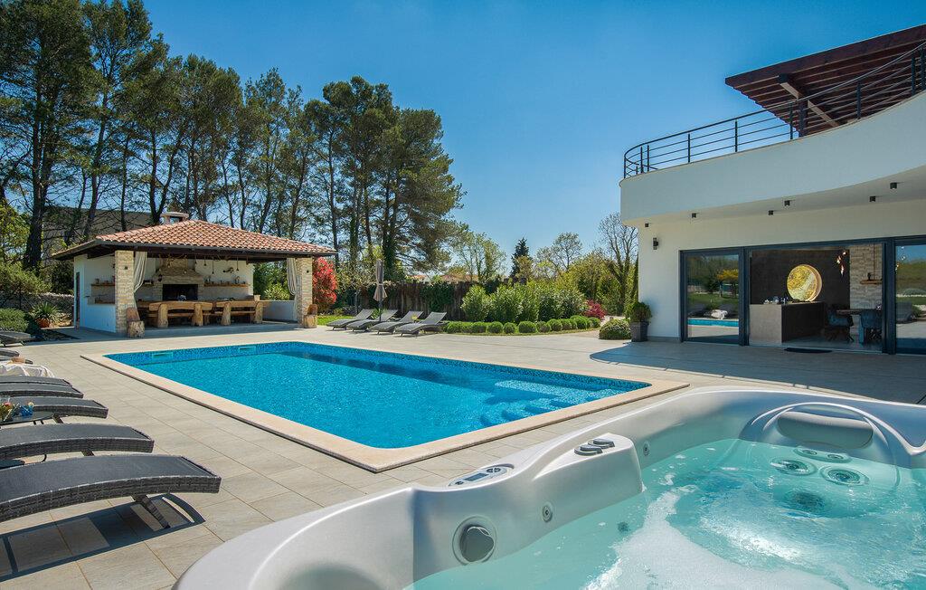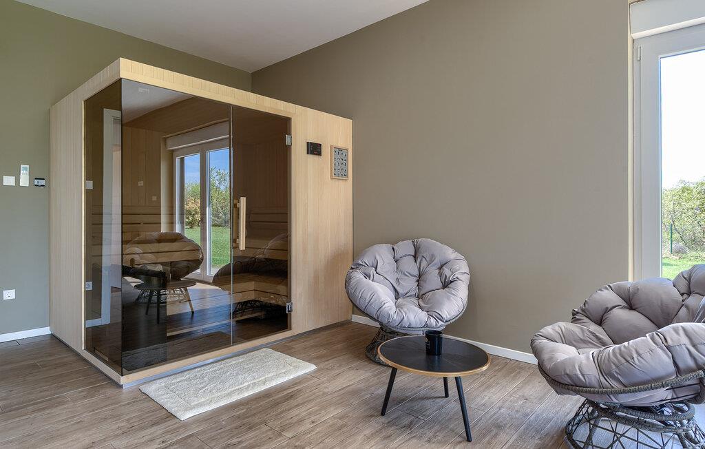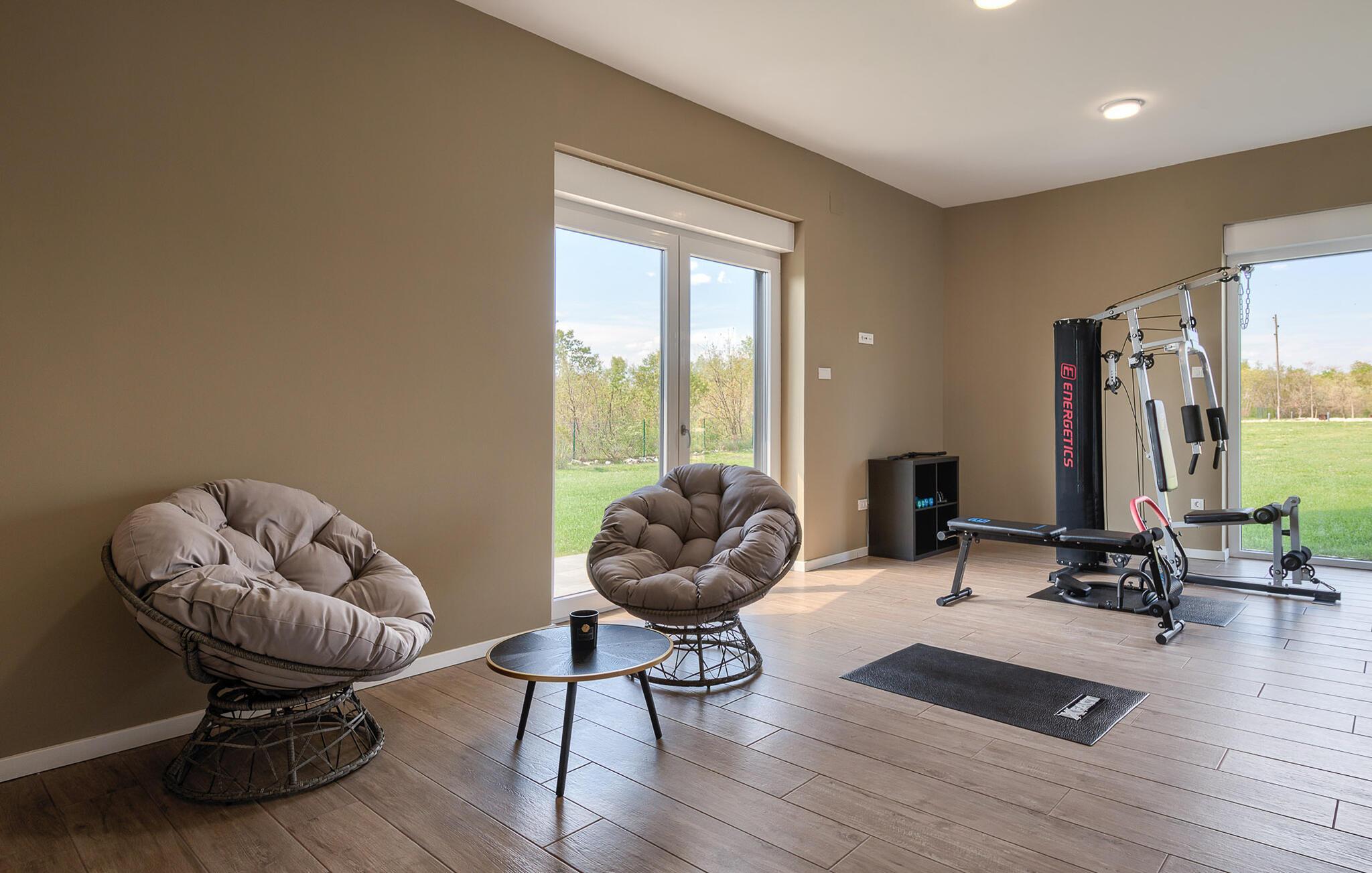 Denne luksuriøse villa i Jursici er ideel til familier eller grupper, der leder efter afslapning og underholdning på deres ferie. Nyd husets mange faciliteter. Begynd dagen med udsigt til det store, grønne landskab fra balkonen på første sal. Bagefter kan I slappe af i saunaen eller spille et spil bordfodbold eller pool. Moderne fitnessudstyr er tilgængeligt for aktive gæster, så I kan holde jer i form selv på ferie. I kan spise sammen ved det lange spisebord ved siden af ??det rummelige køkken eller udenfor på den overdækkede terrasse med den murede grill.