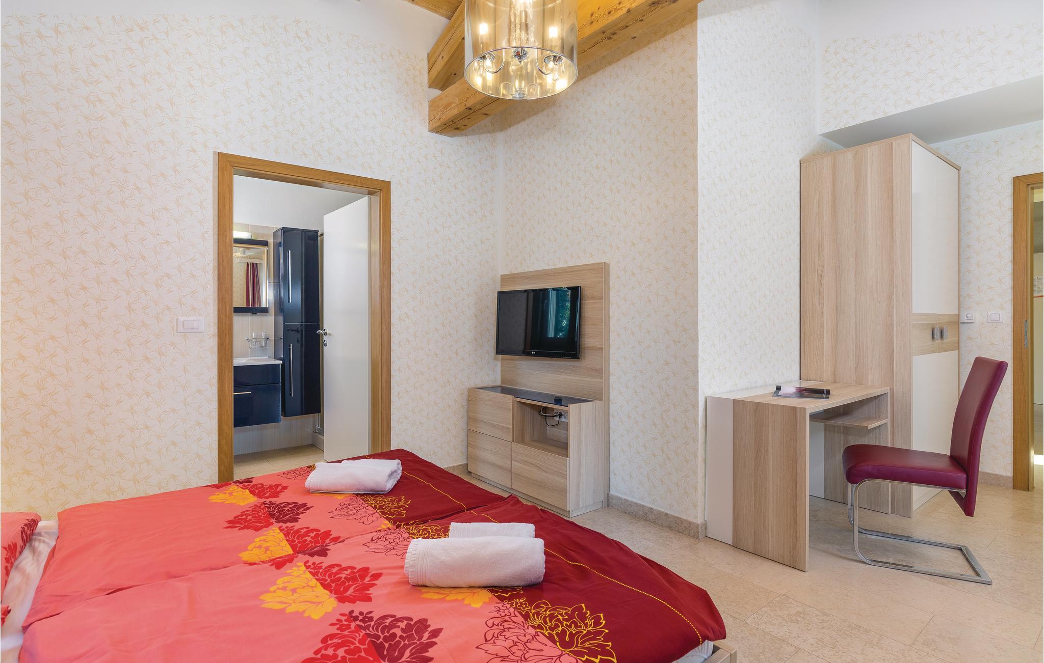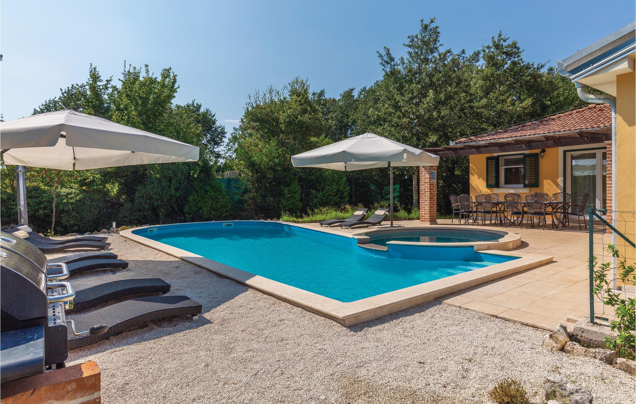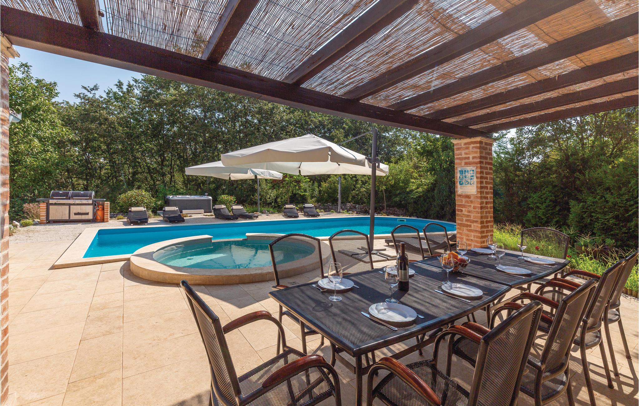 Dette usædvanlig godt udformede feriehus ligger i udkanten af en pæn landsby i hjertet af Istrien. Det er stilfuldt indrettet og giver jer al mulig komfort. Huset er indrettet helt i tråd med nutidens krav til standard, det specielle er gulvvarmen og -afkølingen. En sådan måde et afkøle huset på er både mere miljøvenlig og mere støjfri end det sædvanlige klimaanlæg. Forbindelsen mellem ude og inde er den rummelige terrasse, hvorfra voksne har det fulde overblik over, hvad børnene foretager sig i den skønne pool. Her er ikke kun pool, men også en pragtfuld whirlpool under åben himmel, hvor I kan få masseret alle myoser væk, mens I nyder synet af den blå himmel. For at gøre det hele endnu bedre stiller husets ejer endnu en grund til rådighed, som I kan tumle jer på sammen med gæsterne i CIL070. Her er både legeplads, sportsplads og forskellige andre beskæftigelsesmuligheder. Der er også en fodboldbane til at spille på kun 150 m fra feriehuset. Dette er sikkert en fordel for en relativt stor familie eller gruppe af venner, der gerne vil holde ferie sammen. Huset ligger roligt og i udkanten af sin egen skov, det er det sidste hus i udkanten af landsbyen. Beliggenheden er meget velegnet til at løbe, vandre eller gå tur med hunden. Attraktioner, kunst og kultur i omgivelserne, der tilbyder sig som mål for dagsture, er det romerske amfiteater i Pula, trøffelbyen Motovun, den vidunderlige by Rovinj eller, helt sikkert interessant for børn, badelandet i Porec.