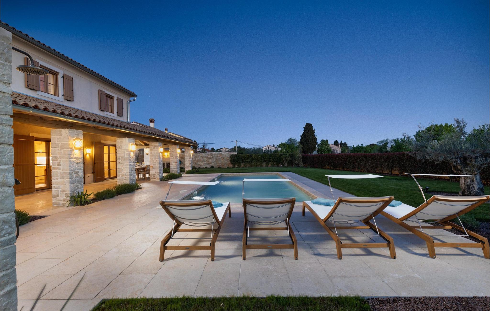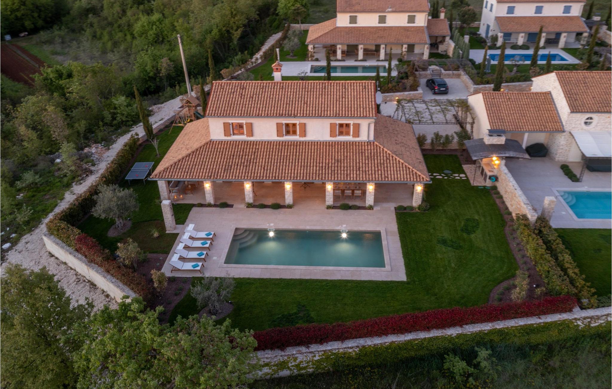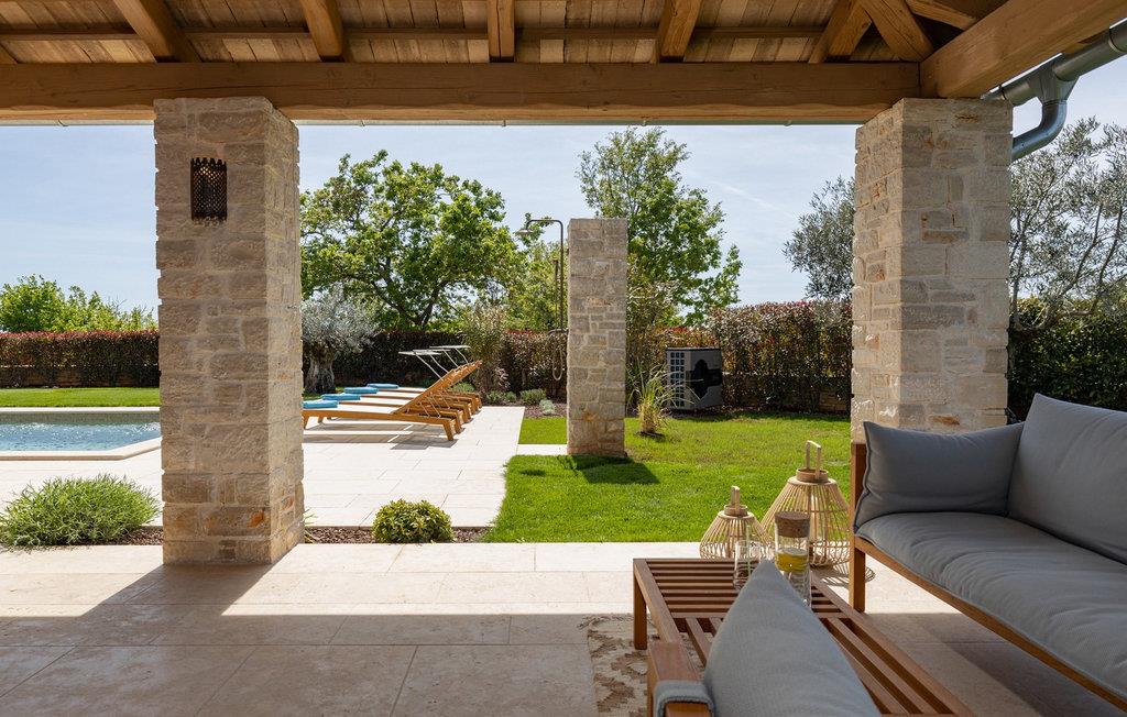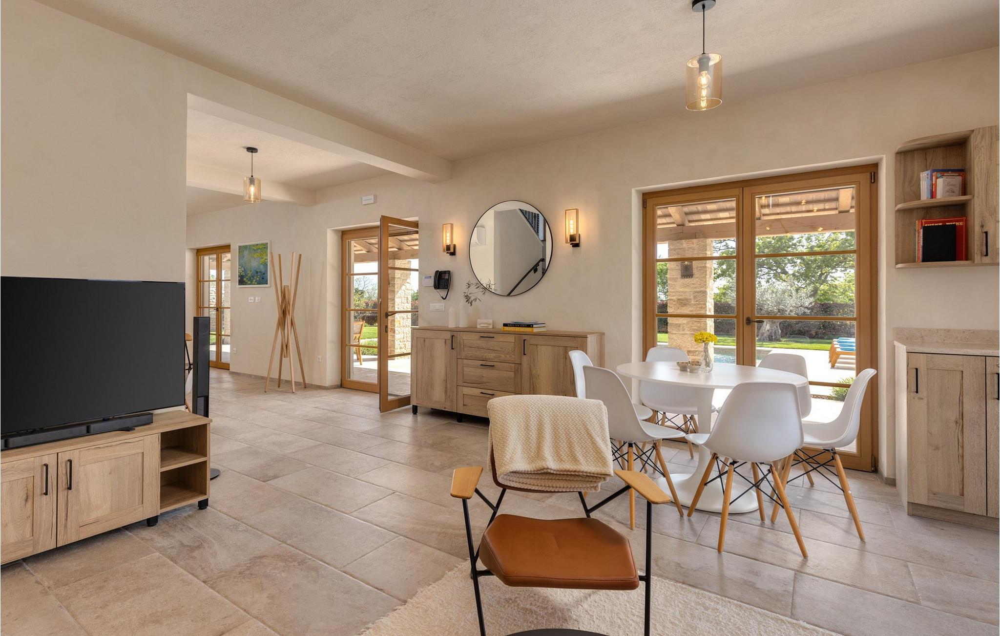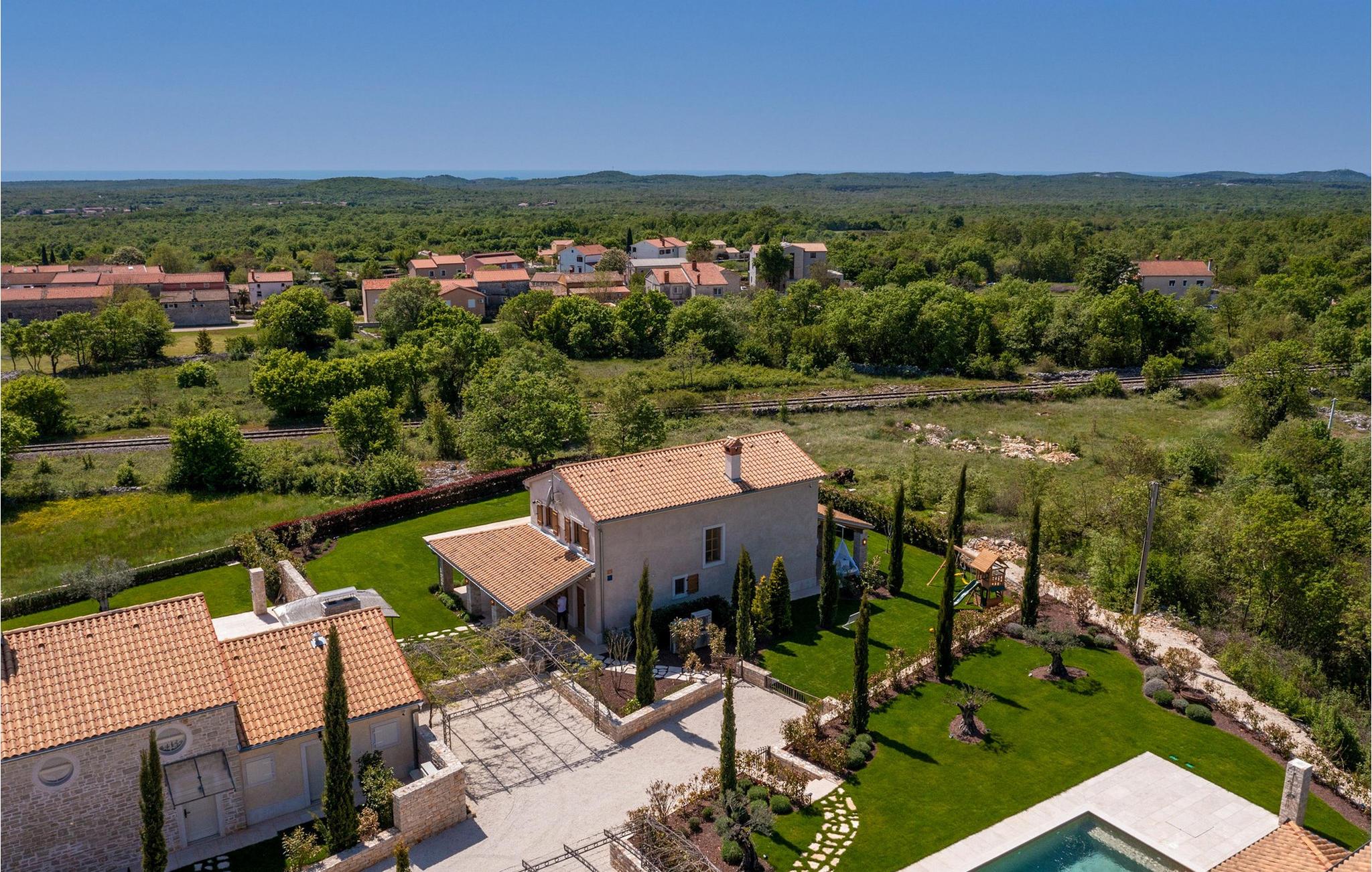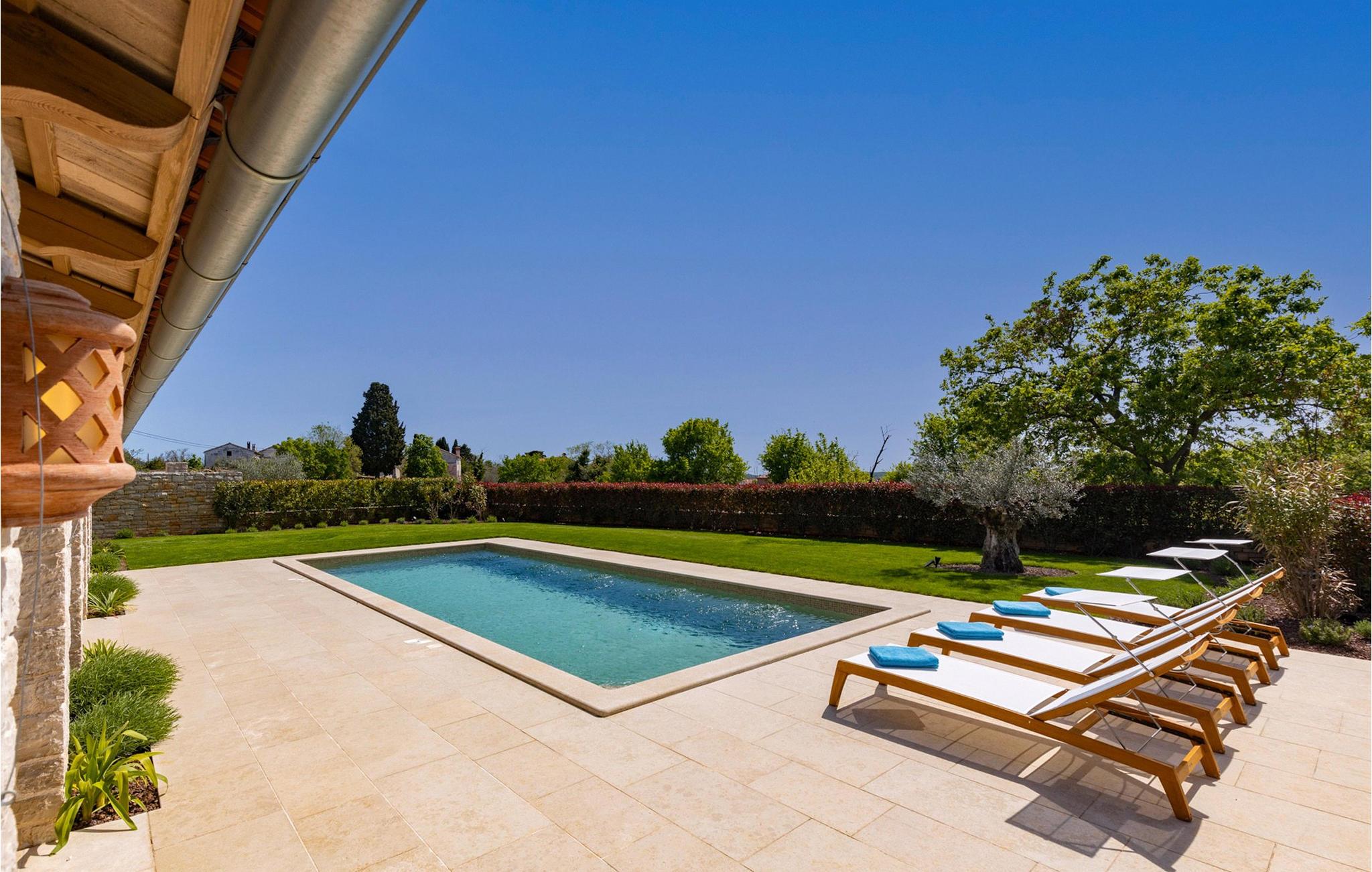 Forkæl dig selv med en drømmeferie i dette luksuriøse feriehus med pool. Villa Andrea imponerer med sin lyse, stilfulde atmosfære, moderne møbler og rummelige værelser, der øjeblikkeligt skaber en følelse af komfort og ro. Tilbring afslappende timer i den åbne stue, nyd måltider sammen ved spisebordet, eller afslut dagen hyggeligt med en bog foran pejsen. Direkte adgang til naturen inviterer dig til at åbne terrassedørene på vid gab og tilbringe masser af tid i haven. Nyd afslappende timer på den rummelige terrasse, nyd solen, eller krøl dig sammen med en god bog i skyggen. Tag en dukkert i poolen eller spil vandpolo med børnene. Der er også et legeområde for de yngste gæster, hvor de kan lege og boltre sig så meget de vil. Nyd lækre måltider og lune aftener under åben himmel, hvilket gør dit ophold særligt behageligt. I Smoljanci, i hjertet af Istrien, finder du fred, natur og autentisk landliv i kystens bagland. Udforsk omgivelserne på vandreture eller deltag i en guidet trøffeljagt, som denne region er særligt berømt for. En tur til den nærliggende by Motovun med dens historiske gamle bydel og storslåede udsigt kan også varmt anbefales. Derudover er kystbyerne Porec, Umag og Pula let tilgængelige for varierede dagsture til havet og kulturelle attraktioner.