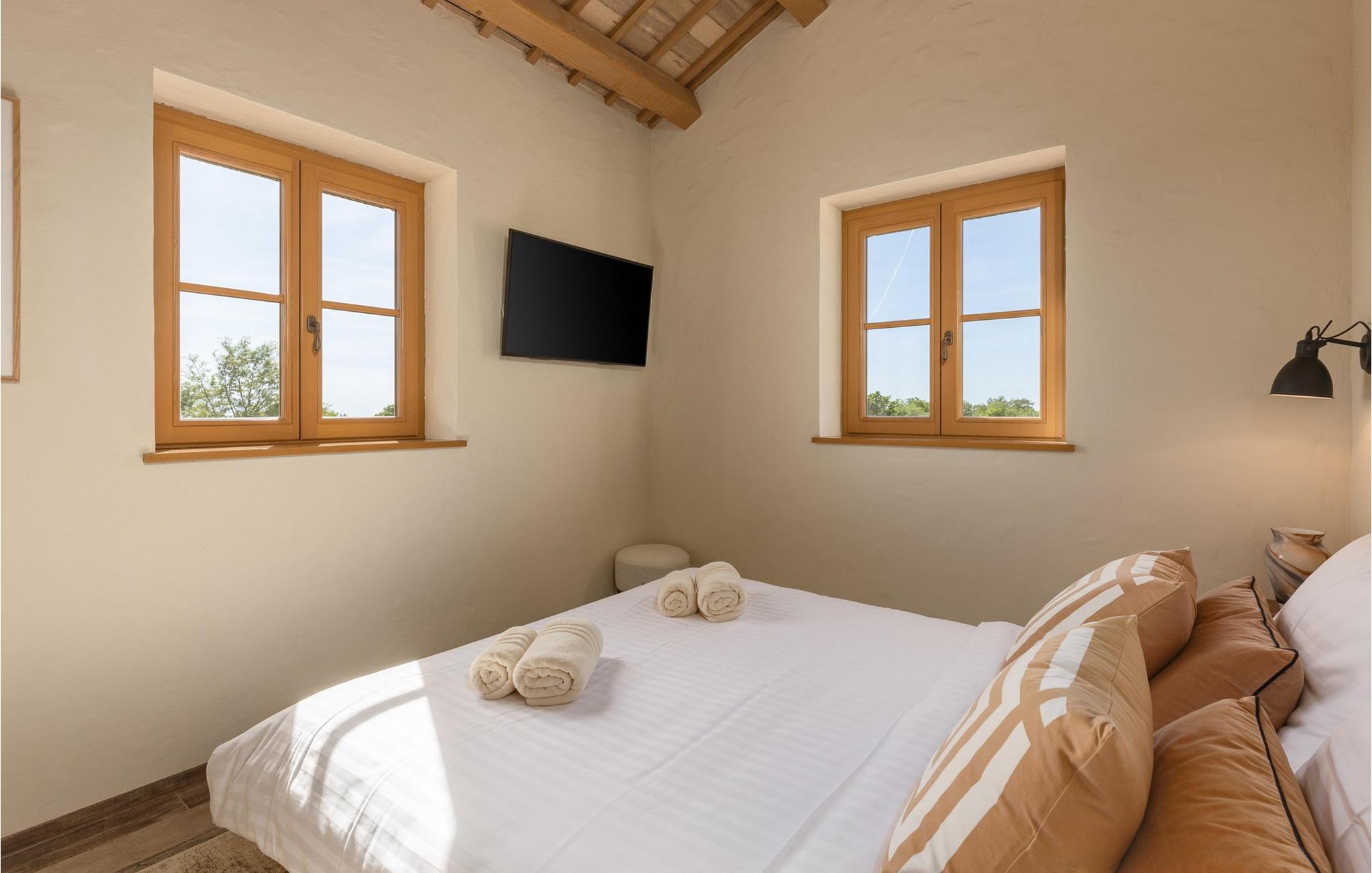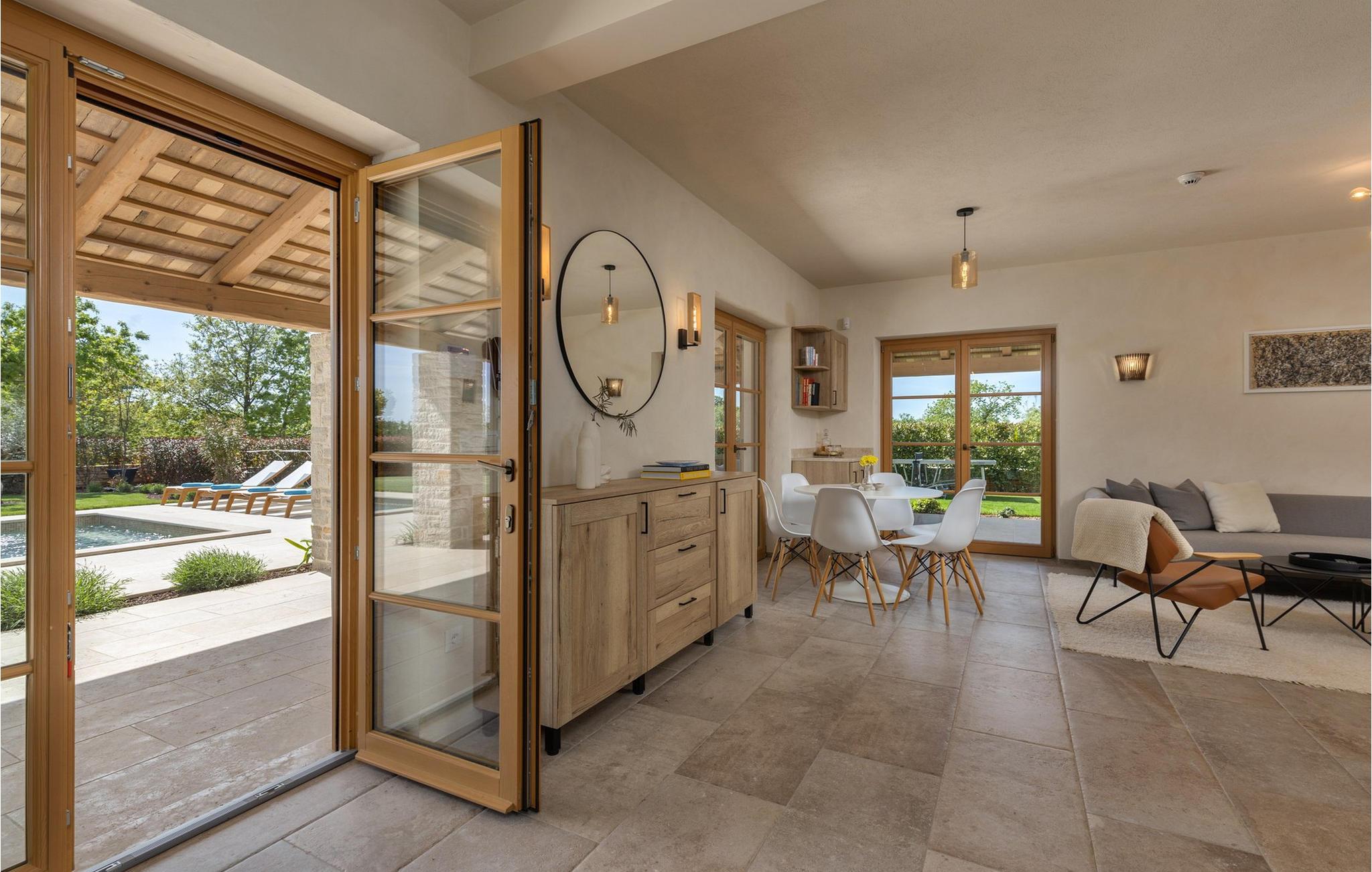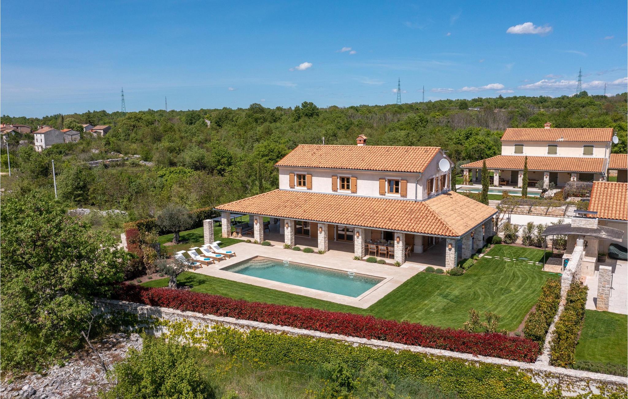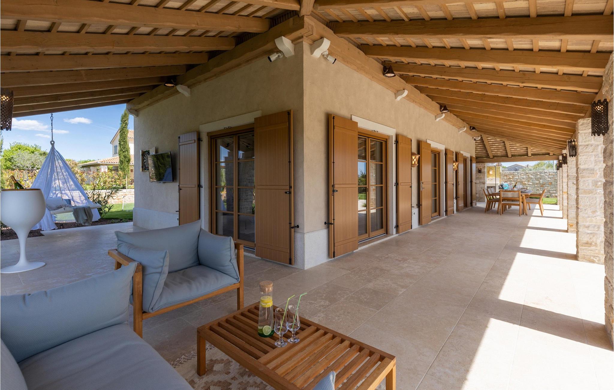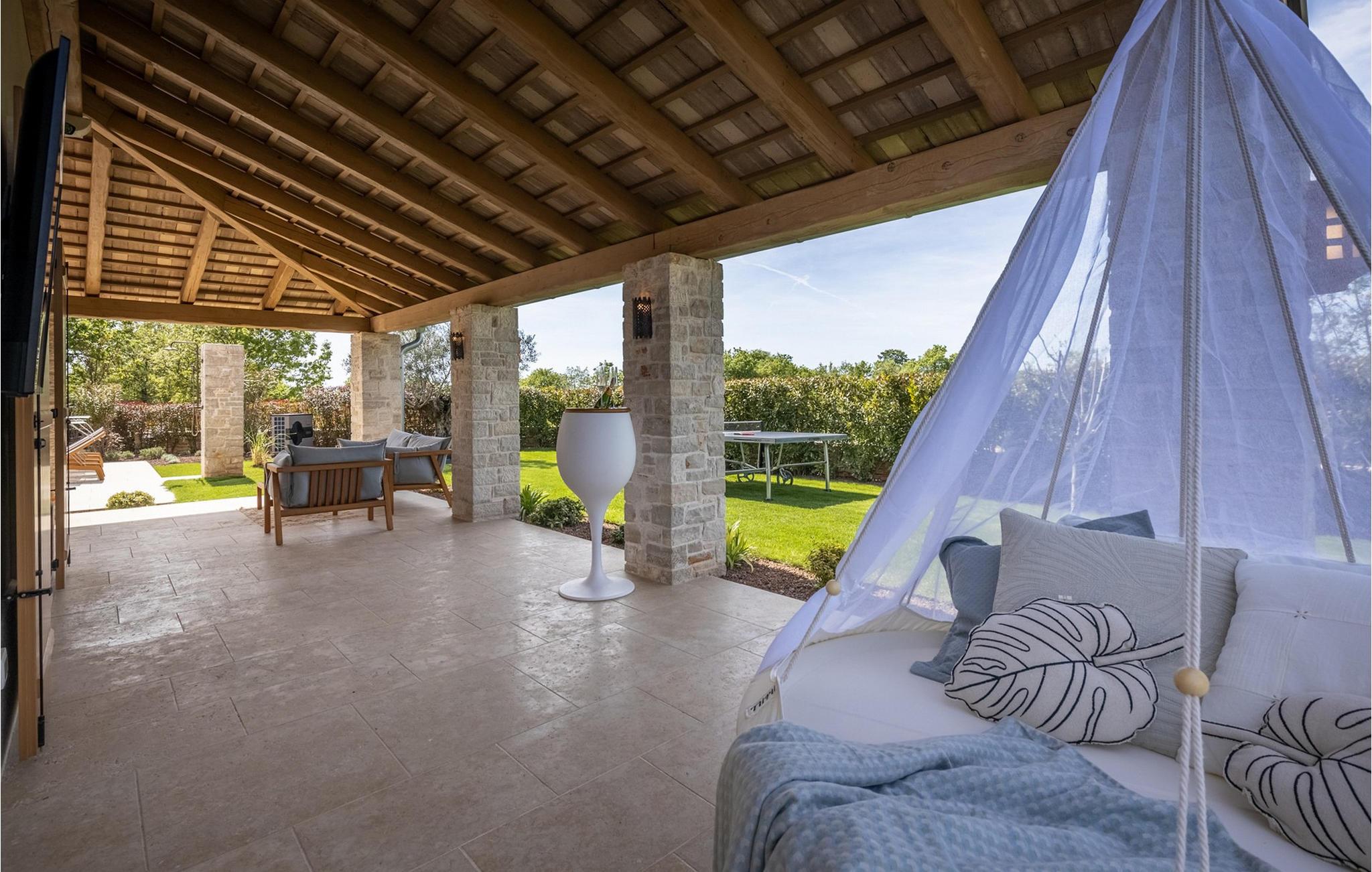 Forkæl dig selv med en drømmeferie i dette luksuriøse feriehus med pool. Villa Andrea imponerer med sin lyse, stilfulde atmosfære, moderne møbler og rummelige værelser, der øjeblikkeligt skaber en følelse af komfort og ro. Tilbring afslappende timer i den åbne stue, nyd måltider sammen ved spisebordet, eller afslut dagen hyggeligt med en bog foran pejsen. Direkte adgang til naturen inviterer dig til at åbne terrassedørene på vid gab og tilbringe masser af tid i haven. Nyd afslappende timer på den rummelige terrasse, nyd solen, eller krøl dig sammen med en god bog i skyggen. Tag en dukkert i poolen eller spil vandpolo med børnene. Der er også et legeområde for de yngste gæster, hvor de kan lege og boltre sig så meget de vil. Nyd lækre måltider og lune aftener under åben himmel, hvilket gør dit ophold særligt behageligt. I Smoljanci, i hjertet af Istrien, finder du fred, natur og autentisk landliv i kystens bagland. Udforsk omgivelserne på vandreture eller deltag i en guidet trøffeljagt, som denne region er særligt berømt for. En tur til den nærliggende by Motovun med dens historiske gamle bydel og storslåede udsigt kan også varmt anbefales. Derudover er kystbyerne Porec, Umag og Pula let tilgængelige for varierede dagsture til havet og kulturelle attraktioner.