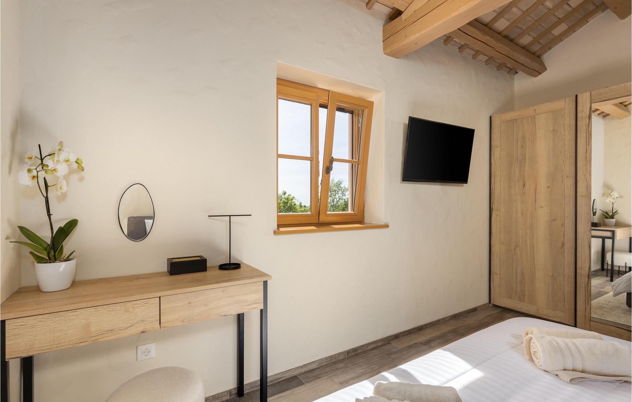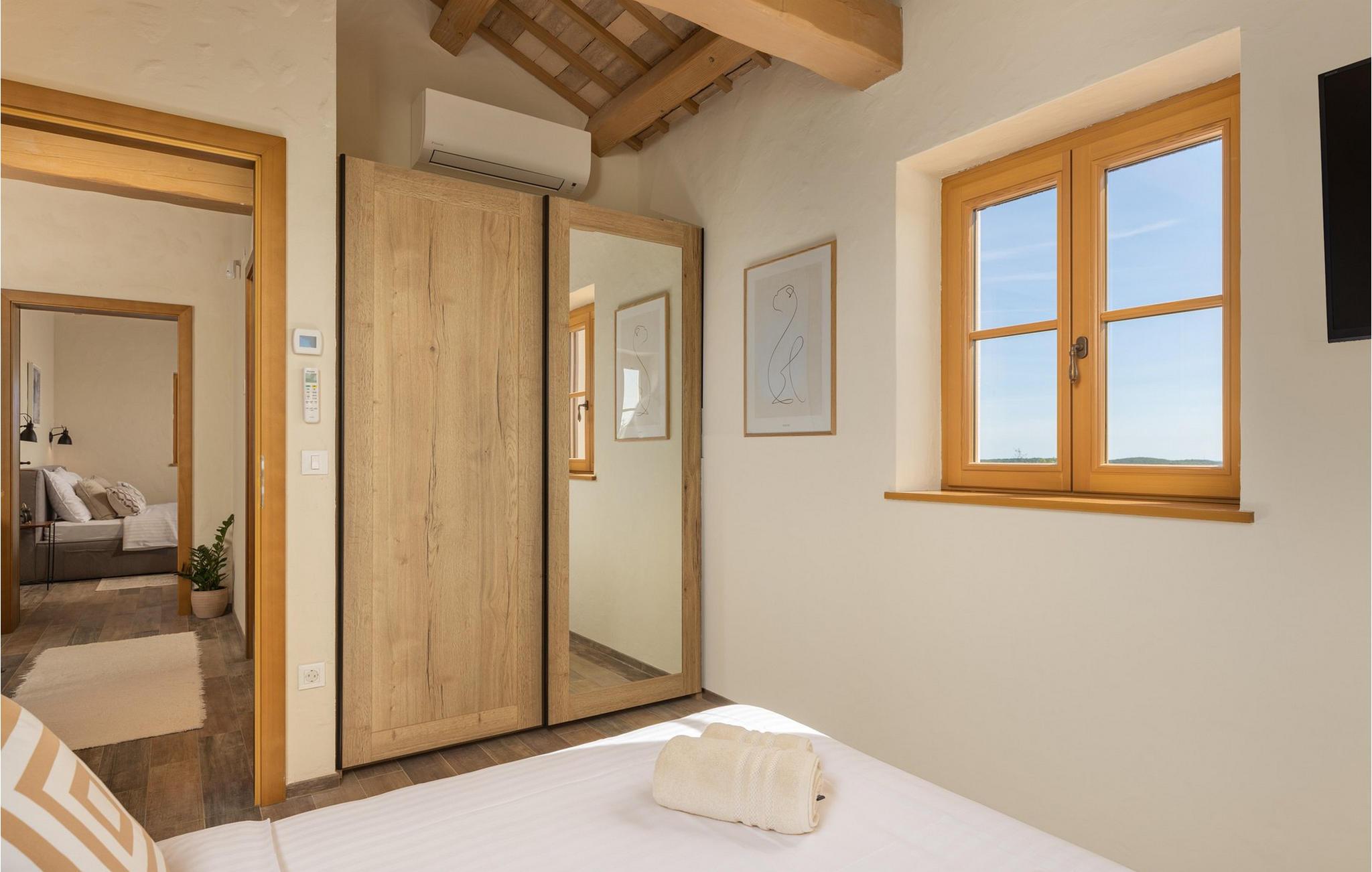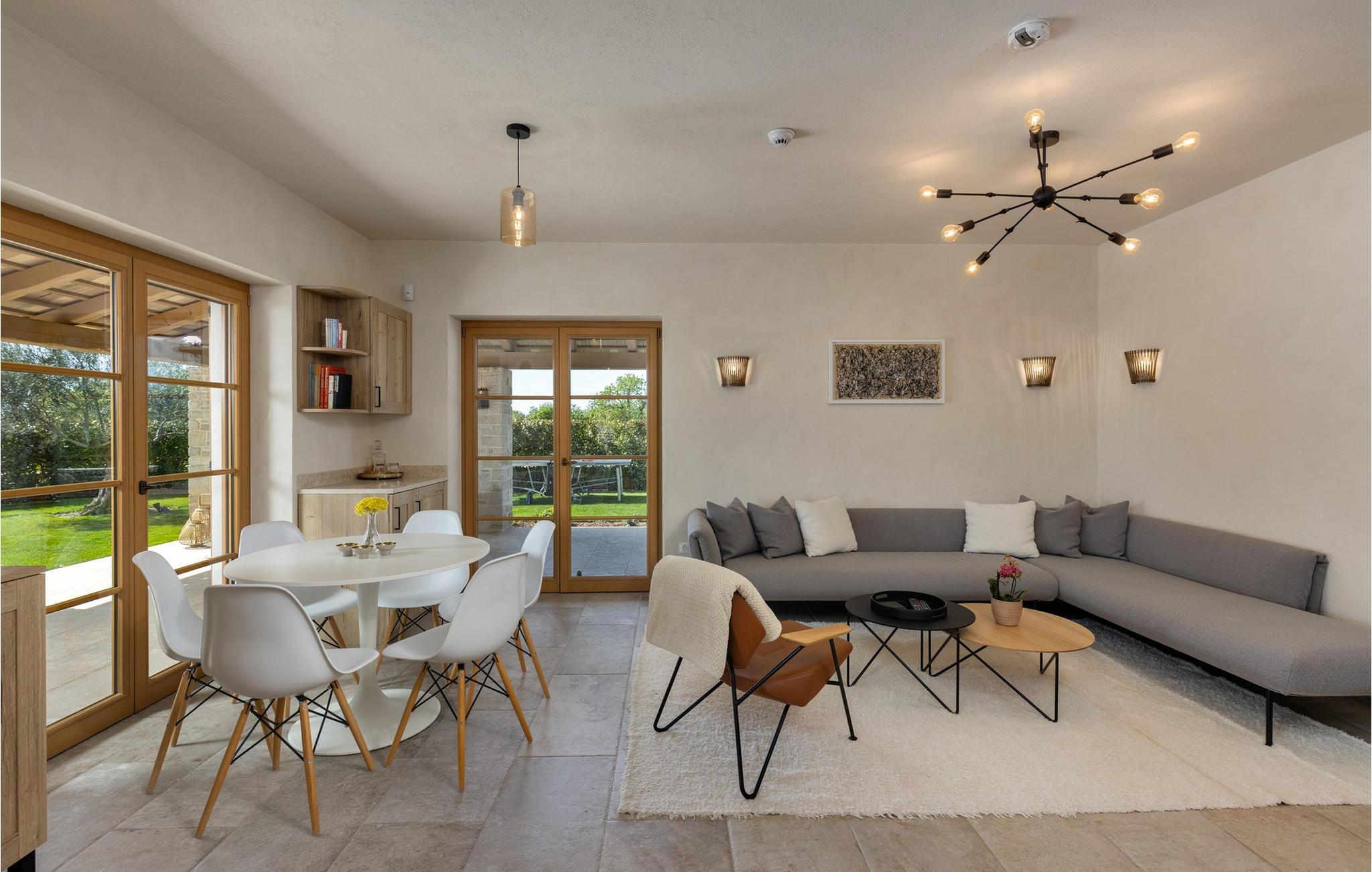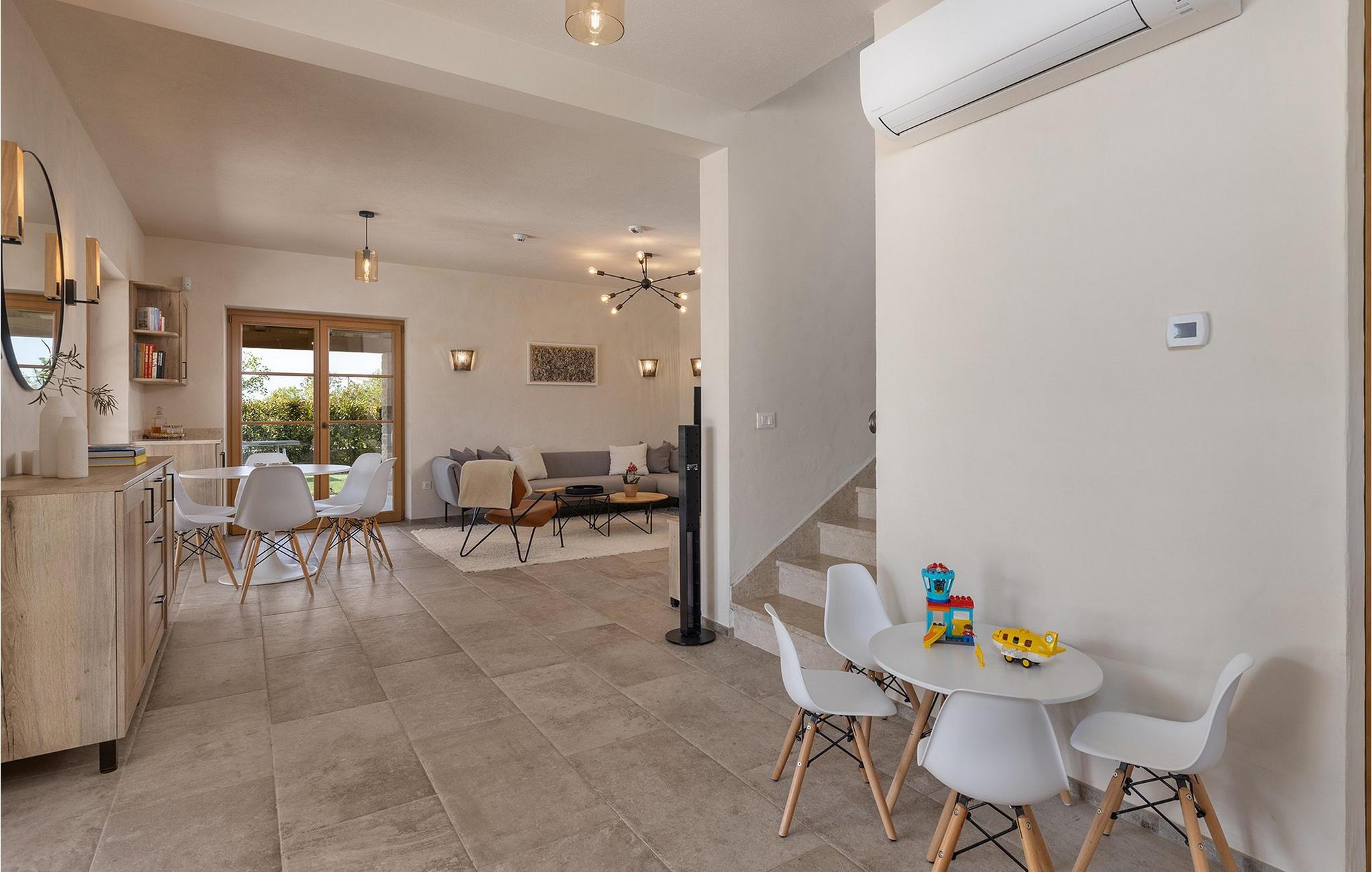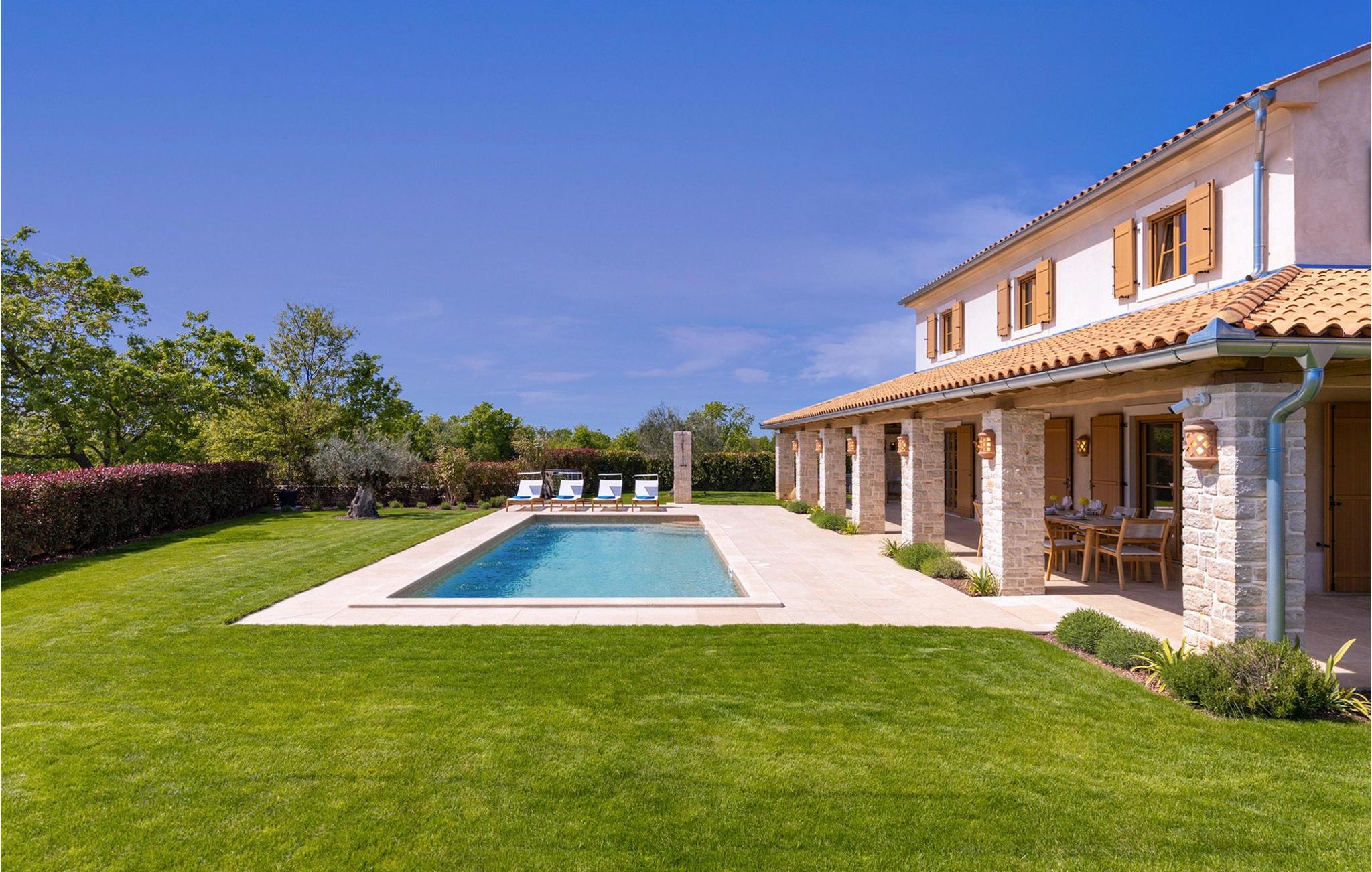Forkæl dig selv med en drømmeferie i dette luksuriøse feriehus med pool. Villa Andrea imponerer med sin lyse, stilfulde atmosfære, moderne møbler og rummelige værelser, der øjeblikkeligt skaber en følelse af komfort og ro. Tilbring afslappende timer i den åbne stue, nyd måltider sammen ved spisebordet, eller afslut dagen hyggeligt med en bog foran pejsen. Direkte adgang til naturen inviterer dig til at åbne terrassedørene på vid gab og tilbringe masser af tid i haven. Nyd afslappende timer på den rummelige terrasse, nyd solen, eller krøl dig sammen med en god bog i skyggen. Tag en dukkert i poolen eller spil vandpolo med børnene. Der er også et legeområde for de yngste gæster, hvor de kan lege og boltre sig så meget de vil. Nyd lækre måltider og lune aftener under åben himmel, hvilket gør dit ophold særligt behageligt. I Smoljanci, i hjertet af Istrien, finder du fred, natur og autentisk landliv i kystens bagland. Udforsk omgivelserne på vandreture eller deltag i en guidet trøffeljagt, som denne region er særligt berømt for. En tur til den nærliggende by Motovun med dens historiske gamle bydel og storslåede udsigt kan også varmt anbefales. Derudover er kystbyerne Porec, Umag og Pula let tilgængelige for varierede dagsture til havet og kulturelle attraktioner.