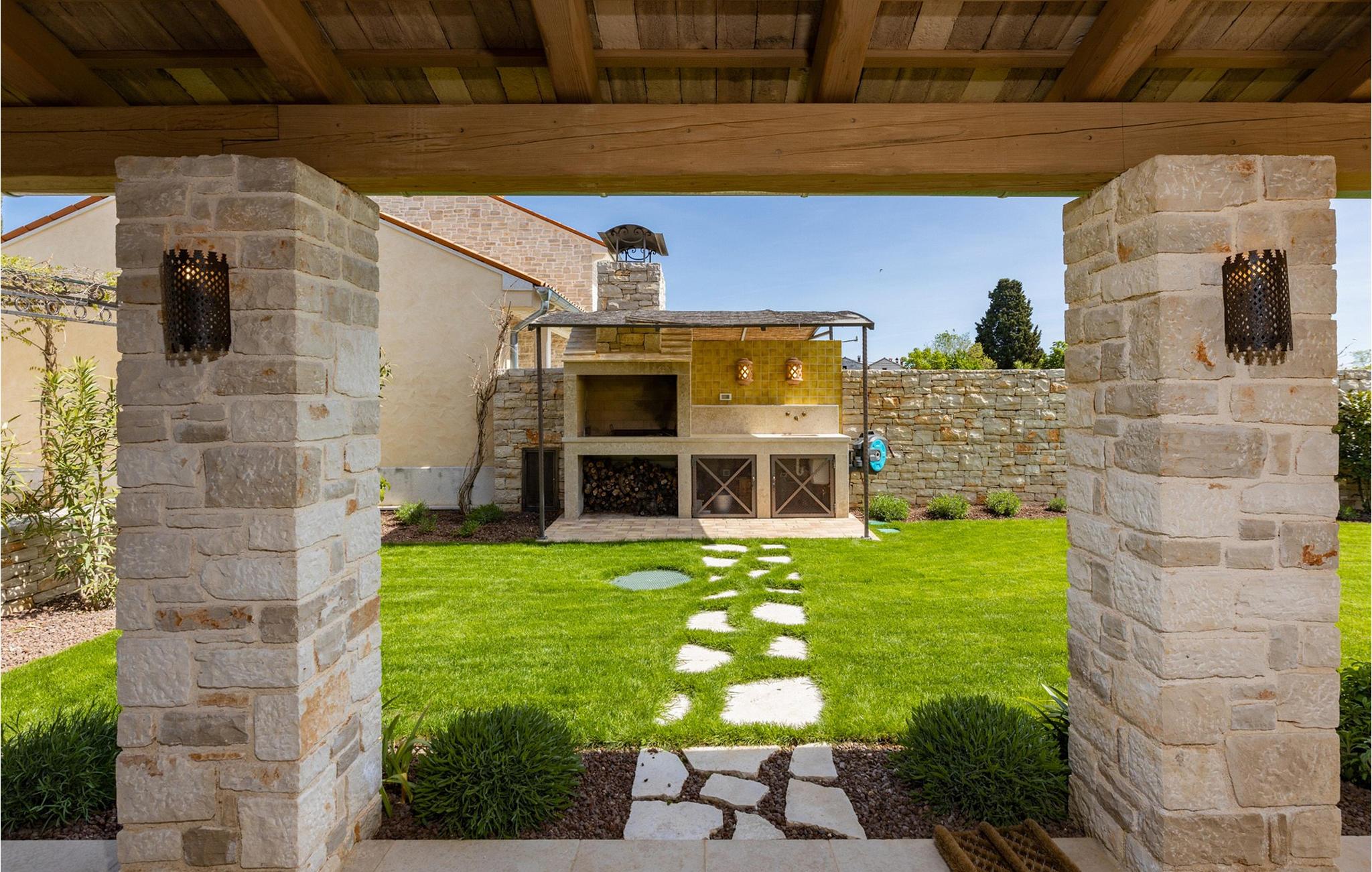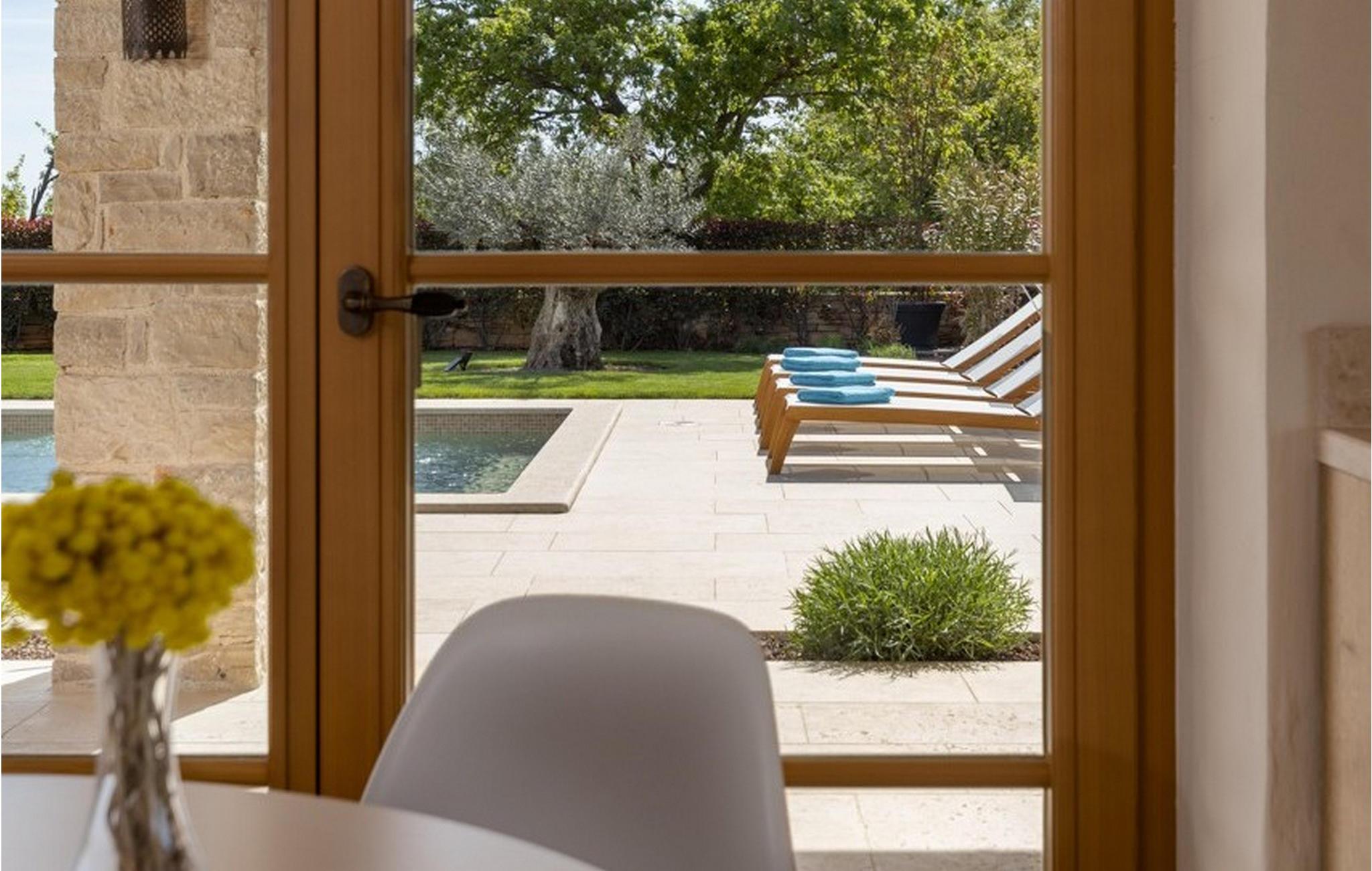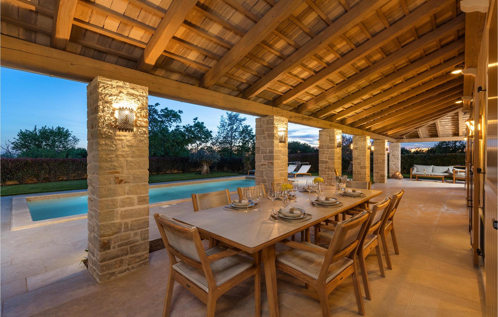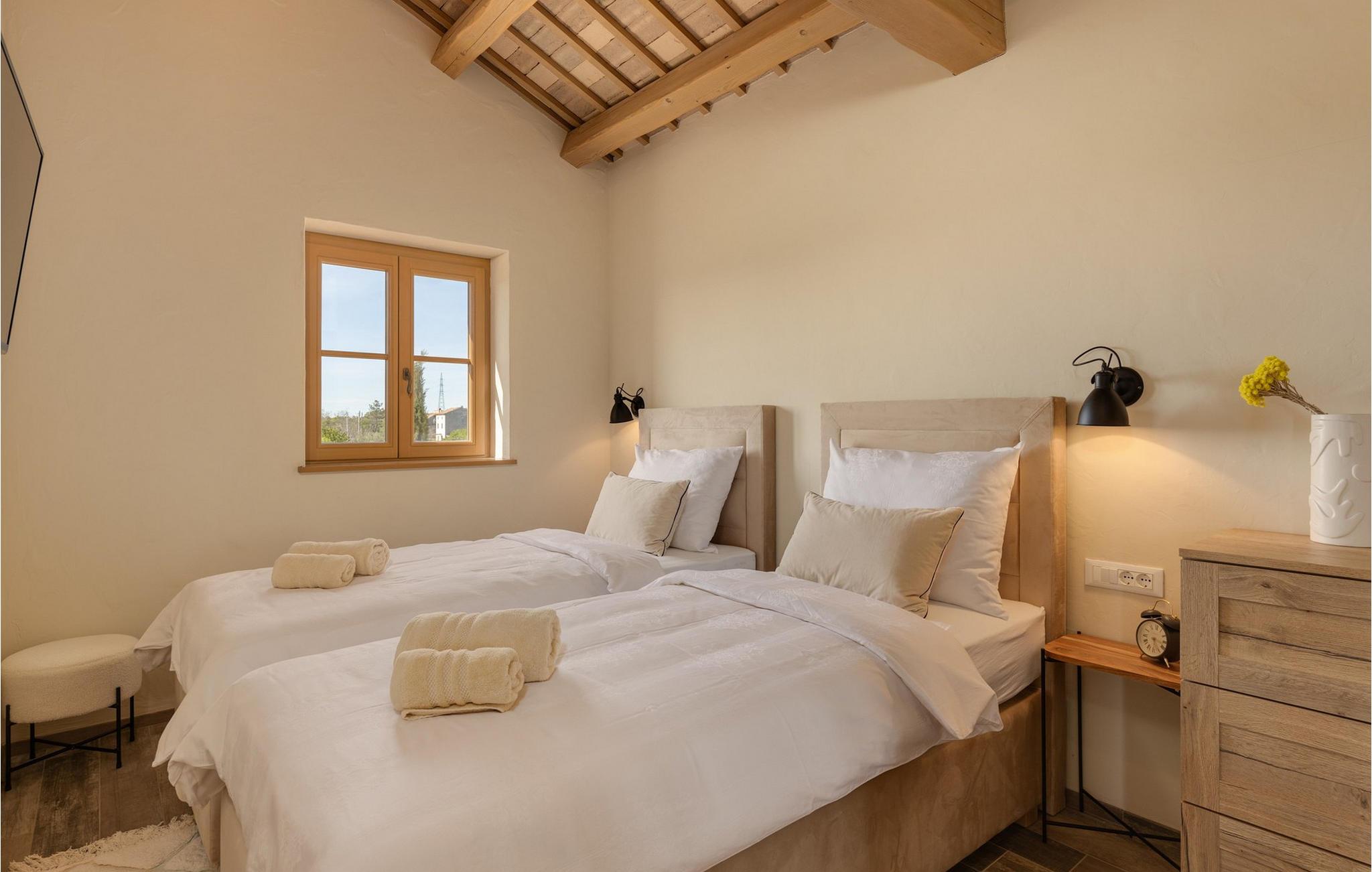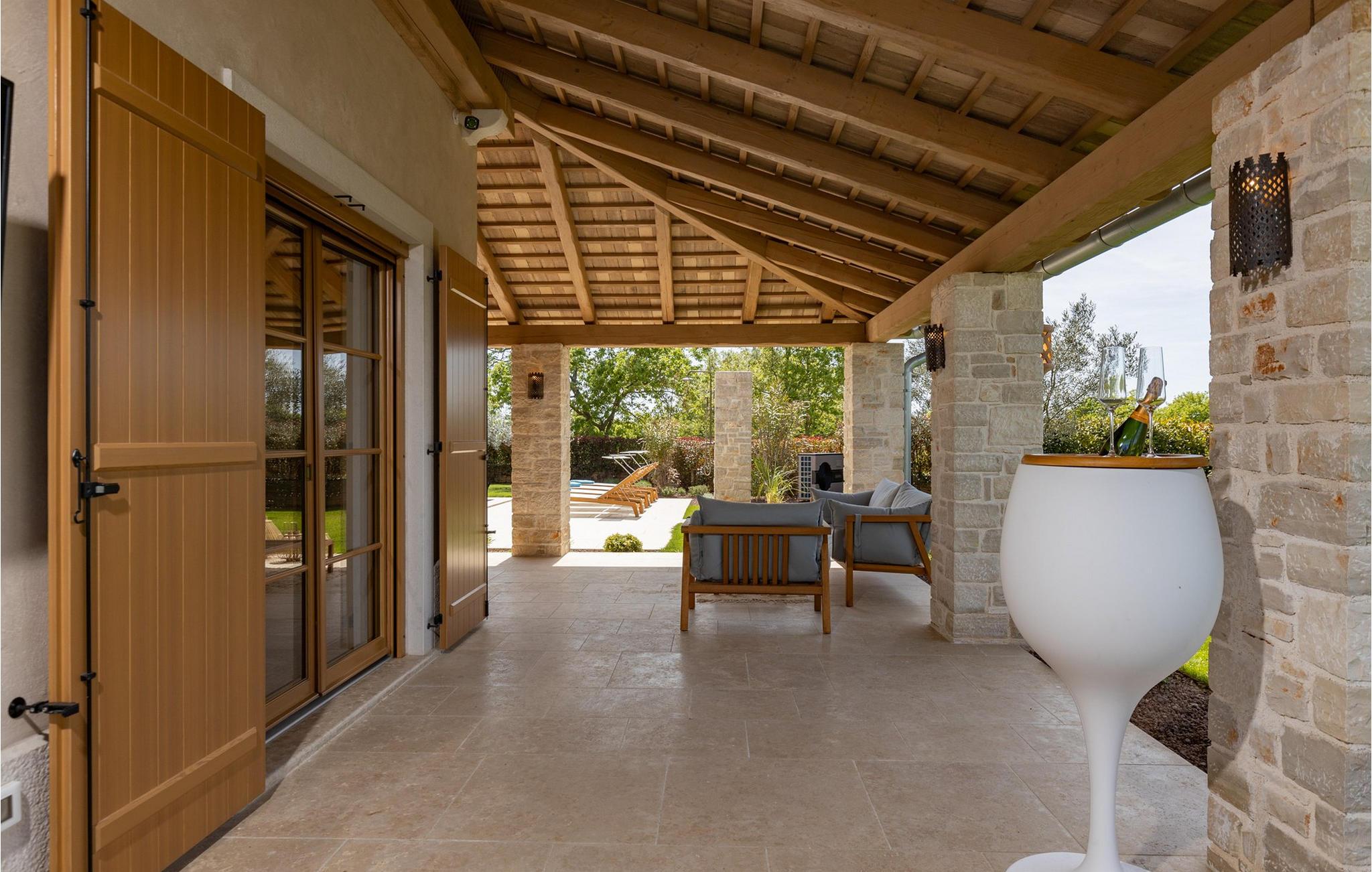 Forkæl dig selv med en drømmeferie i dette luksuriøse feriehus med pool. Villa Andrea imponerer med sin lyse, stilfulde atmosfære, moderne møbler og rummelige værelser, der øjeblikkeligt skaber en følelse af komfort og ro. Tilbring afslappende timer i den åbne stue, nyd måltider sammen ved spisebordet, eller afslut dagen hyggeligt med en bog foran pejsen. Direkte adgang til naturen inviterer dig til at åbne terrassedørene på vid gab og tilbringe masser af tid i haven. Nyd afslappende timer på den rummelige terrasse, nyd solen, eller krøl dig sammen med en god bog i skyggen. Tag en dukkert i poolen eller spil vandpolo med børnene. Der er også et legeområde for de yngste gæster, hvor de kan lege og boltre sig så meget de vil. Nyd lækre måltider og lune aftener under åben himmel, hvilket gør dit ophold særligt behageligt. I Smoljanci, i hjertet af Istrien, finder du fred, natur og autentisk landliv i kystens bagland. Udforsk omgivelserne på vandreture eller deltag i en guidet trøffeljagt, som denne region er særligt berømt for. En tur til den nærliggende by Motovun med dens historiske gamle bydel og storslåede udsigt kan også varmt anbefales. Derudover er kystbyerne Porec, Umag og Pula let tilgængelige for varierede dagsture til havet og kulturelle attraktioner.