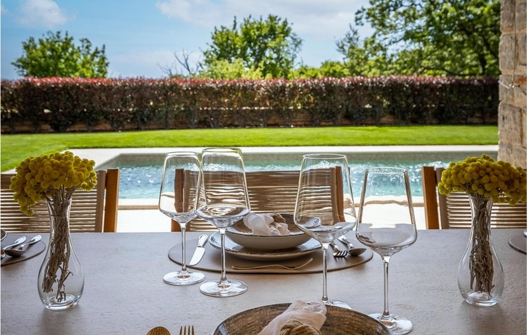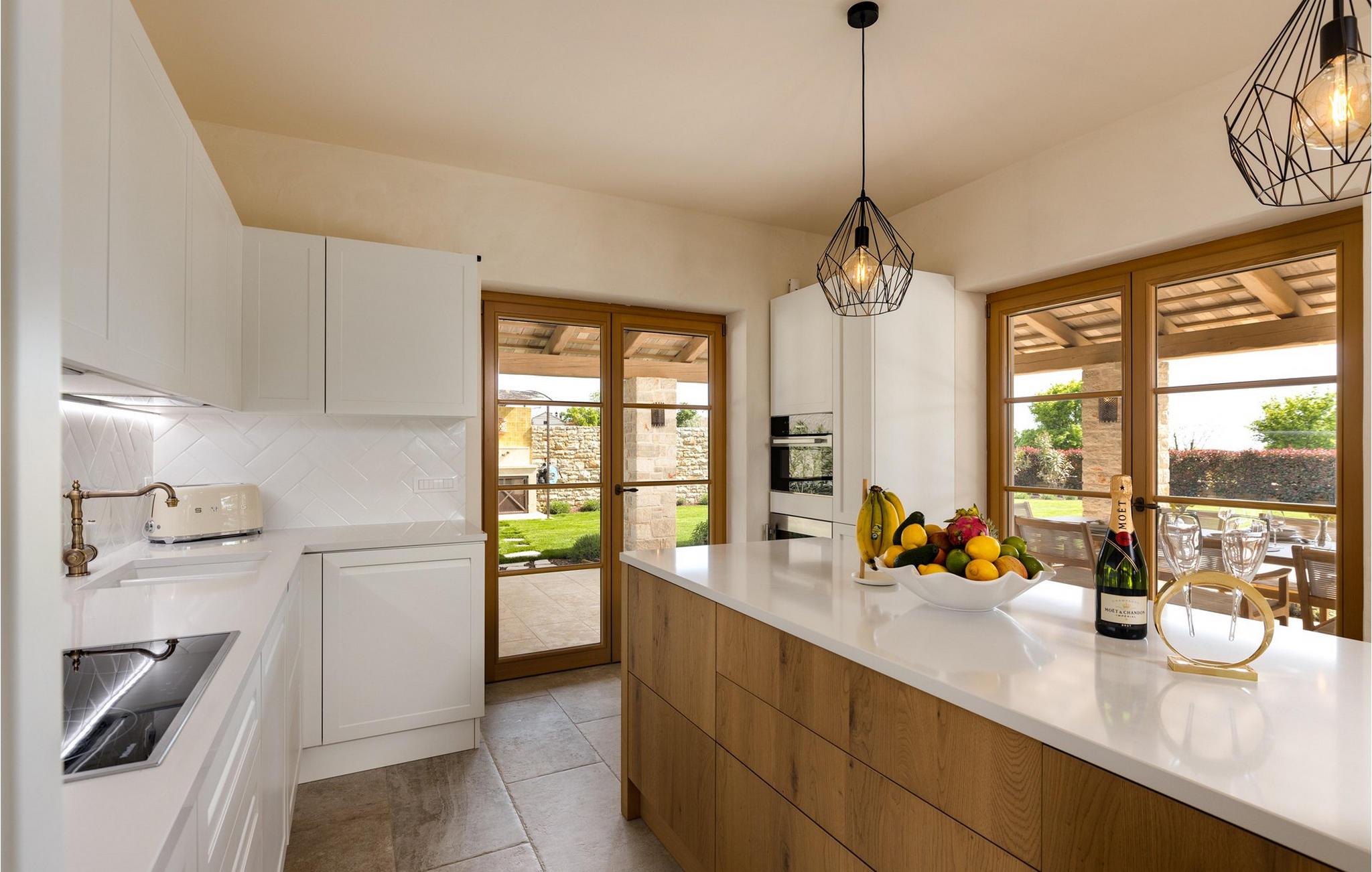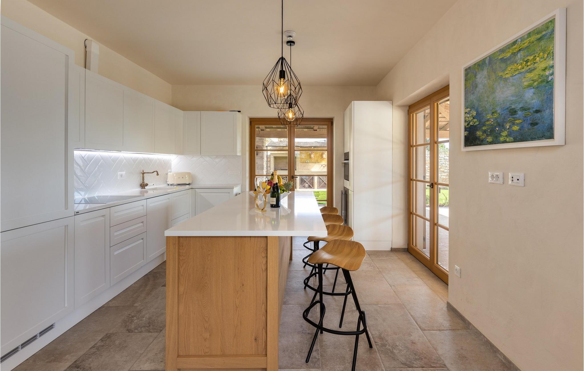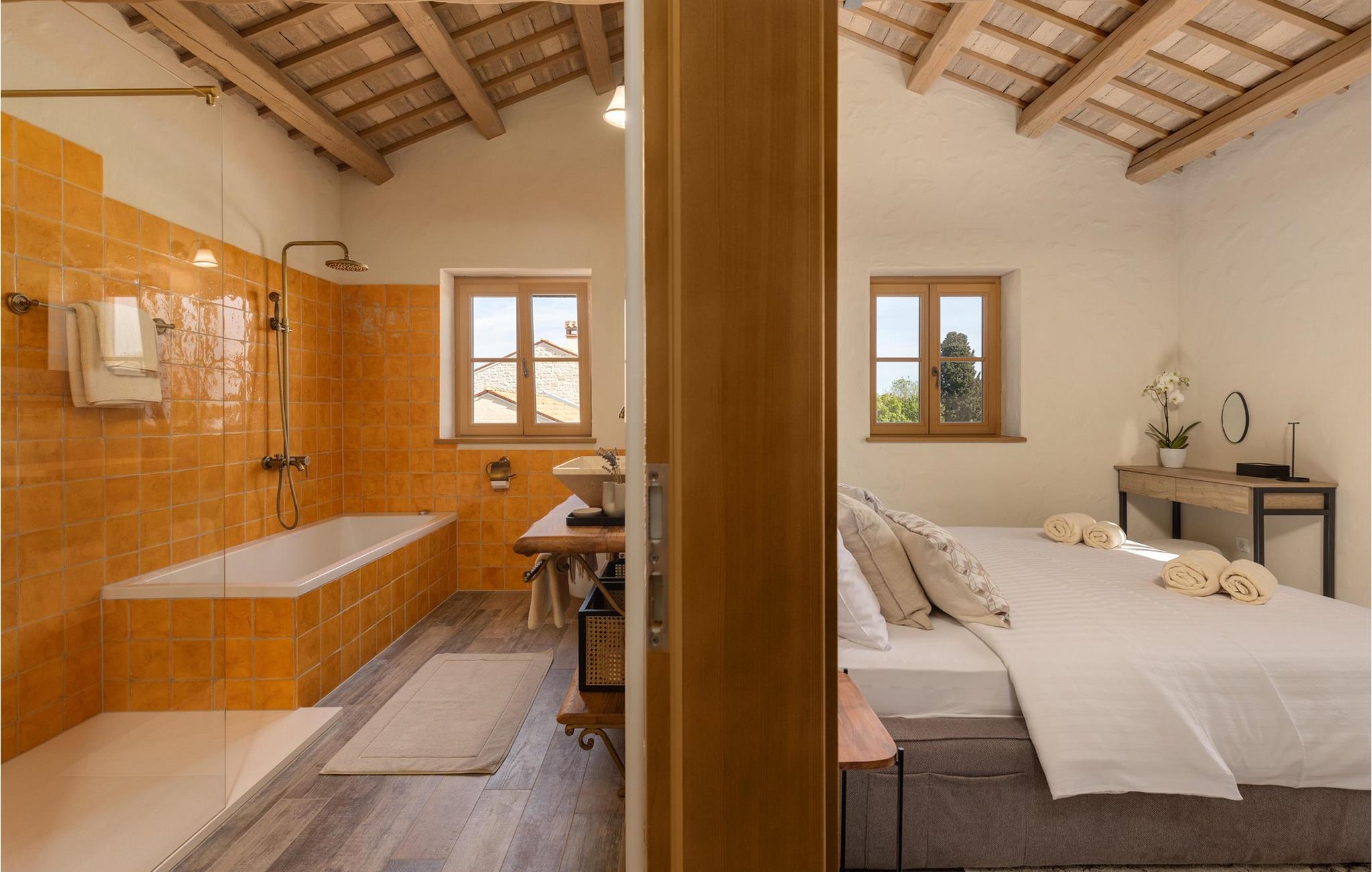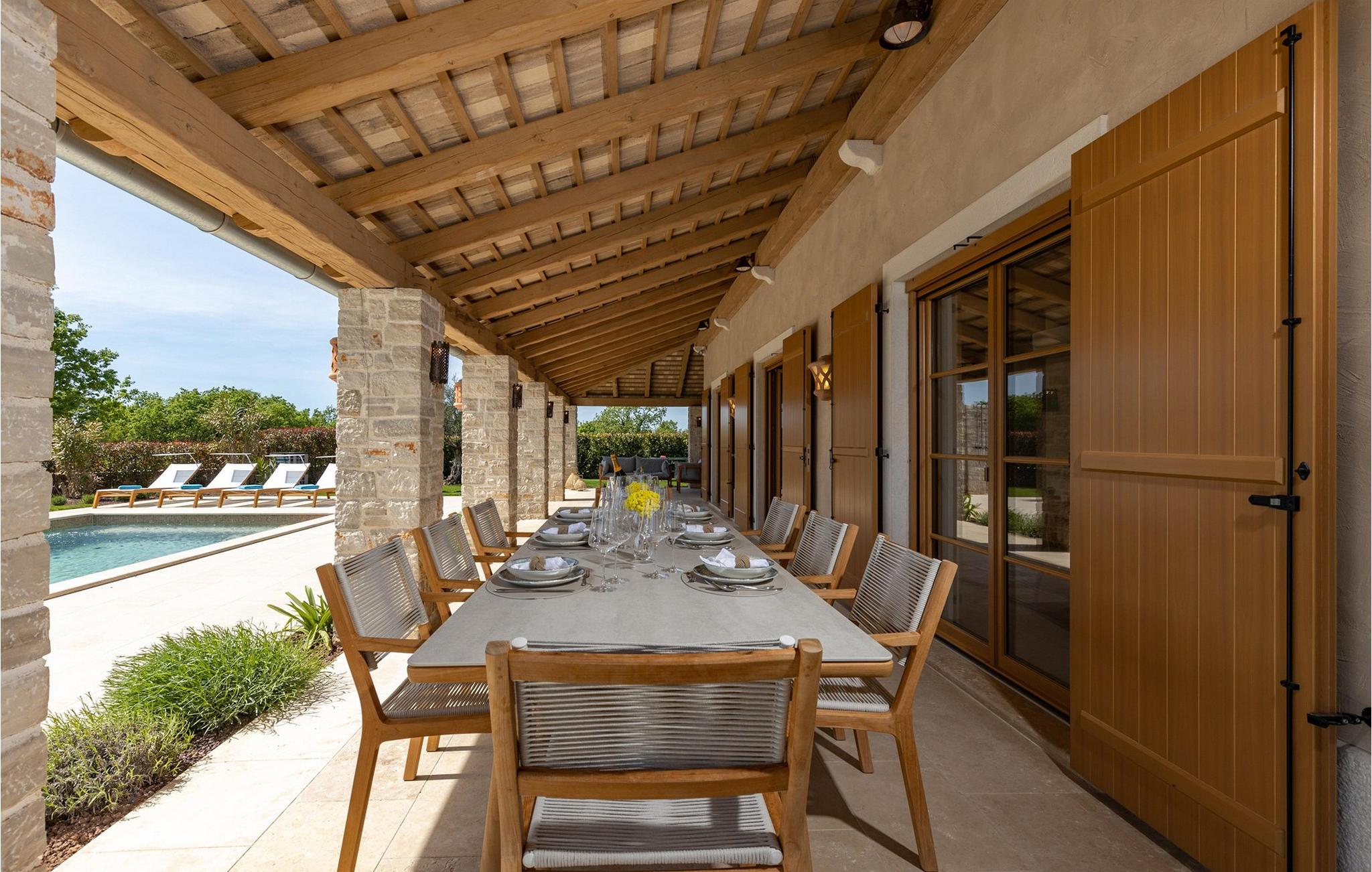 Forkæl dig selv med en drømmeferie i dette luksuriøse feriehus med pool. Villa Andrea imponerer med sin lyse, stilfulde atmosfære, moderne møbler og rummelige værelser, der øjeblikkeligt skaber en følelse af komfort og ro. Tilbring afslappende timer i den åbne stue, nyd måltider sammen ved spisebordet, eller afslut dagen hyggeligt med en bog foran pejsen. Direkte adgang til naturen inviterer dig til at åbne terrassedørene på vid gab og tilbringe masser af tid i haven. Nyd afslappende timer på den rummelige terrasse, nyd solen, eller krøl dig sammen med en god bog i skyggen. Tag en dukkert i poolen eller spil vandpolo med børnene. Der er også et legeområde for de yngste gæster, hvor de kan lege og boltre sig så meget de vil. Nyd lækre måltider og lune aftener under åben himmel, hvilket gør dit ophold særligt behageligt. I Smoljanci, i hjertet af Istrien, finder du fred, natur og autentisk landliv i kystens bagland. Udforsk omgivelserne på vandreture eller deltag i en guidet trøffeljagt, som denne region er særligt berømt for. En tur til den nærliggende by Motovun med dens historiske gamle bydel og storslåede udsigt kan også varmt anbefales. Derudover er kystbyerne Porec, Umag og Pula let tilgængelige for varierede dagsture til havet og kulturelle attraktioner.