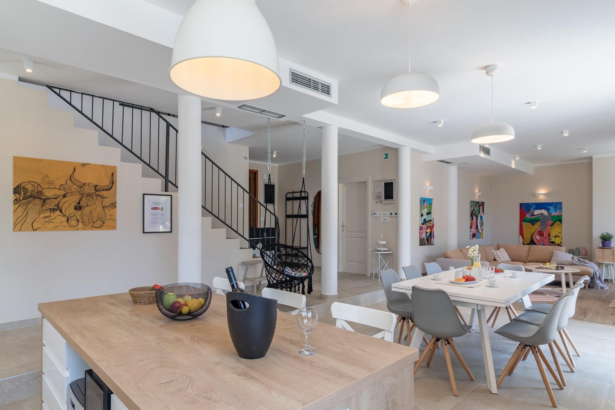 Stueetage: (Stue(Fjernsyn(parabol), sofahjørne, klimaanlæg), åbent køkken(spisebord, brødrister, komfur(Komfur med fire kogeplader), kaffemaskine, ovn, mikrobølgeovn, opvaskemaskine , køle-fryseskab), Soveværelse med badeværelse(dobbeltseng, Fjernsyn(parabol), bruser, håndvask, toilet, klimaanlæg), toilet) På 1. etage: (Soveværelse med badeværelse(enkeltfoldeseng, dobbeltseng, Fjernsyn(parabol), bruser, håndvask, toilet, klimaanlæg), Soveværelse med badeværelse(2x enkeltseng, enkeltfoldeseng, Fjernsyn(parabol), badekar med bruser, håndvask, klimaanlæg), Soveværelse med badeværelse(dobbeltseng, Fjernsyn(parabol), bruser, håndvask, toilet, klimaanlæg)) Kælderetage: (badeværelse(bruser, håndvask, toilet), loungerum(Bubble bath), tørretumbler, vaskemaskine, bordtennisbord, dart, fitnessapparater) bruser(udendørs), varme(gulvvarme), terrasse(overdækket), have(privat, indhegnet), havemøbler, solstole, grill, parkering, Parasol, swimmingpool(privat, 12 x 6 m.), strygebræt, strygejern