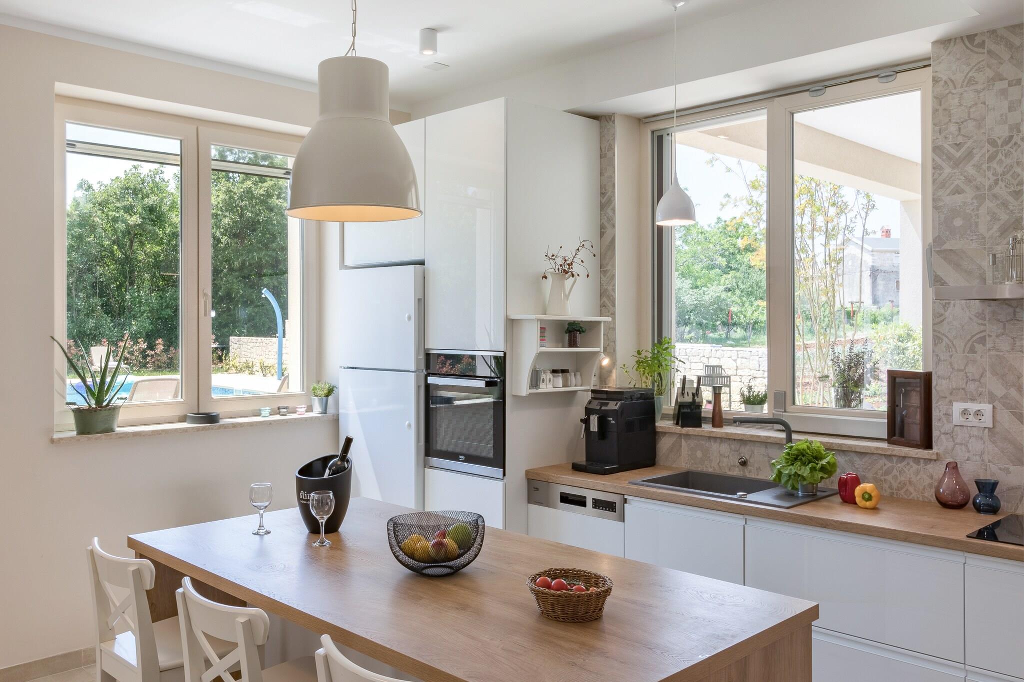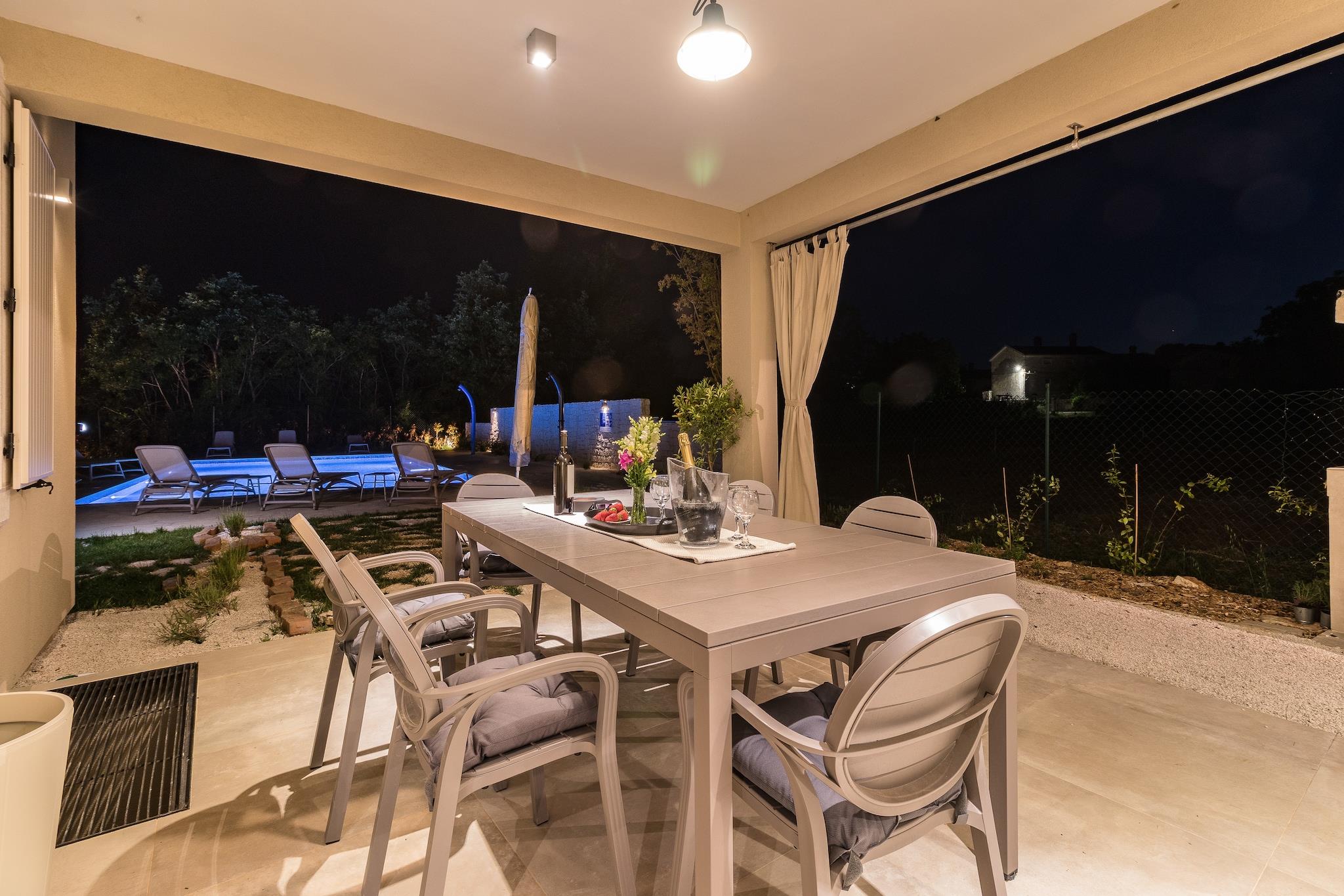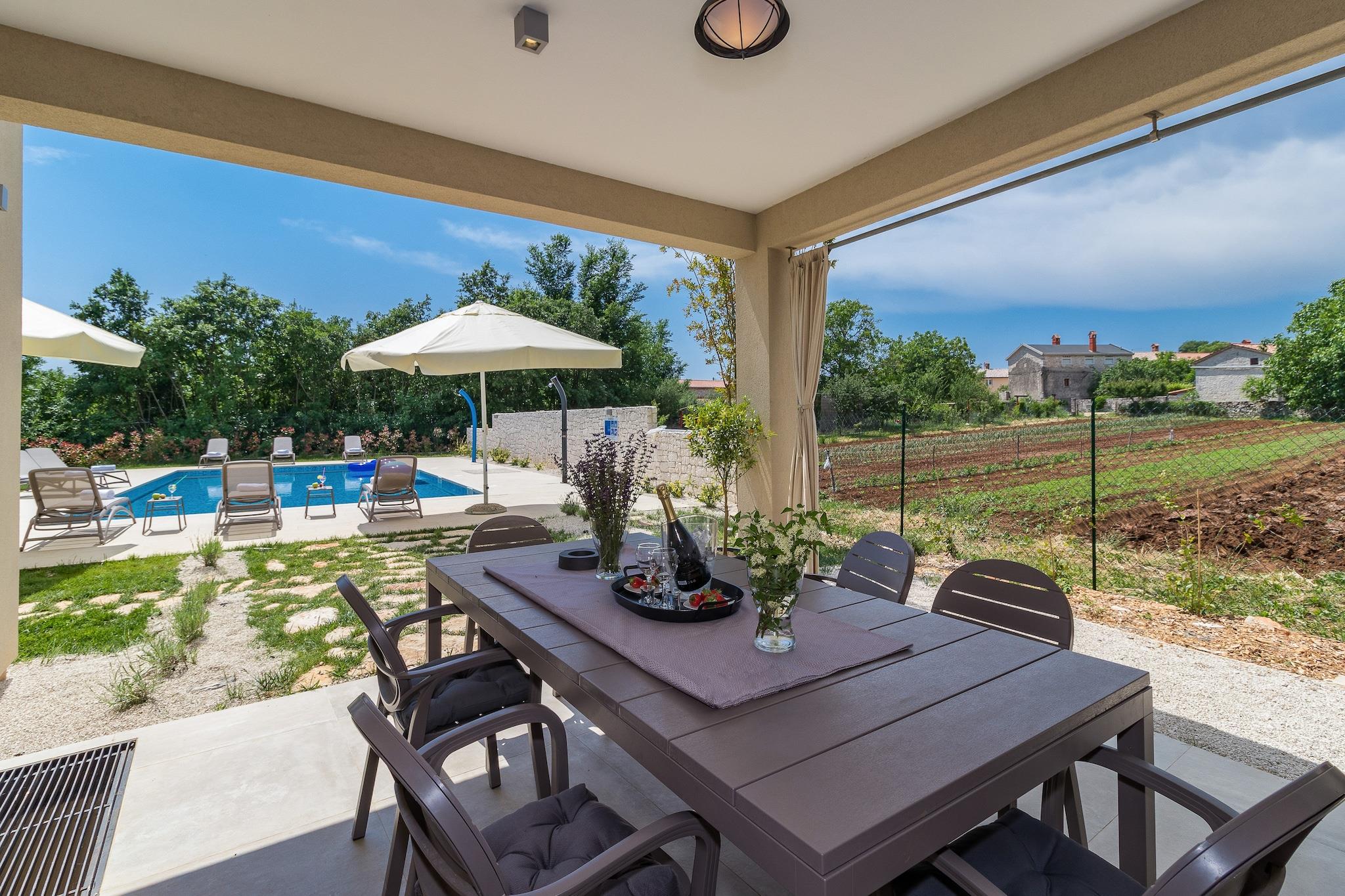 Denne ferieadresse er et godt sted at nyde din ferie! Denne smagfuldt indrettede villa er roligt beliggende i byen Butkovici i det centrale Istrien. I den lukkede have er den store private swimmingpool med solterrasse og liggestole. Du kan få en omfattende morgenmad, frokost eller middag ved spisebordet på den overdækkede terrasse, og så du kan slappe af helt, der er også en jacuzzi indenfor! Det indre af villaen er attraktivt og komfortabelt. I stueetagen finder du en stue med åbent køkken, et soveværelse med eget badeværelse og separat toilet. Der er tre soveværelser med eget badeværelse på første sal. I kælderen finder du en afslapning værelse med jacuzzi og badeværelse samt et værelse med fitnessudstyr, bordtennis og dart. Der er også to cykler til rådighed. Til en dag med sightseeing kan du besøge den kulturelle by Pula (20 km) eller den maleriske by Rovinj (33 km ). De smukke strande på vestkysten ligger 20 minutters kørsel derfra.