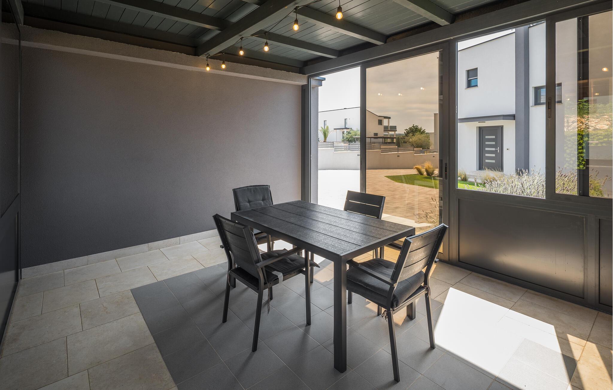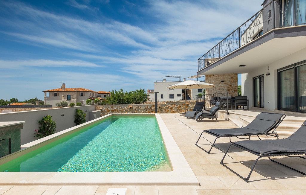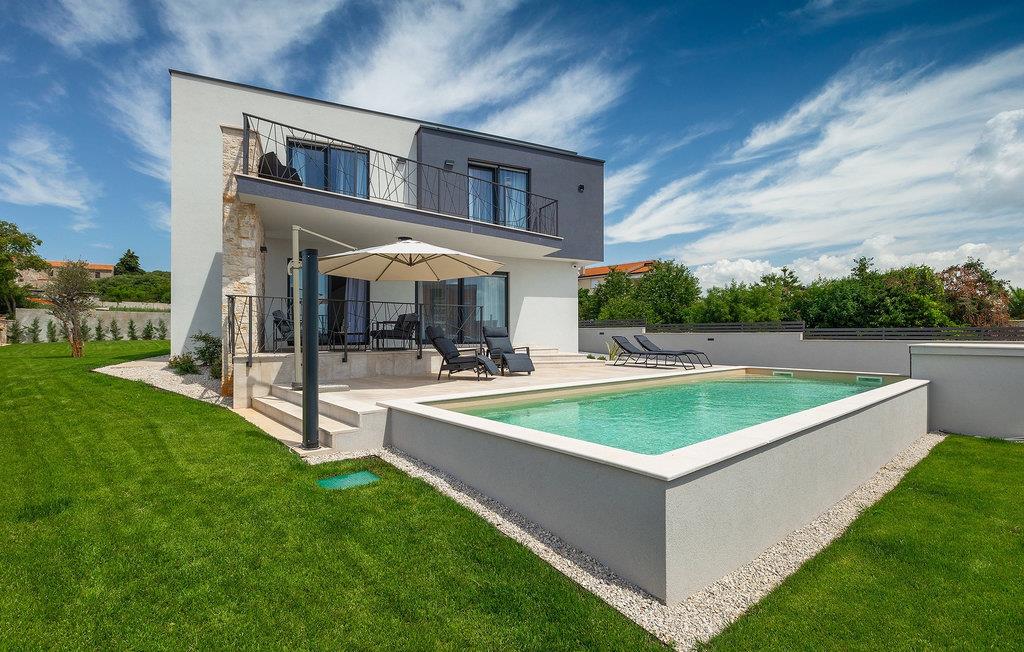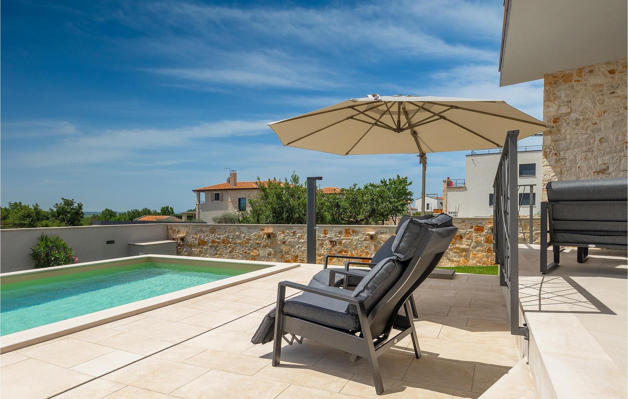 Den 32 m2 store pool - hjertet af villaen - vil give dig en forfriskning på varme sommerdage, og de komfortable liggestole inviterer dig til at nyde den istriske sol med en kølig drink i hånden. På den overdækkede terrasse har du et behageligt opholdsområde, hvor du kan nyde din første kop kaffe om morgenen, og der er grillplads med spisebord til frokost. Sæt dine grillevner på prøve, og saml familie og venner for at prøve lokale specialiteter under åben himmel.