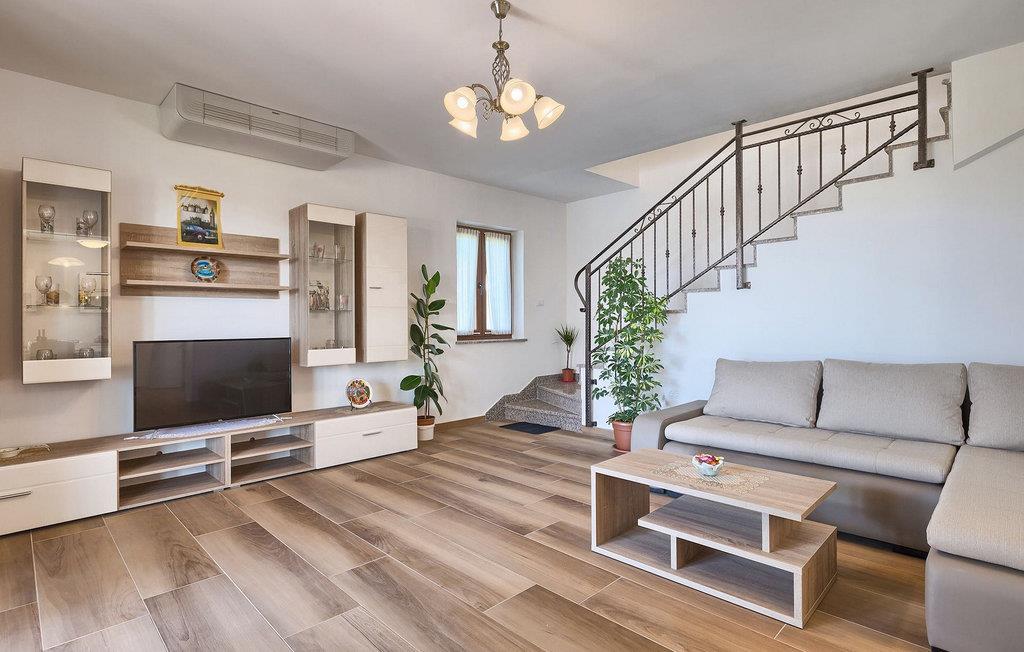 Bortset fra det lyse køkken med spiseplads, hvor du finder alt, hvad du måtte have brug for til at tilberede måltider under dit ophold, finder du i stueetagen stuen, et separat toilet og et soveværelse med eget badeværelse. Den øverste etage består af de andre 2 soveværelser med ensuite badeværelser. Alle værelser har aircondition og en dobbeltseng. I et af værelserne på øverste etage kan sengen adskilles til to enkeltsenge, hvis det er nødvendigt. Værelserne har adgang til balkonen, hvor du kan nyde udsigten over de rolige omgivelser i Istrien. Villaen er beliggende i en meget lille landsby i det centrale Istrien. Placeringen er perfekt for dem, der søger en afslappende ferie, men alligevel er alle steder i Istrien og Adriaterhavskysten let tilgængelige inden for en kort køretur. Du kan købe friske produkter direkte fra bønderne i landsbyen. Den typiske istriske lille by Tinjan ligger mindre end 5 km fra villaen. Midt i landlige byer og smukke landskaber er dette område ideelt for dem, der kan lide at cykle, cykle og vandre. Når det kommer til gastronomi, er Central Istrien berømt for jomfruolivenolie, prosciutto og Malvasia, som alle er elskede i hele landet. Hvis du vil besøge strandene, kan du nemt nå en af de forskellige strande på Istriens vestkyst, omkring den historiske by Porec og andre steder i nærheden. En dagstur til Brijuni nationalpark, at besøge Lim-bugten eller byen Porec er altid en god idé.