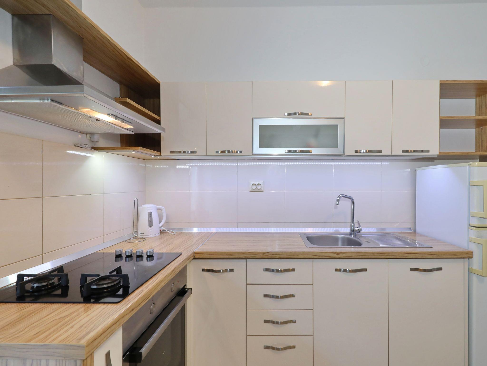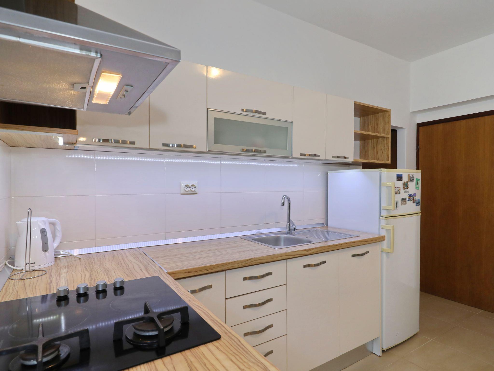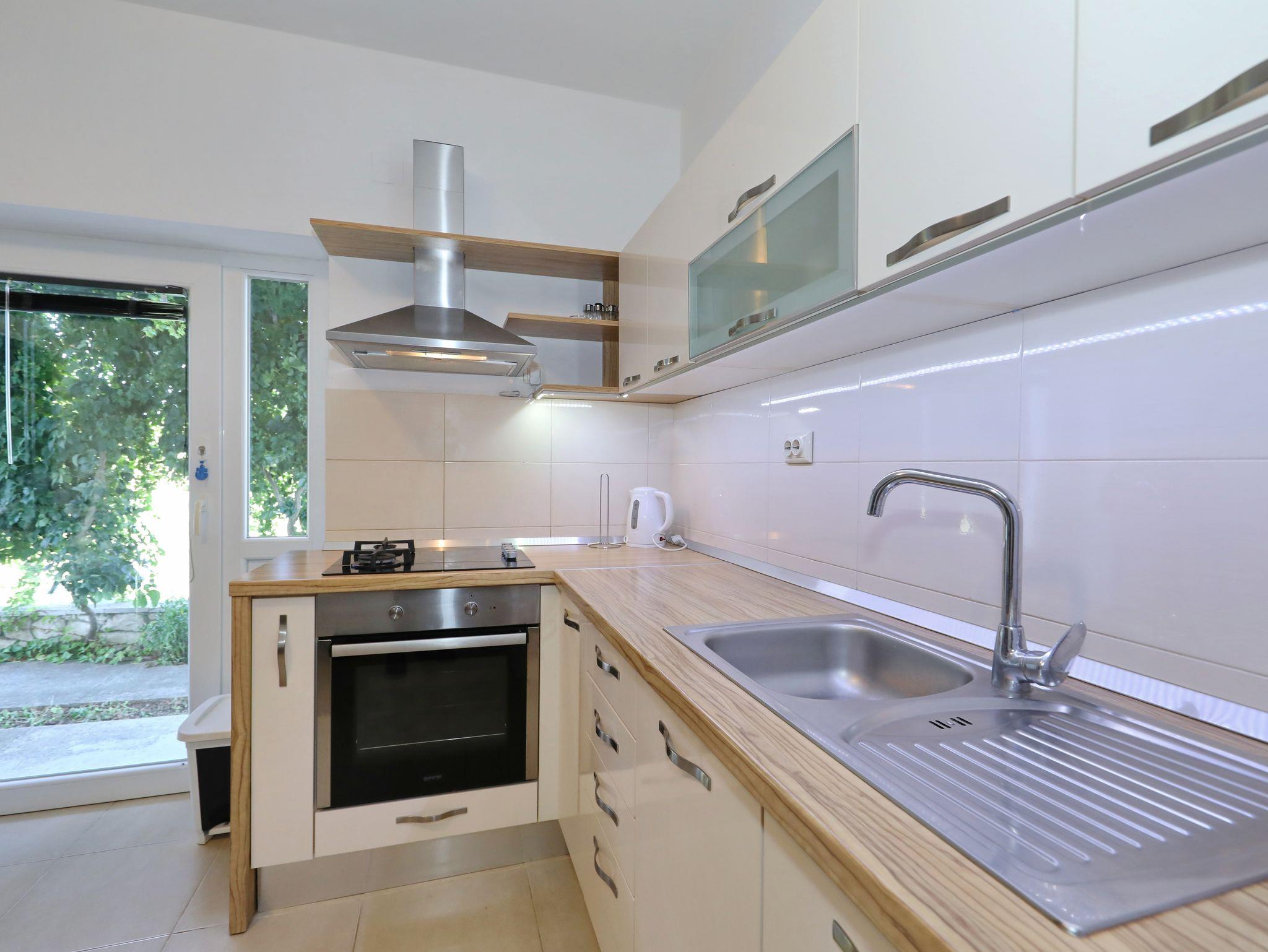 Ferienwohnung bietet Platz für 4 Gäste. Die Betten sind in Schlafzimmern, die es 1 gibt, und in Esszimmer, innerhalb einer Gesamtfläche von 33m2, angeordnet. Die Gäste haben eine eigene Terrasse zur Verfügung, auf der sie in warmen Sommernächten genießen können. Es ist erlaubt, Speisen auf dem Gemeinschafts-Grill vorzubereiten. In der Unterkunftseinheit besteht die Möglichkeit des Mitbringens von Haustieren gegen Aufpreis. IM PREIS INBEGRIFFEN: Kurtaxe, Endreinigung, Klimatisierung, Parkplatz, Internet, Bügeleisen, Bügelbrett, tragbarer Grill. VERBINDLICHE ZUSÄTZLICHE KOSTEN: Aufzahlung für Kurzaufenthalte (prozentualer Zuschlag pro Nächtigungsanzahl: 30% - 1, 20% - 2, 10% - 3). UNVERBINDLICHE ZUSÄTZLICHE KOSTEN: Wäschewaschen (10,00 € Waschen), Bootsanlegeplatz (5,00 € pro Nacht), Haustiere (10,00 € pro Nacht). Die Verfügbarkeit zusätzlicher Dienstleistungen in Ihrem reservierten Termin und die Preise derselben (falls nicht aufgeführt) müssen im Voraus überprüft werden. Zusätzliche Dienstleistungen die in der Zahlungsaufforderung nicht aufgeführt sind werden direkt beim Vermieter bezahlt, angenommen der Gast nutzt auch diese.