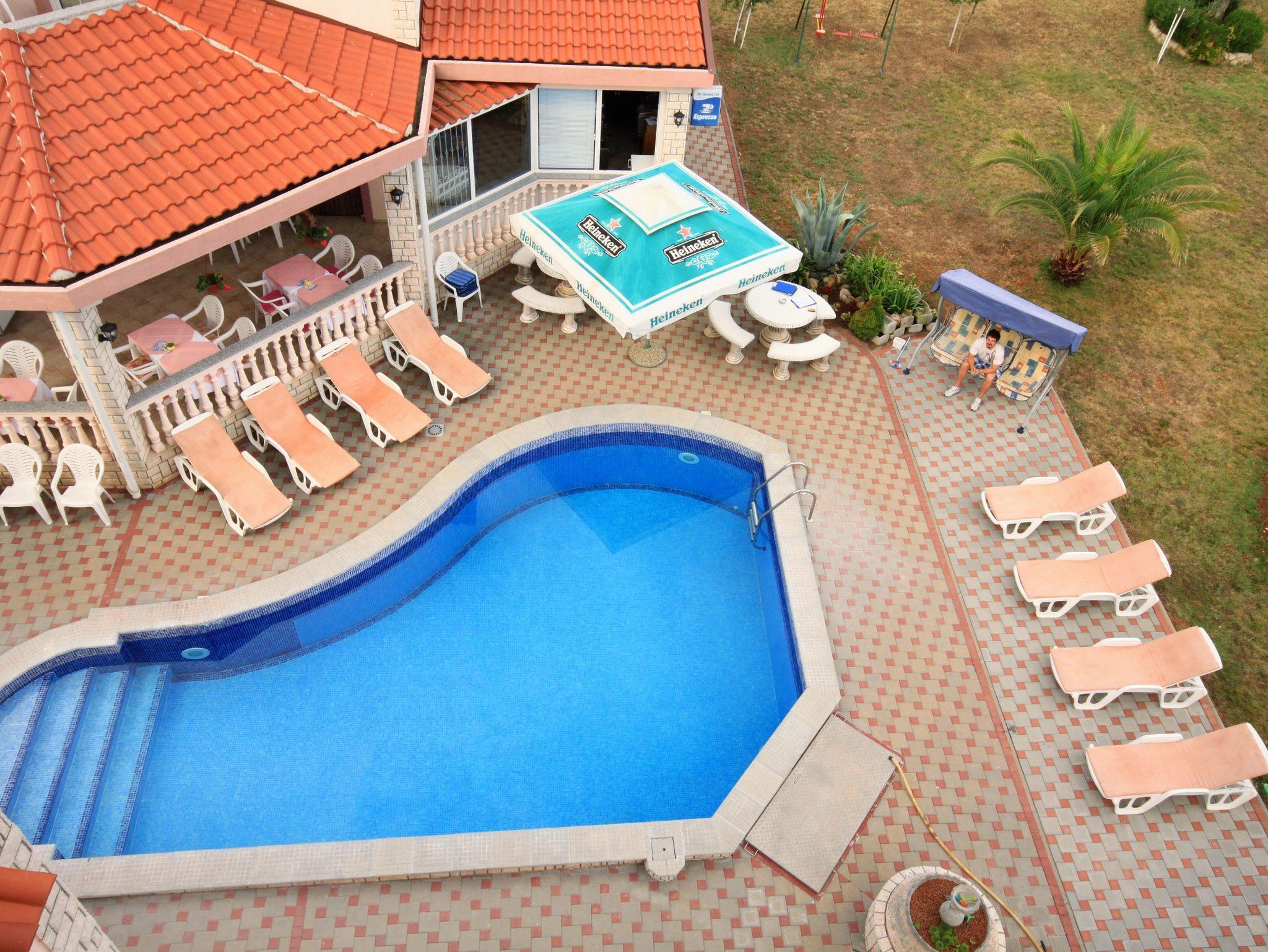 Umgebung des Objekts (Ordentlich), Hof (100m2, Kinderbereich, Sitzbereich), Parkplatz (Anzahl der Parkplätze: 5, Entfernung vom Objekt: im Hof), Parkplatz (Anzahl der Parkplätze: 4, Entfernung vom Objekt: 10 m), Pool: gemeinsam, Dimensionen: 8m x 3.5m x 2m, Wassertyp: Süßwasser, Grill: gemeinsam, Frühstück, Halbpension, Vollpension, WiFi Internet, Föhn, Bügeleisen, Bügelbrett, Sonnenschirm, Liegestühle, Kinderbett