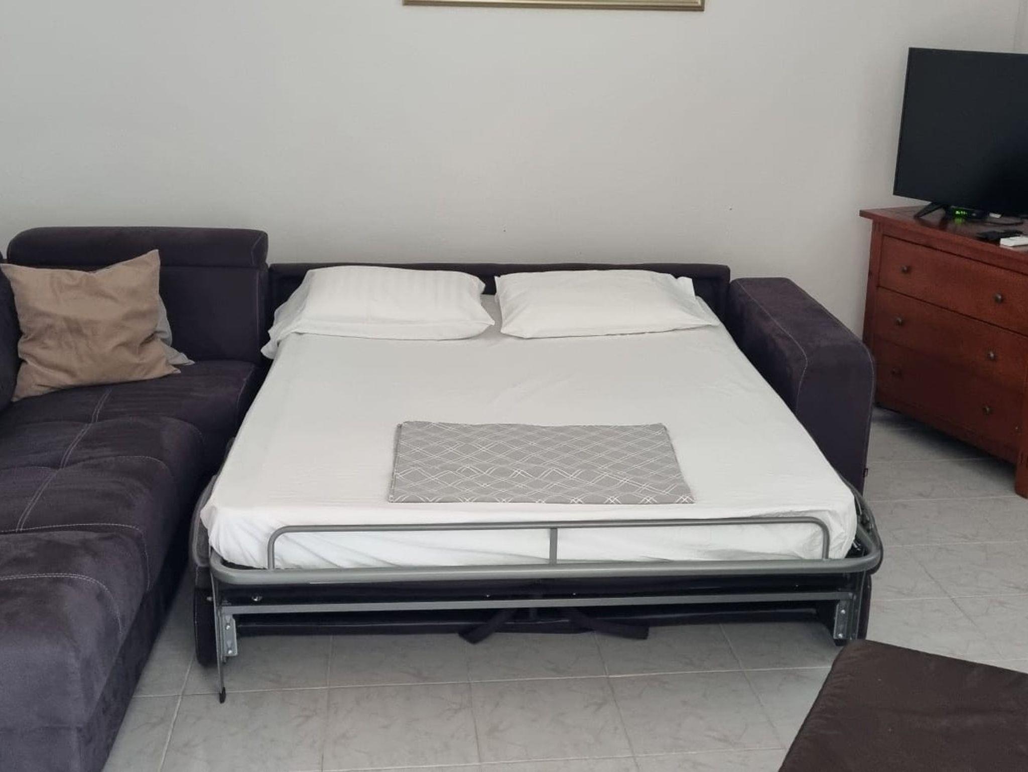 Ferienwohnung bietet Platz für 4 Gäste. Die Betten sind in Schlafzimmern, die es 1 gibt, und in Wohnzimmer, innerhalb einer Gesamtfläche von 54m2, angeordnet. Die Gäste haben eine eigene Terrasse zur Verfügung, auf der sie in warmen Sommernächten genießen können. Das Apartment bietet Meerblick. Es ist erlaubt, Speisen auf dem Gemeinschafts-Grill vorzubereiten. IM PREIS INBEGRIFFEN: Kurtaxe, Endreinigung, Klimatisierung, Parkplatz, Internet, Kinderbett, Föhn. VERBINDLICHE ZUSÄTZLICHE KOSTEN: Aufzahlung für Kurzaufenthalte (prozentualer Zuschlag pro Nächtigungsanzahl: 30% - 1, 20% - 2, 10% - 3). UNVERBINDLICHE ZUSÄTZLICHE KOSTEN: Zusatzbett (5,00 € pro Nacht). Die Verfügbarkeit zusätzlicher Dienstleistungen in Ihrem reservierten Termin und die Preise derselben (falls nicht aufgeführt) müssen im Voraus überprüft werden. Zusätzliche Dienstleistungen die in der Zahlungsaufforderung nicht aufgeführt sind werden direkt beim Vermieter bezahlt, angenommen der Gast nutzt auch diese.