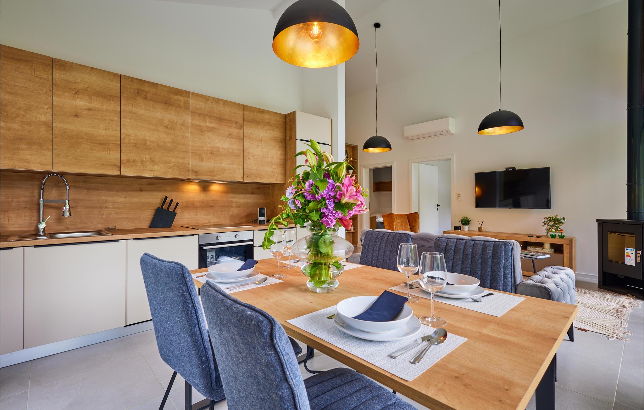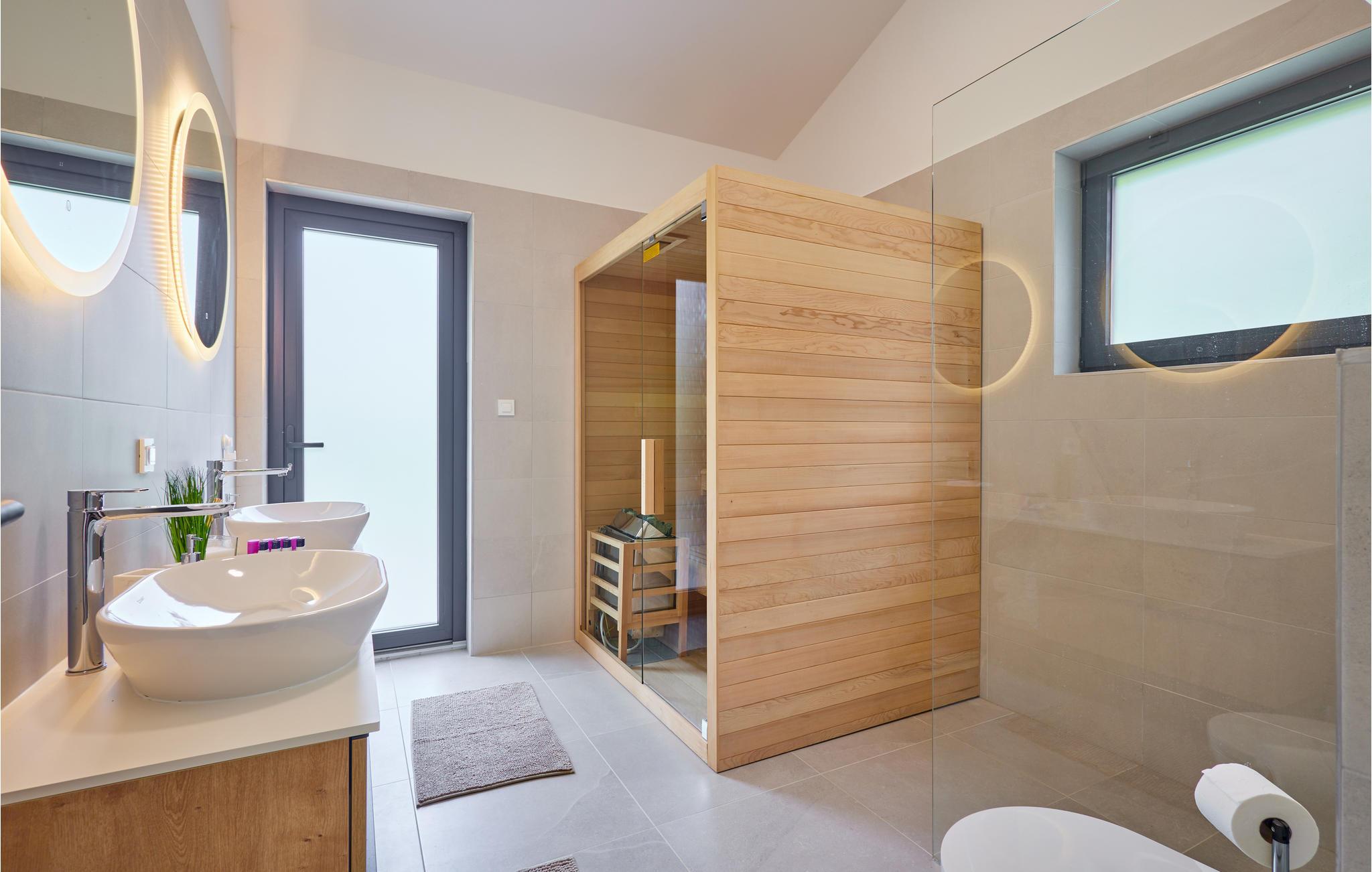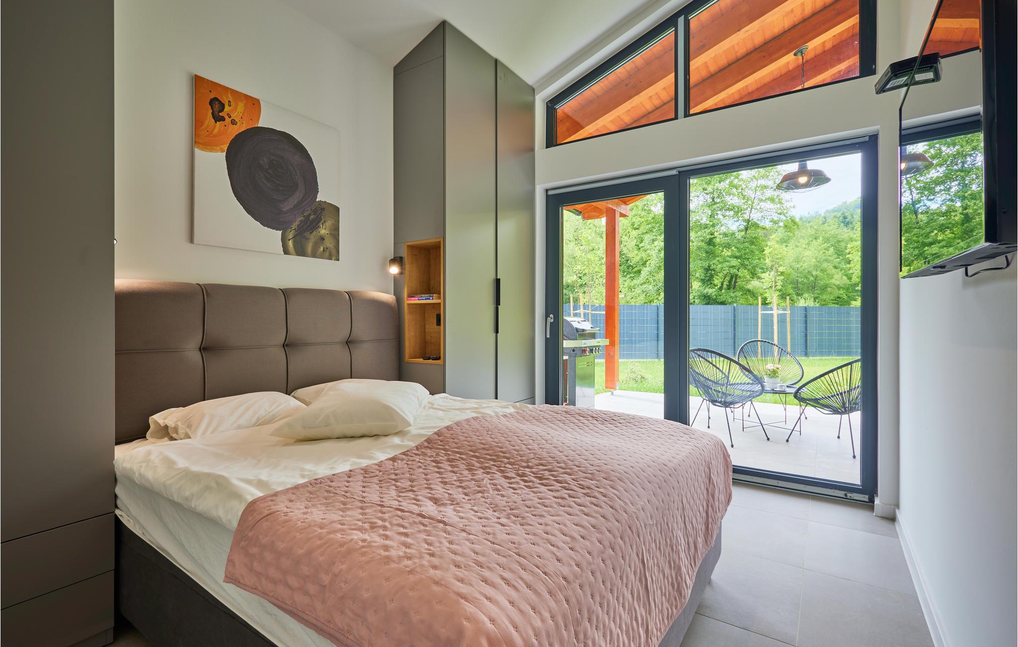 Nyd dette smukke og moderne feriehus i Brezova Gora med sauna og jacuzzi. Denne komfortable og lyse bolig byder velkommen på en ejendom med tre huse på en stor grund, der er smukt anlagt og omgivet af natur. Hvert hus har sit privatliv og en separat grund omgivet af en hæk. Indenfor kan du nyde det moderne og smagfulde design og trives i den åbne stue med store panoramavinduer. Slap af om aftenen med en knitrende åben ild og en underholdende film eller afslut de milde sommeraftener med grillmad på terrassen. Du kan tilbringe den sene aften i boblebadet under stjernehimlen. Oplev omgivelserne og den rolige beliggenhed, som er ideel til en afslappende ferie med børn. Dine små vil også nyde den fælles legeplads og udendørs aktiviteter. Tag dine vandresko på eller tag din cykel, fordi der er talrige vandre-, vandre- og cykelruter. Besøg Trakošcan-slottet og lad din sjæl dingle ved søen af samme navn. Glæd dig til badeudflugter eller forfølge din hobby med fiskeri. Oplev det omkringliggende område med talrige slotte og besøg Varaždin, talrige kurbyer med termalvand og vandland. Du kan også nyde det rige udbud af lokale retter og vine i tavernerne. Glæd dig til en afslappende og uforglemmelig ferie i dette skønne feriehus!