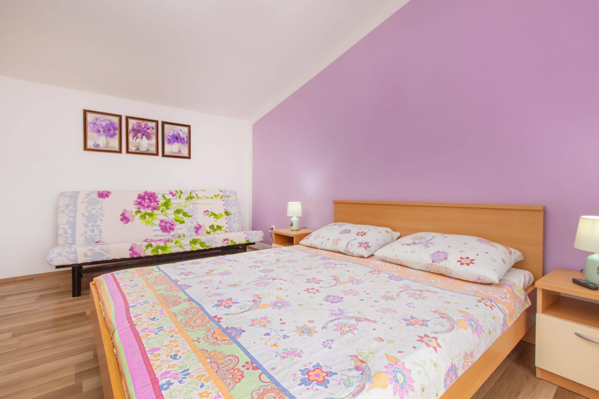 Denne indbydende lejlighed tilbyder et praktisk og komfortabelt tilflugtssted for familier eller små grupper, med plads nok til at rumme op til seks gæster. Soveindretningen inkluderer et soveværelse med en queensize seng og en ekstra seng, og et andet med to enkeltsenge plus en ekstra seng. Gæsterne kan nyde brugen af en privat balkon og et fælles haveområde, mens ét kæledyr er tilladt mod et natligt gebyr. Et fladskærms-satellit-tv, aircondition og en privat parkeringsplads er inkluderet, hvilket gør denne lejlighed til en velafrundet mulighed for sommerophold. Lejligheden har en bekvem beliggenhed i Tribunj, kun 200 meter fra Adriaterhavet og 450 meter fra den nærmeste sandstrand. Et supermarked ligger kun 210 meter derfra, og populære lokale spisesteder såsom Konoba Bepo ligger inden for gåafstand. Tribunj bymidte kan nås inden for 650 meter og tilbyder en blanding af charme og bekvemmelighed. For dem, der er interesserede i natur og udforskning, ligger Krka Nationalpark 27 km derfra, Vrana-søen ligger 37 km derfra, og Zadar Lufthavn ligger cirka 69 km fra ejendommen. Yderligere faciliteter omfatter et fuldt udstyret køkken med komfur, ovn, mikroovn og kaffemaskine, som er ideelt til at tilberede måltider under dit ophold. Lejligheden har også vigtige husholdningsfaciliteter såsom et strygebræt, førstehjælpskasse og rengøringsmidler. Opvarmning er tilgængelig i vintermånederne og faktureres baseret på forbrug. Gæster er velkomne til at bruge de fælles grillfaciliteter i gården, hvilket bidrager til det hjemlige og funktionelle miljø, denne lejlighed byder på.