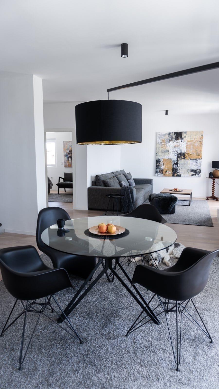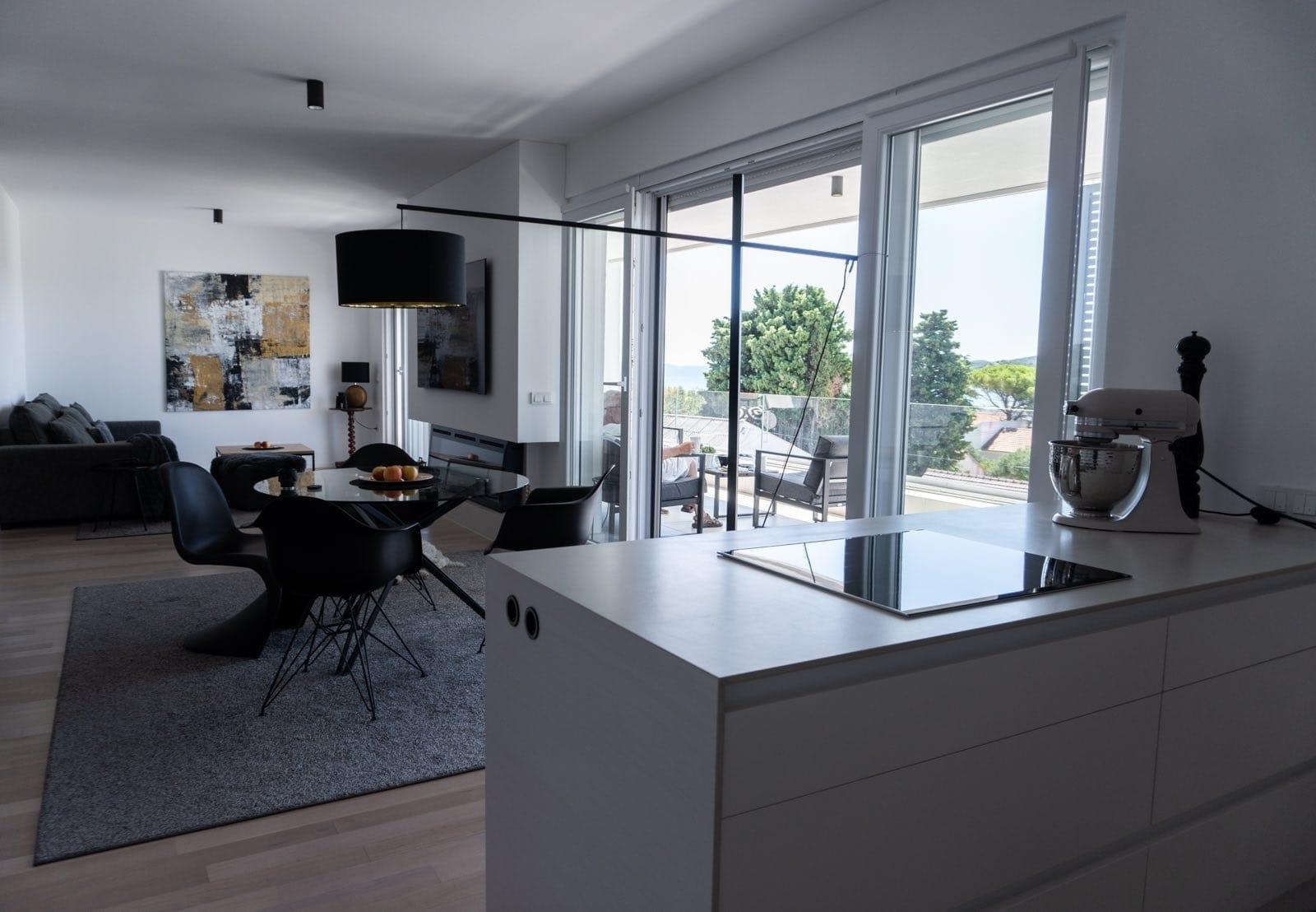-offener Koch-Ess- und Wohnbereich mit Meerblick, rundem Glas-Esstisch + 5 Stühlen, große, bequeme Couch