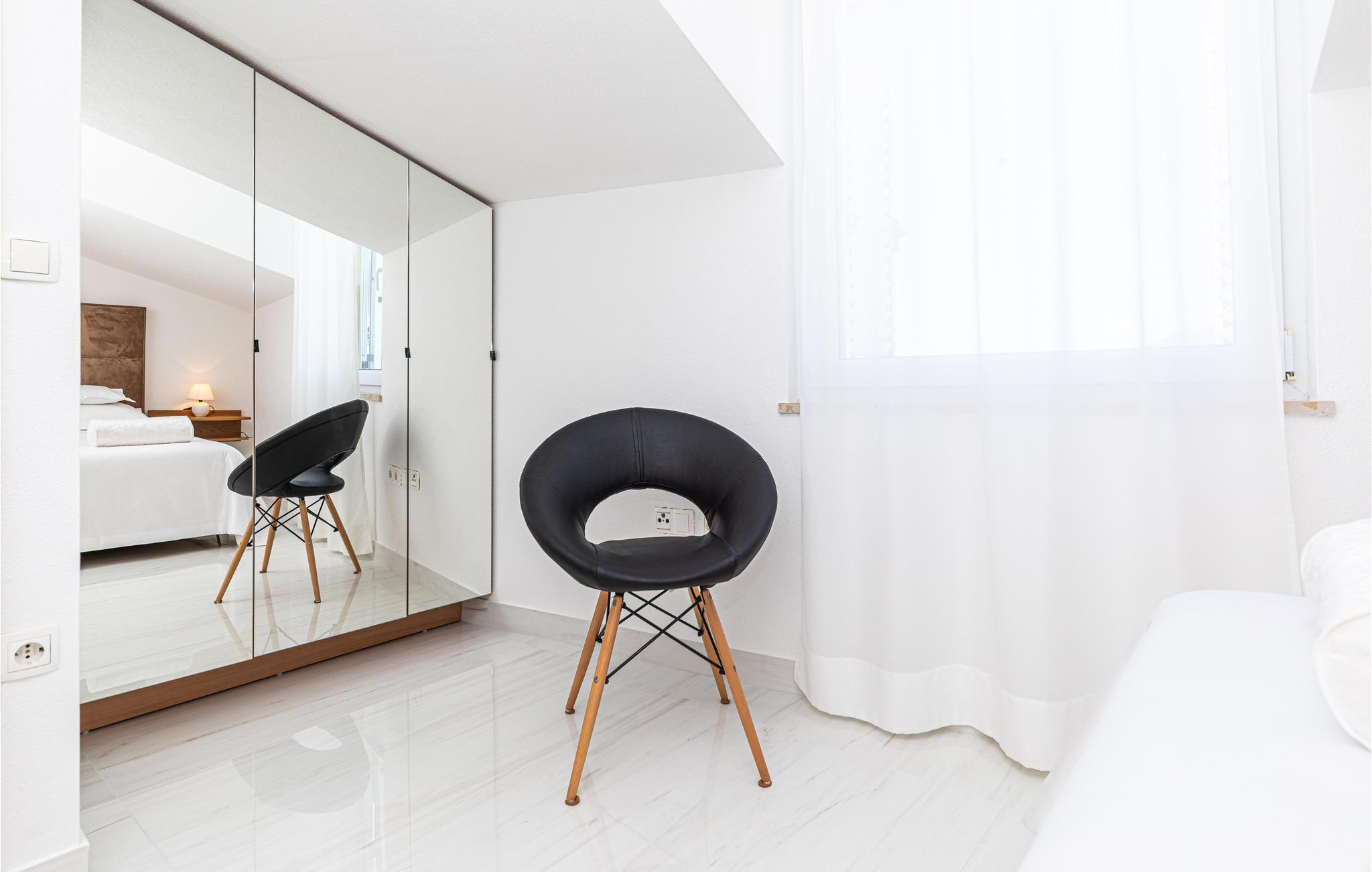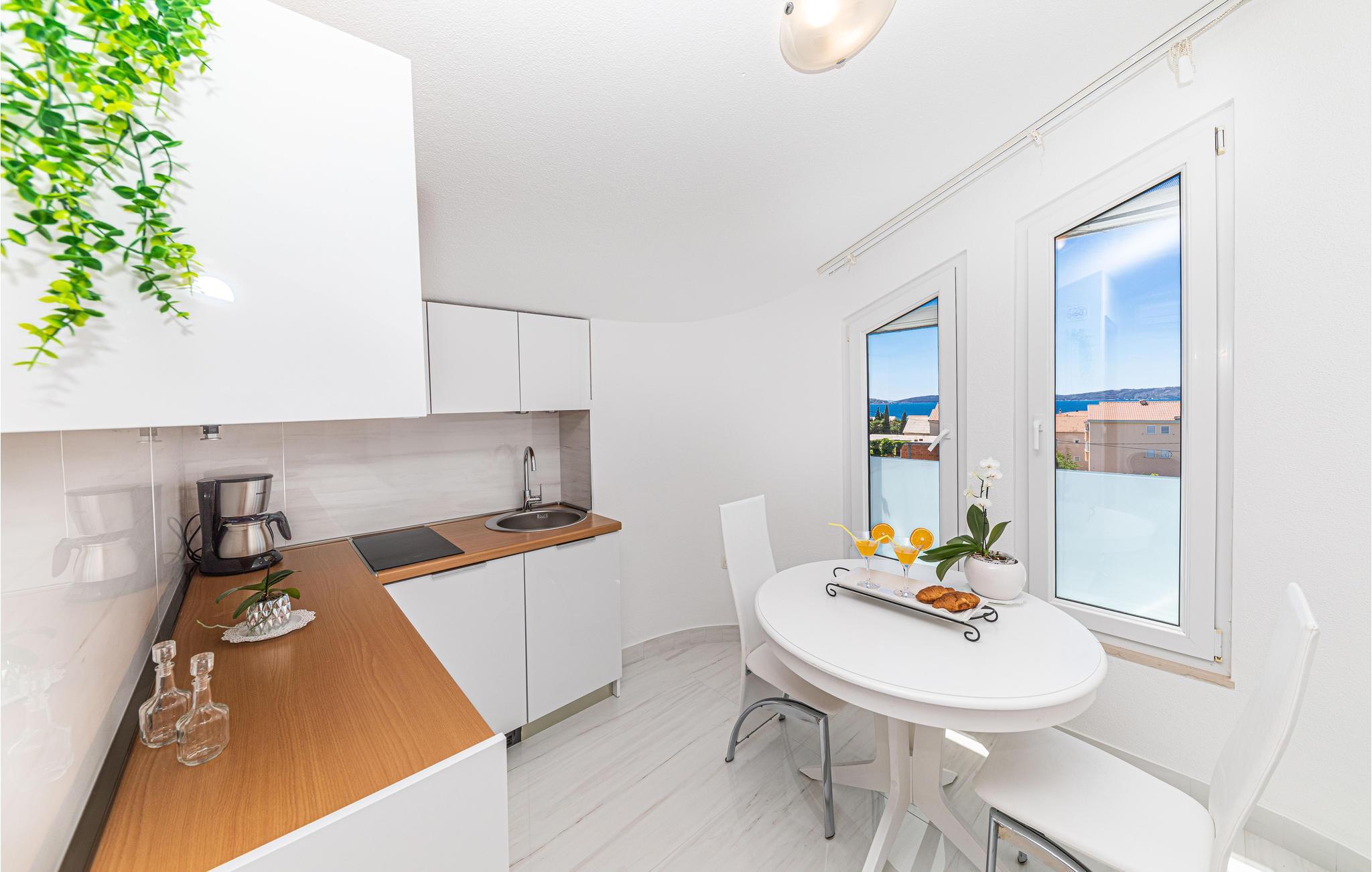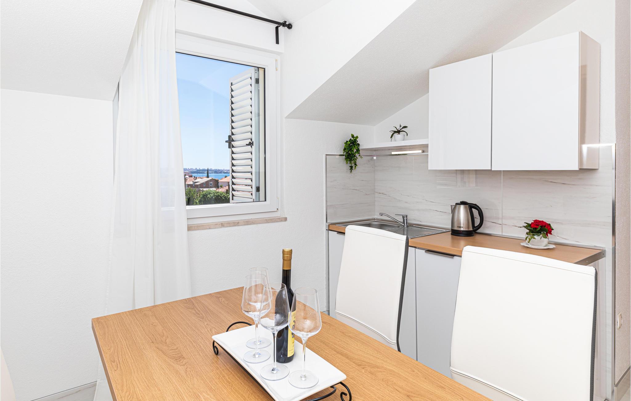 Denne skønt indrettede ferielejlighed ligger på anden sal i et privat hus, som den eneste lejlighed der benyttes til feriegæster. Lejligheden er delt op i to enheder, der er forbundet via en gang. Den ene afdeling er S3, der er en lille lejlighed med køkken og eget badeværelse. Laveste loftshøjde er 170 cm. I stueplan er der terrasse med grill til rådighed. Nyd solen og havet ved den nærliggende strand som I kan gå til på få minutter. Besøg byerne Trogir og Split som er rige på kultur, seværdigheder og sommerarrangementer.