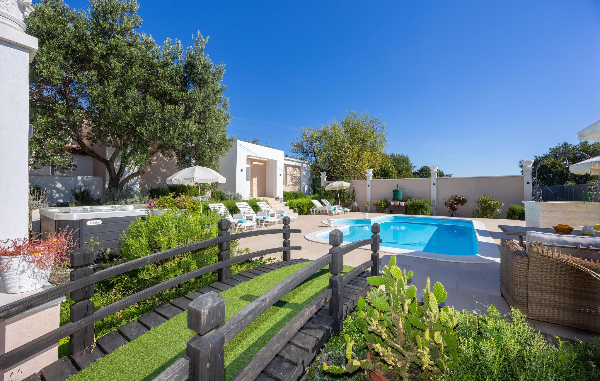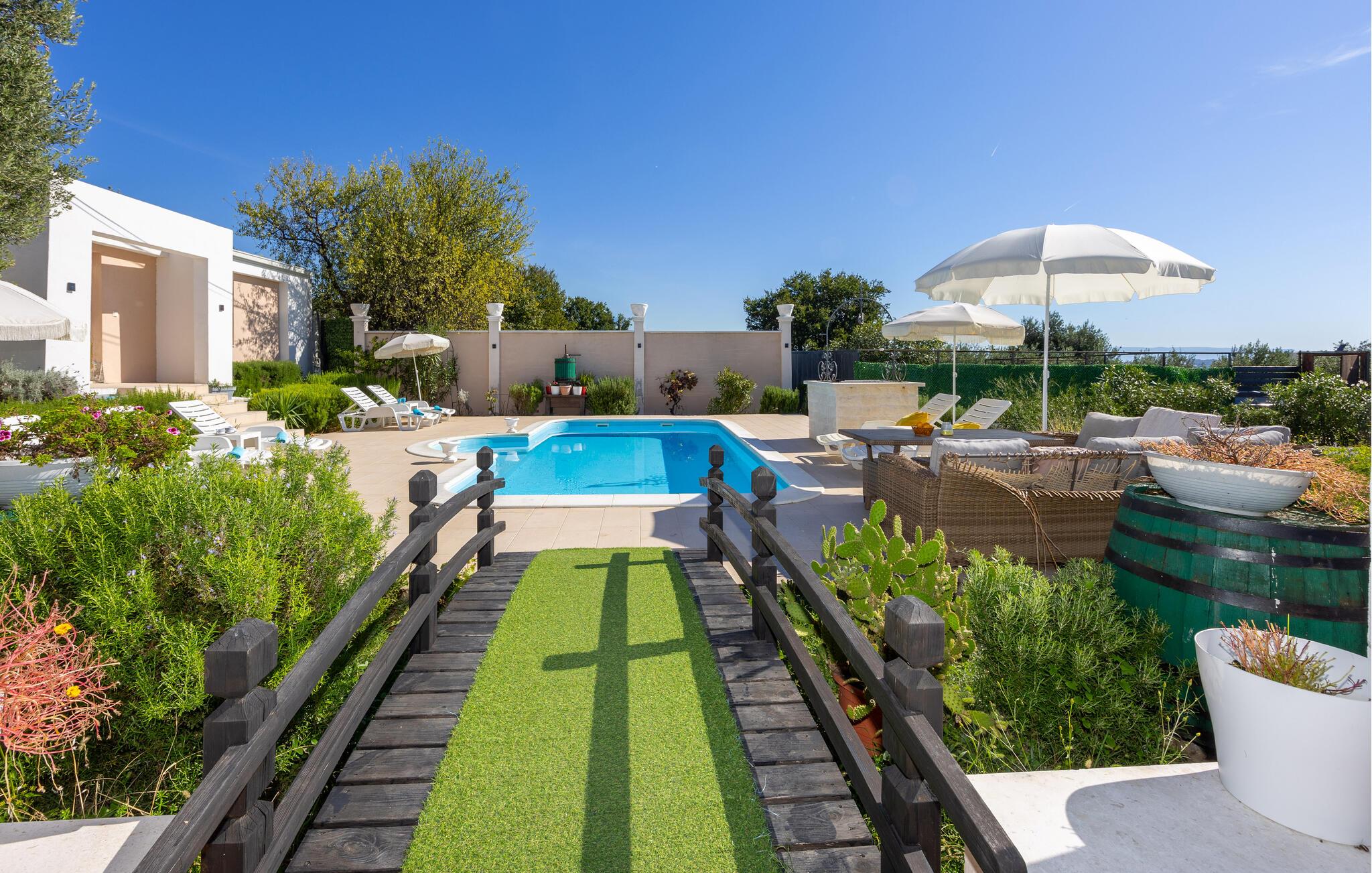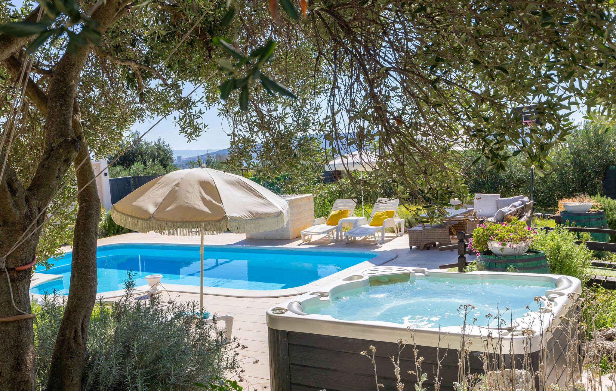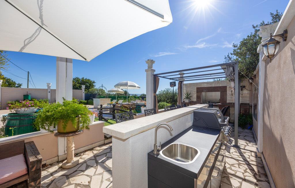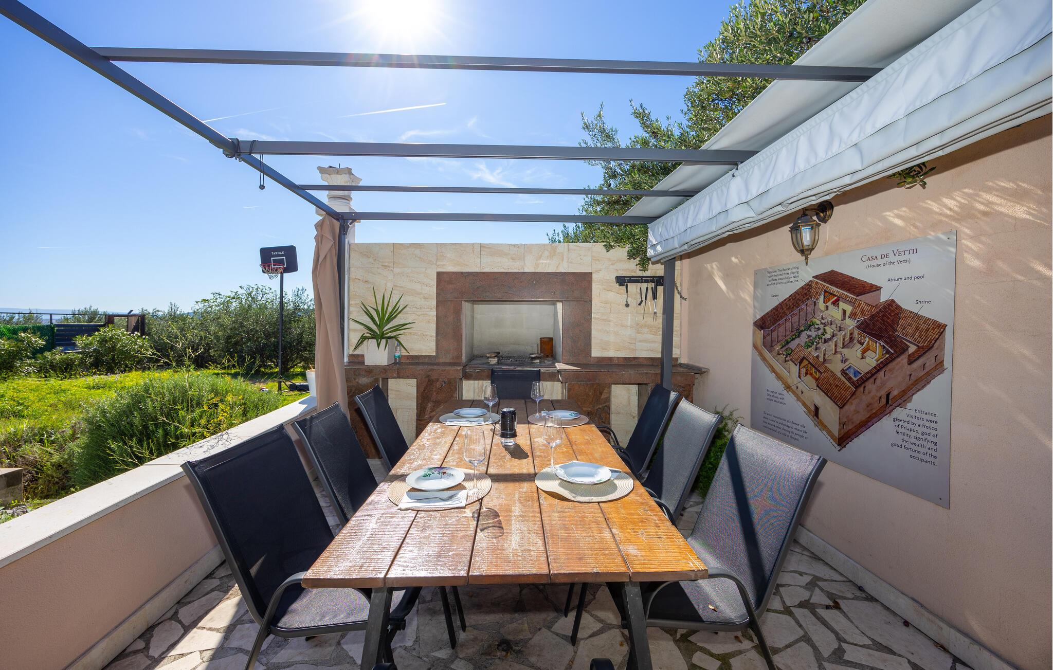 Huset rummer et køkken med spisestue, fire soveværelser, tre badeværelser og et ekstra wc. Det er moderne og komfortabelt indrettet. Huset ligger i rolige omgivelser hvorfra der er en betagende udsigt over Kaštelabugten. Besøg også de nærliggende byer Trogir og Split, med mange skønne restauranter, mange kulturelle og historiske seværdigheder og talrige former for underholdning i sommermånederne. Huset er bygget i stil med den romerske 'Villa Rustica', da det ligger i et arkæologisk område med den oprindelige romerske villa.