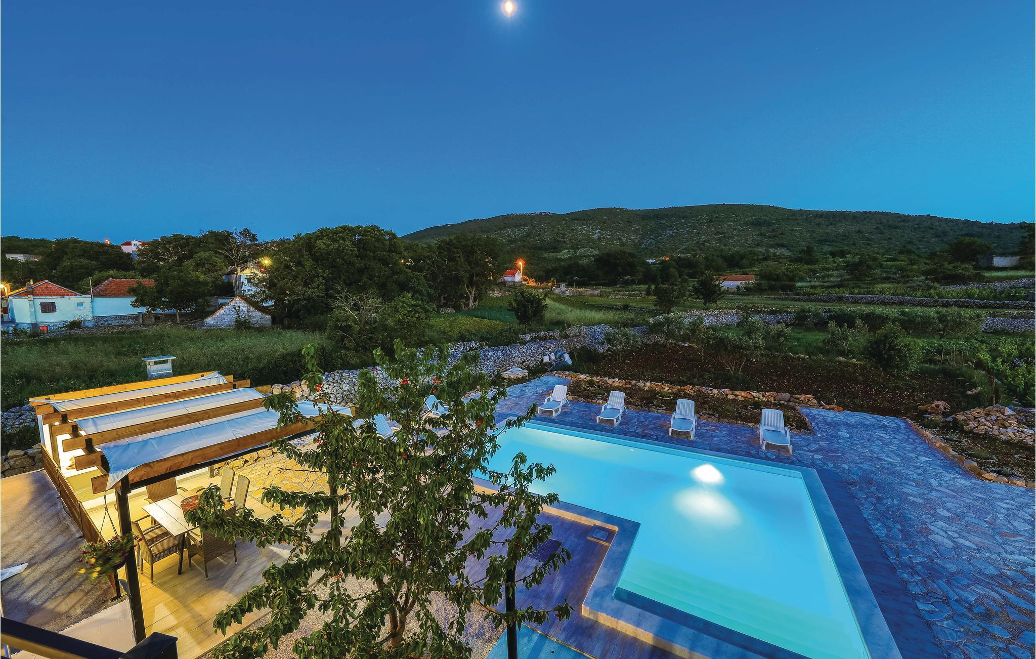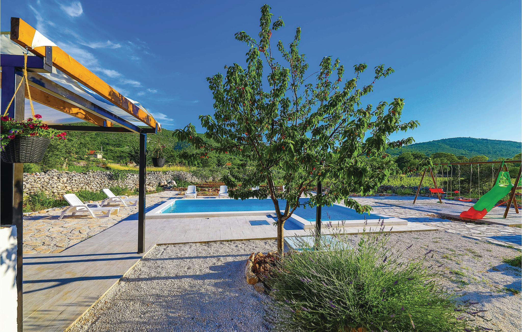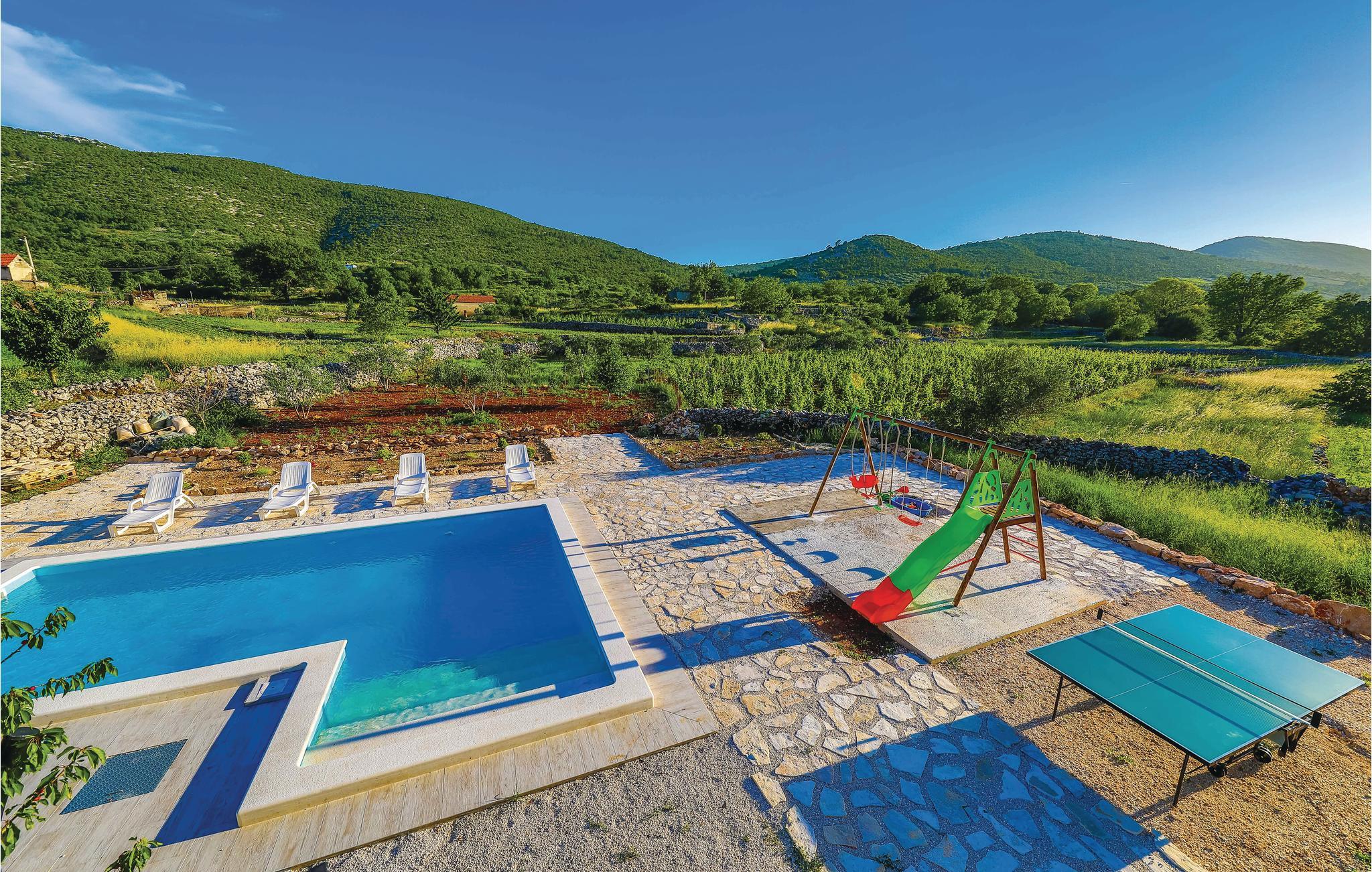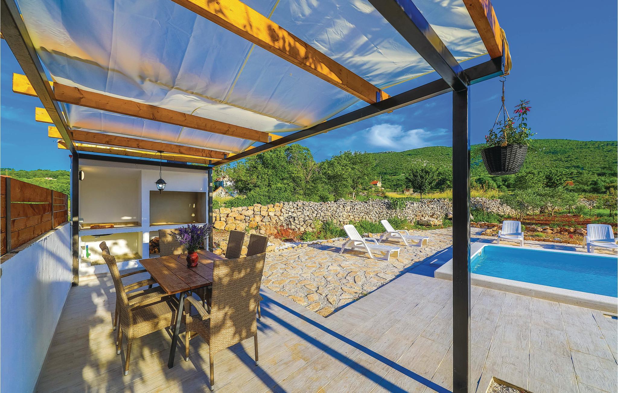 Dette skønne dalmatiske feriehus med pool ligger i den lille by Ljubitovica i Trogirs bagland. Flygt fra byens larm og uro og hold jeres fredelige familieferie her. Slap af på den overdækkede terrasse med grill og forfrisk jer i poolen, mens børnene leger ubesværet på den indhegnede grund. Riv jer også løs fra ferieparadiset og besøg den gamle bydel med mange former for kultur og historie, samt den livlige riviera med fremragende restauranter og barer i de maleriske byer Split og Trogir.