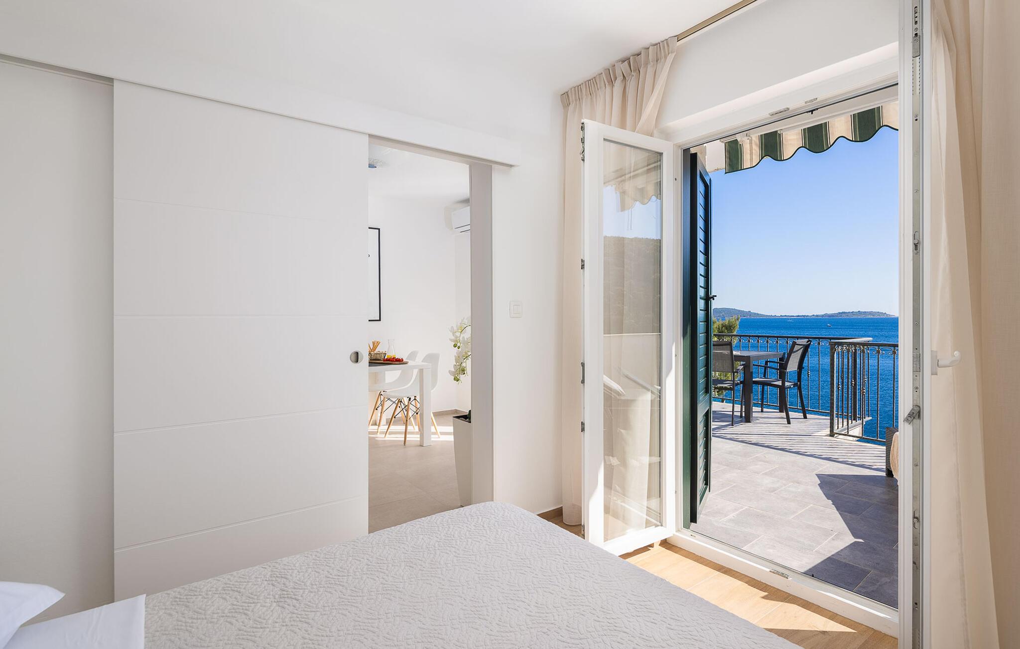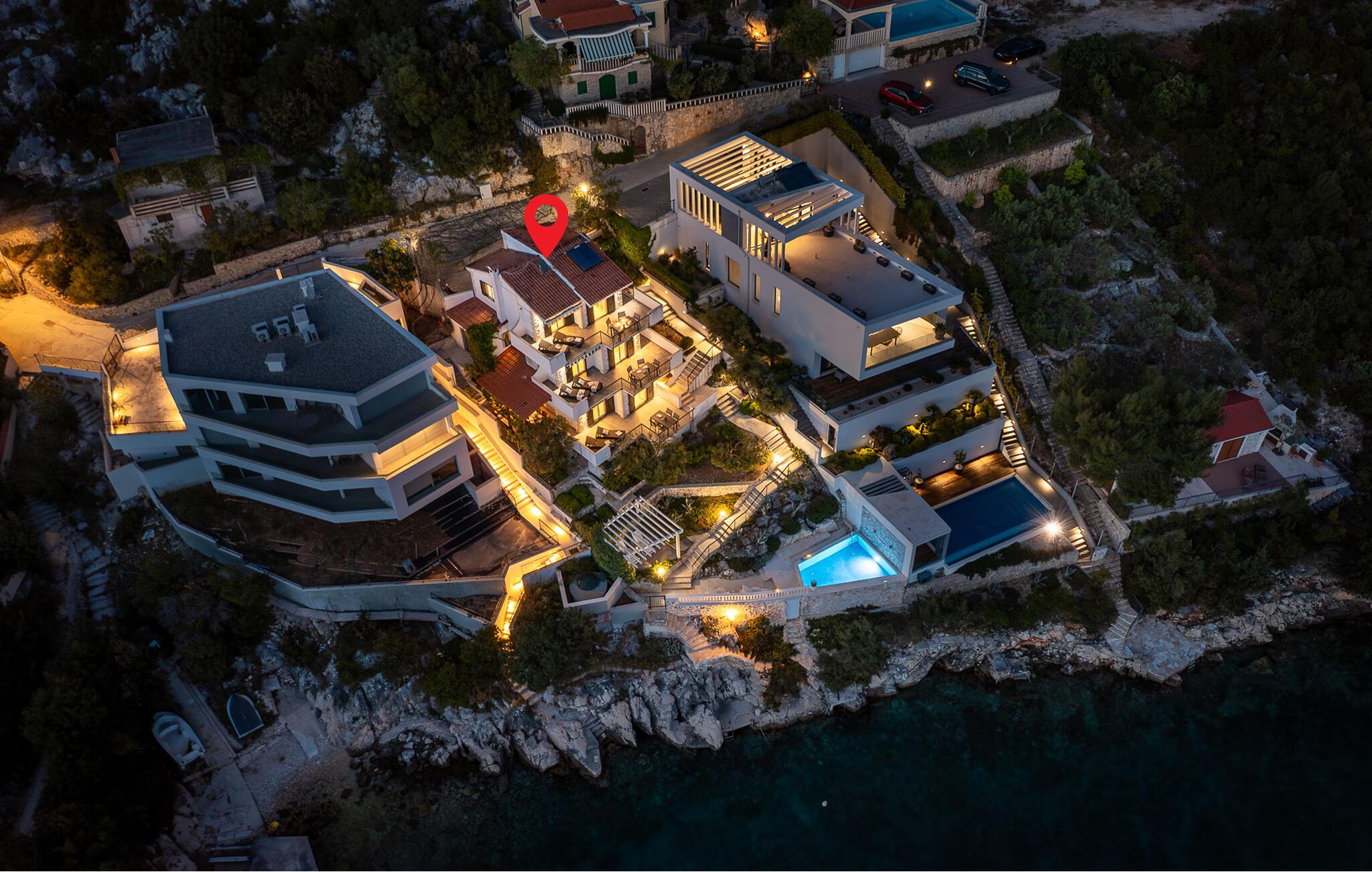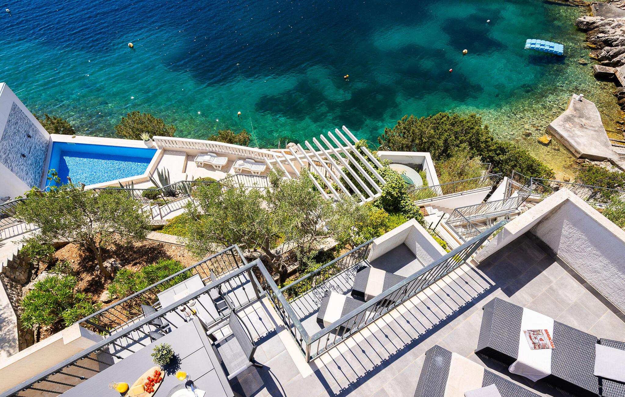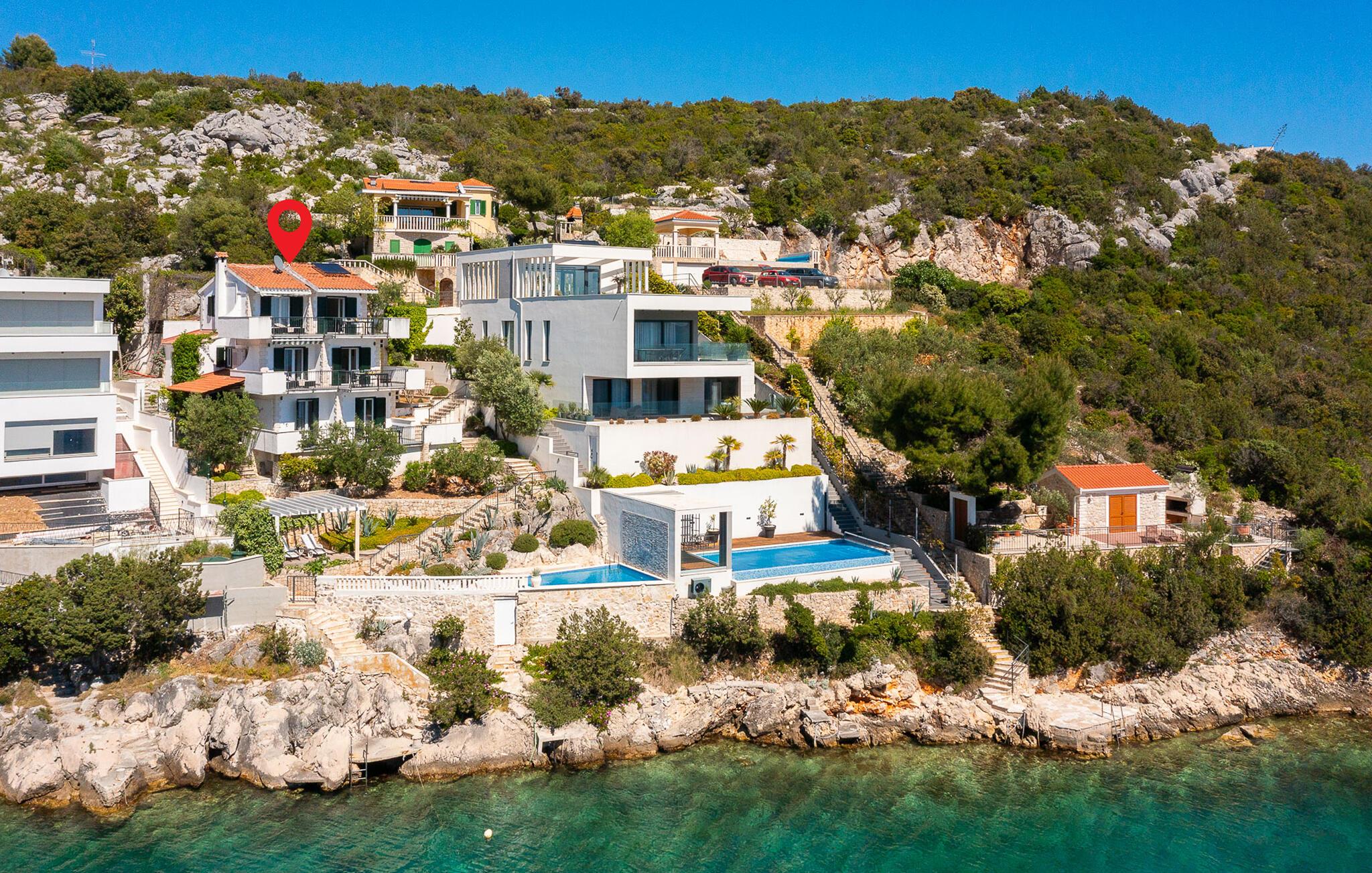 Slap af langt væk fra hverdagens forpligtelser i dette skønne feriehus i Mellemdalmatien. I huset er der tre lejligheder, der er forbundet med en udendørs trappe. Til hver lejlighed hører der en terrasse med skøn havudsigt, som og skøn at lade blikket hvile på mens morgenkaffen nydes – eller når dagen er ved at være slut og I slappe af sammen og snakker om alt hvad der er sket. Tag en svømmetur i husets dejlige udendørs pool med havvand eller gå ad trapperne ned til stranden og svøm i havet. I en omkreds af 30 km ligger der to byer der er med på UNESCOs verdenskulturarvsliste: Split med Diokletian palads og Trogir med en smuk historisk bykerne. Ljubljevas skønne bugt og disse ferielejligheder, giver garanti for at I kan slappe af og få masser af ny energi. Bådeanlægsplads mod gebyr.