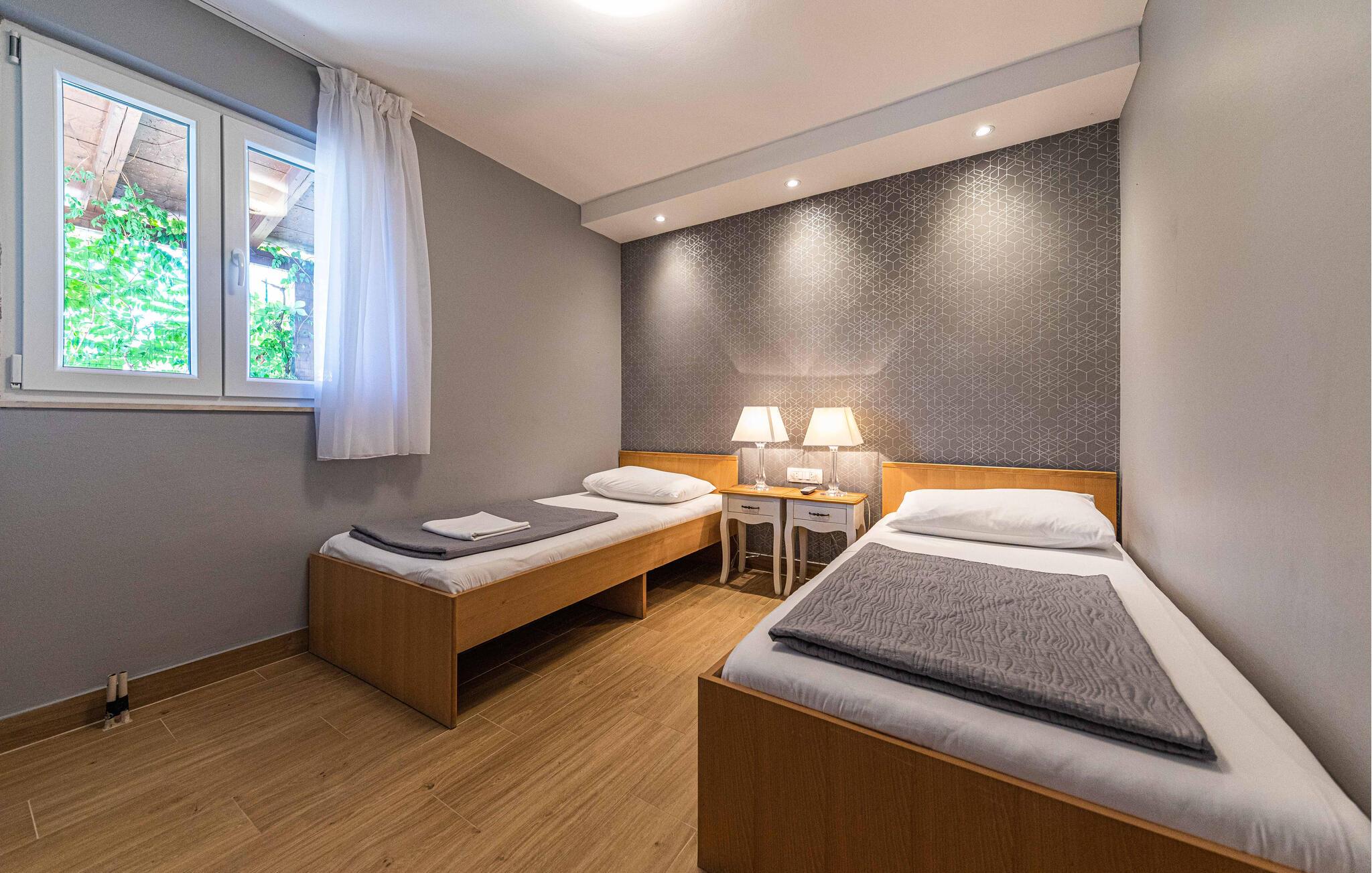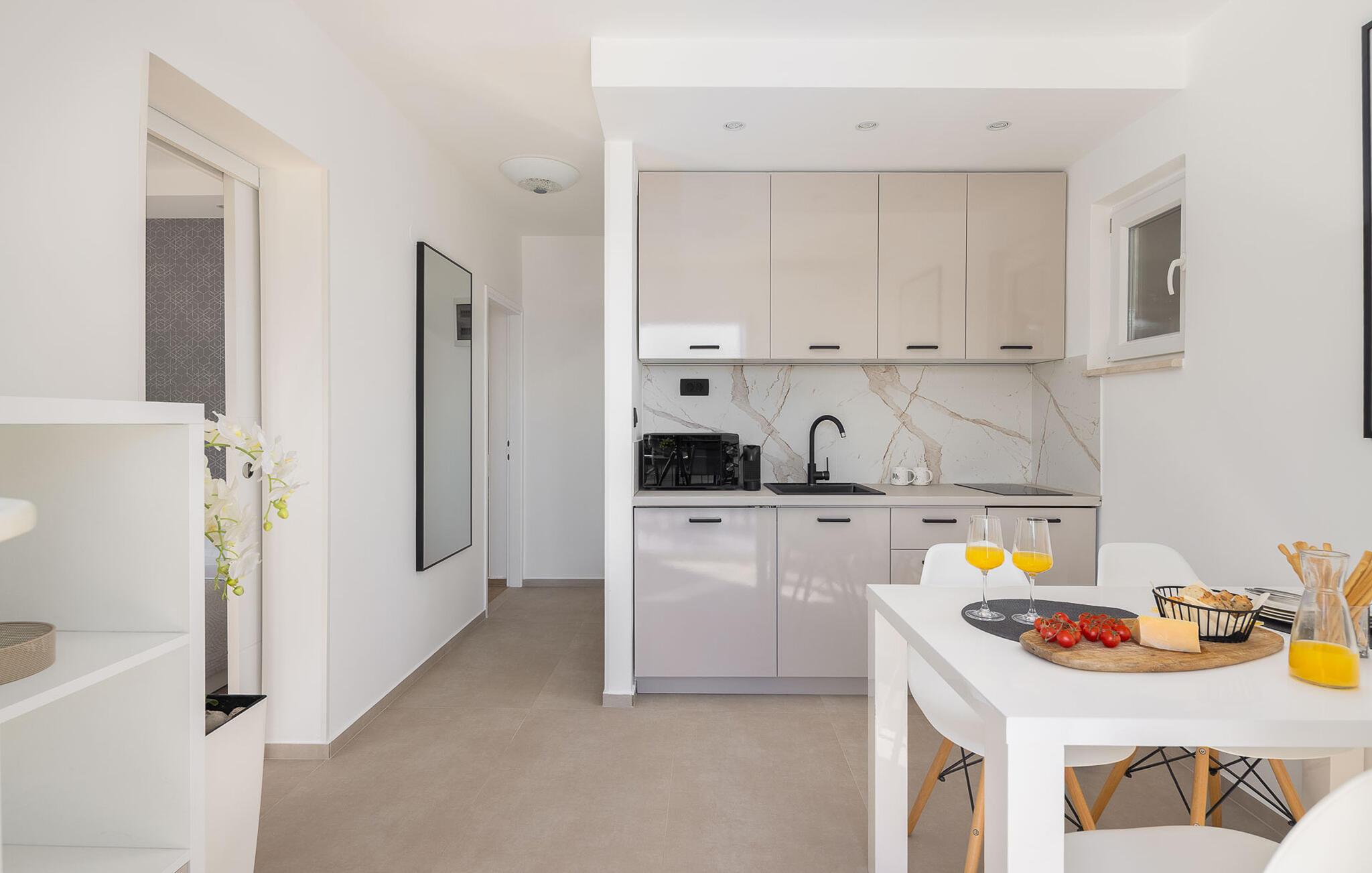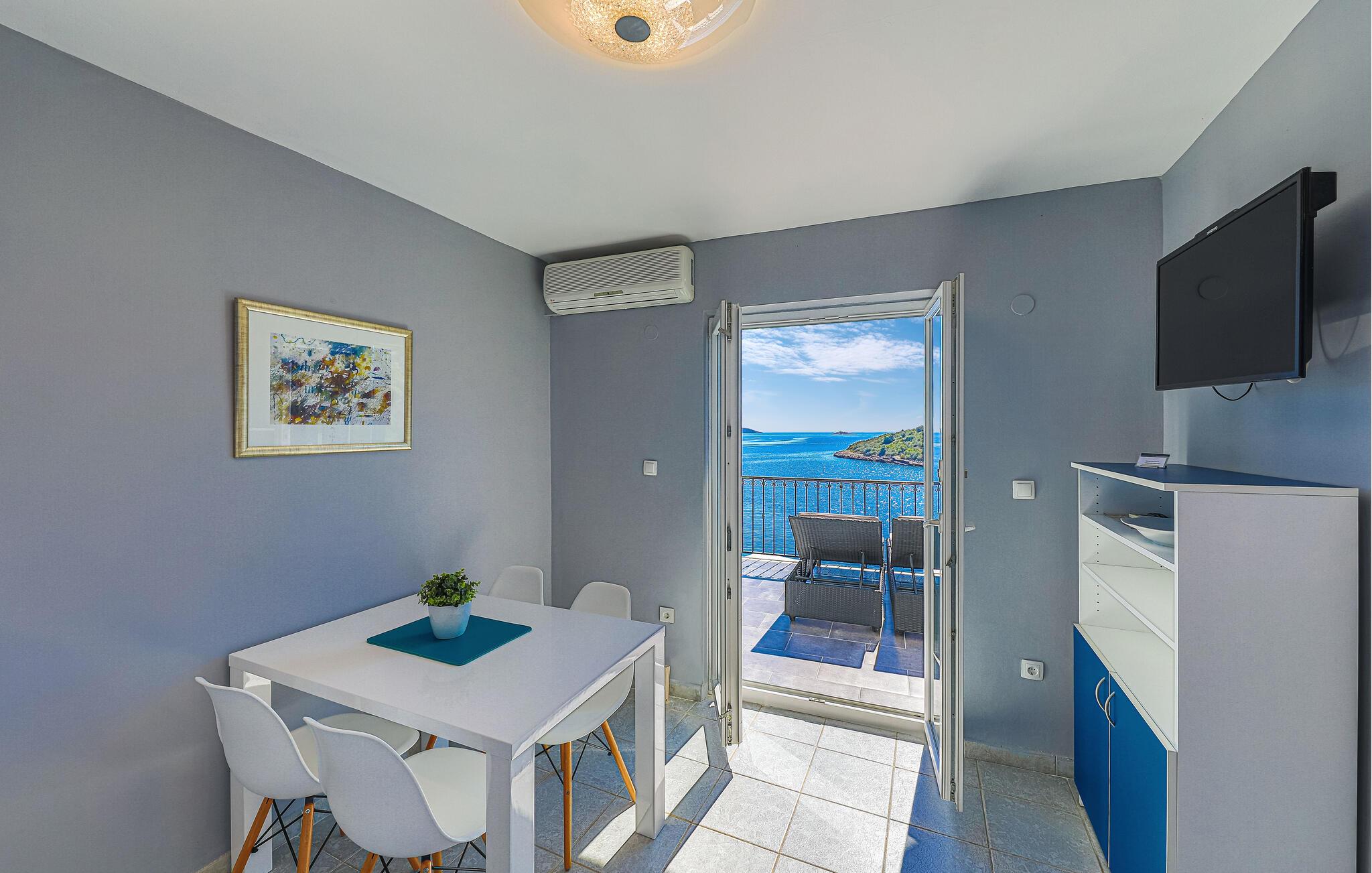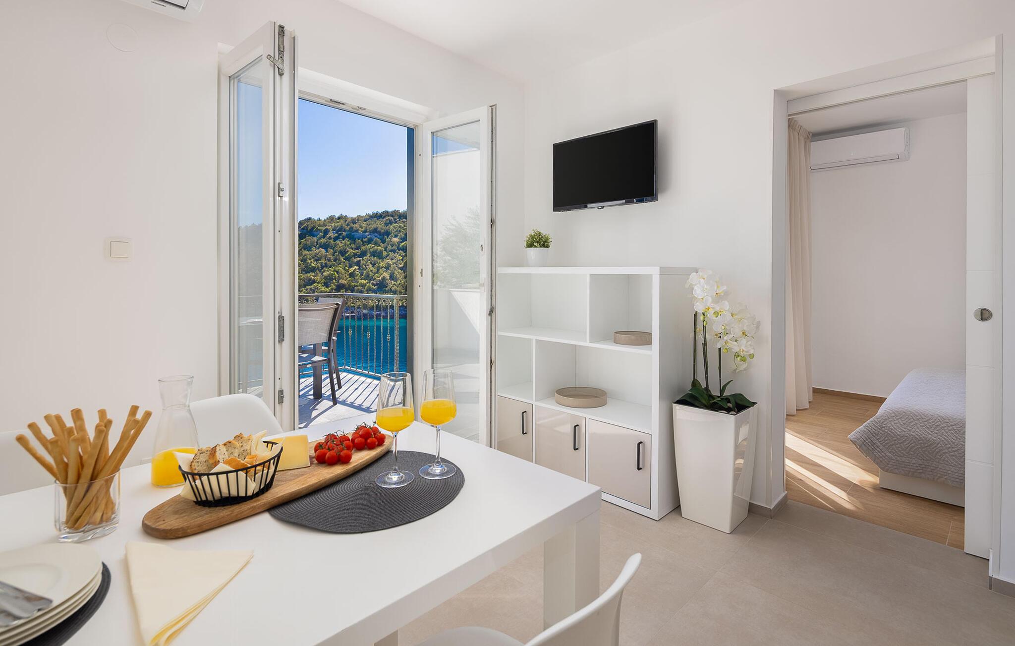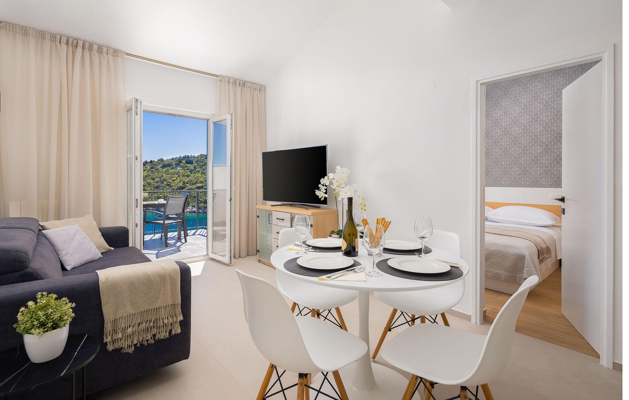 Slap af langt væk fra hverdagens forpligtelser i dette skønne feriehus i Mellemdalmatien. I huset er der tre lejligheder, der er forbundet med en udendørs trappe. Til hver lejlighed hører der en terrasse med skøn havudsigt, som og skøn at lade blikket hvile på mens morgenkaffen nydes – eller når dagen er ved at være slut og I slappe af sammen og snakker om alt hvad der er sket. Tag en svømmetur i husets dejlige udendørs pool med havvand eller gå ad trapperne ned til stranden og svøm i havet. I en omkreds af 30 km ligger der to byer der er med på UNESCOs verdenskulturarvsliste: Split med Diokletian palads og Trogir med en smuk historisk bykerne. Ljubljevas skønne bugt og disse ferielejligheder, giver garanti for at I kan slappe af og få masser af ny energi. Bådeanlægsplads mod gebyr.