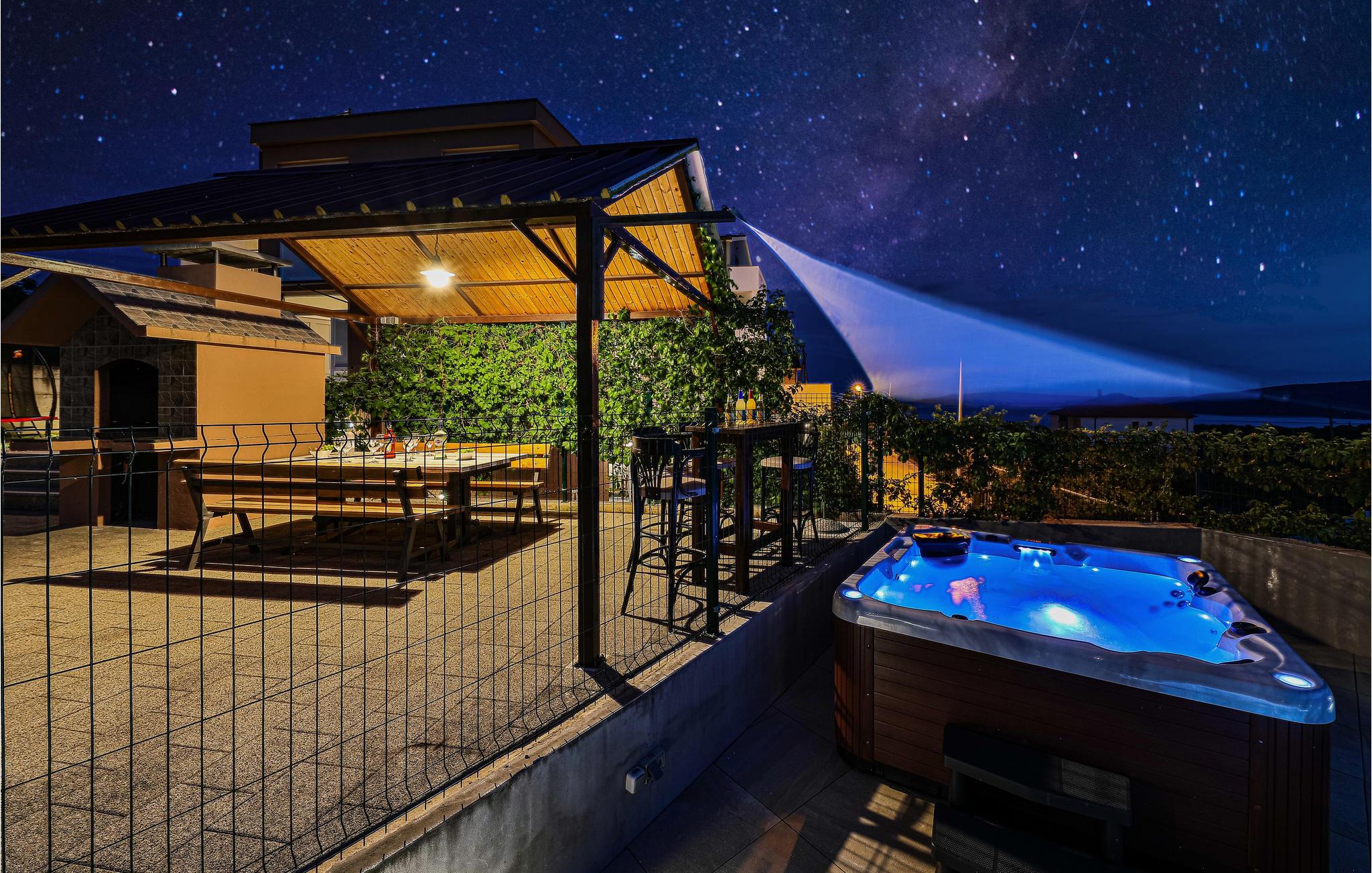 Foran feriehuset findes det dejlige poolområde med den forfriskende pool og det lækre spabad. På terrassen er der lavet et overdækket område med en stor muret grill, hvor I kan tilberede lækre middage og holde hyggelige komsammener med gode snakke om, hvordan dagen er gået og måske planlægge morgendagens program.