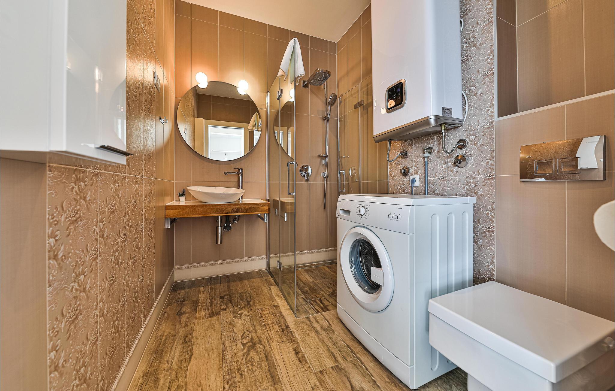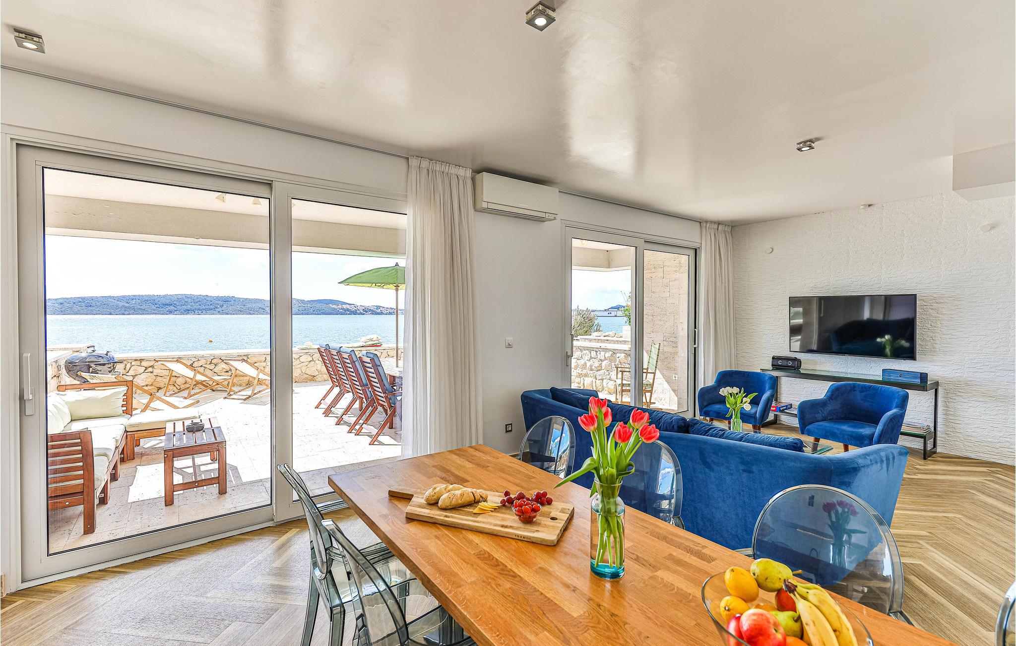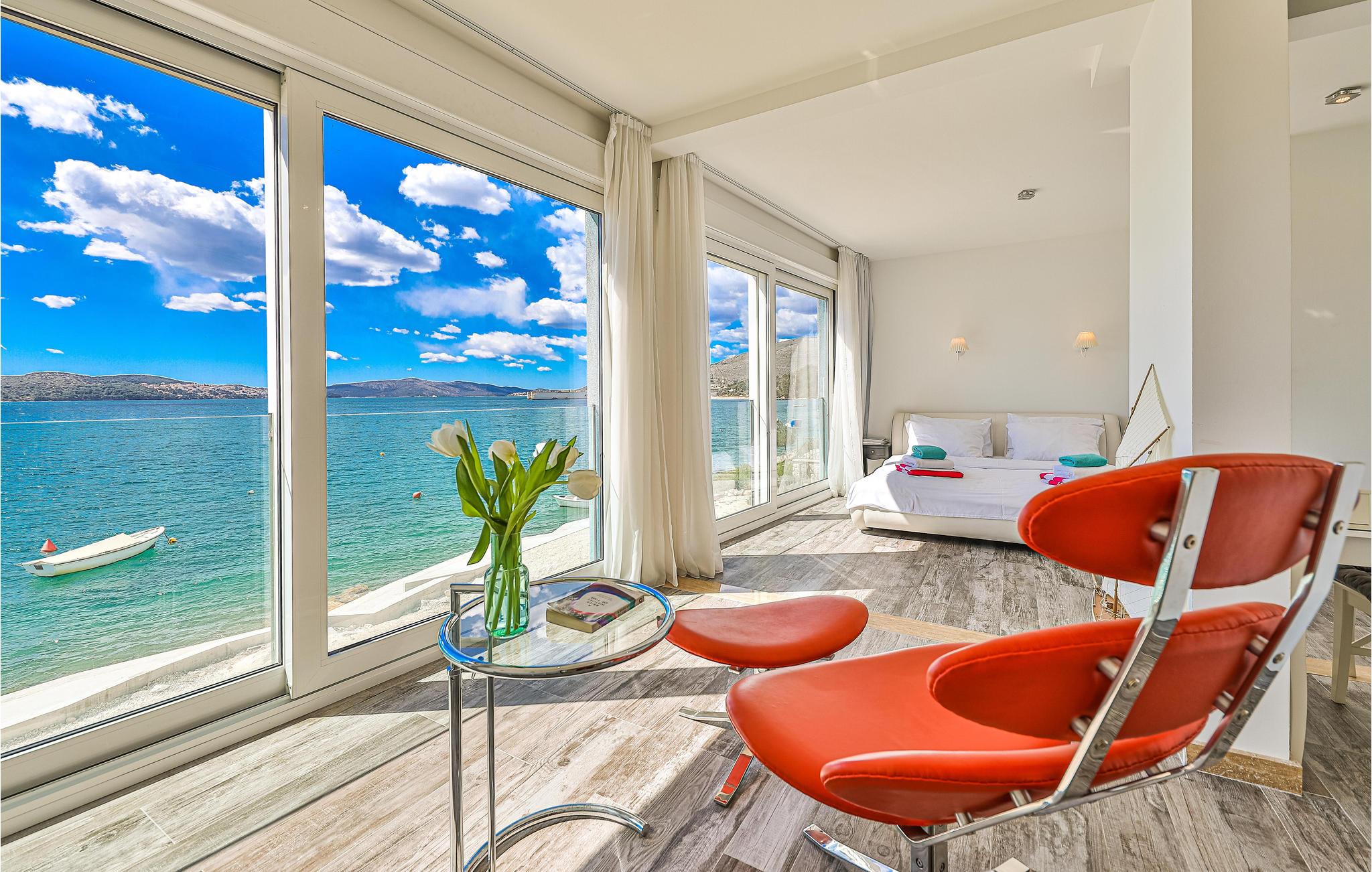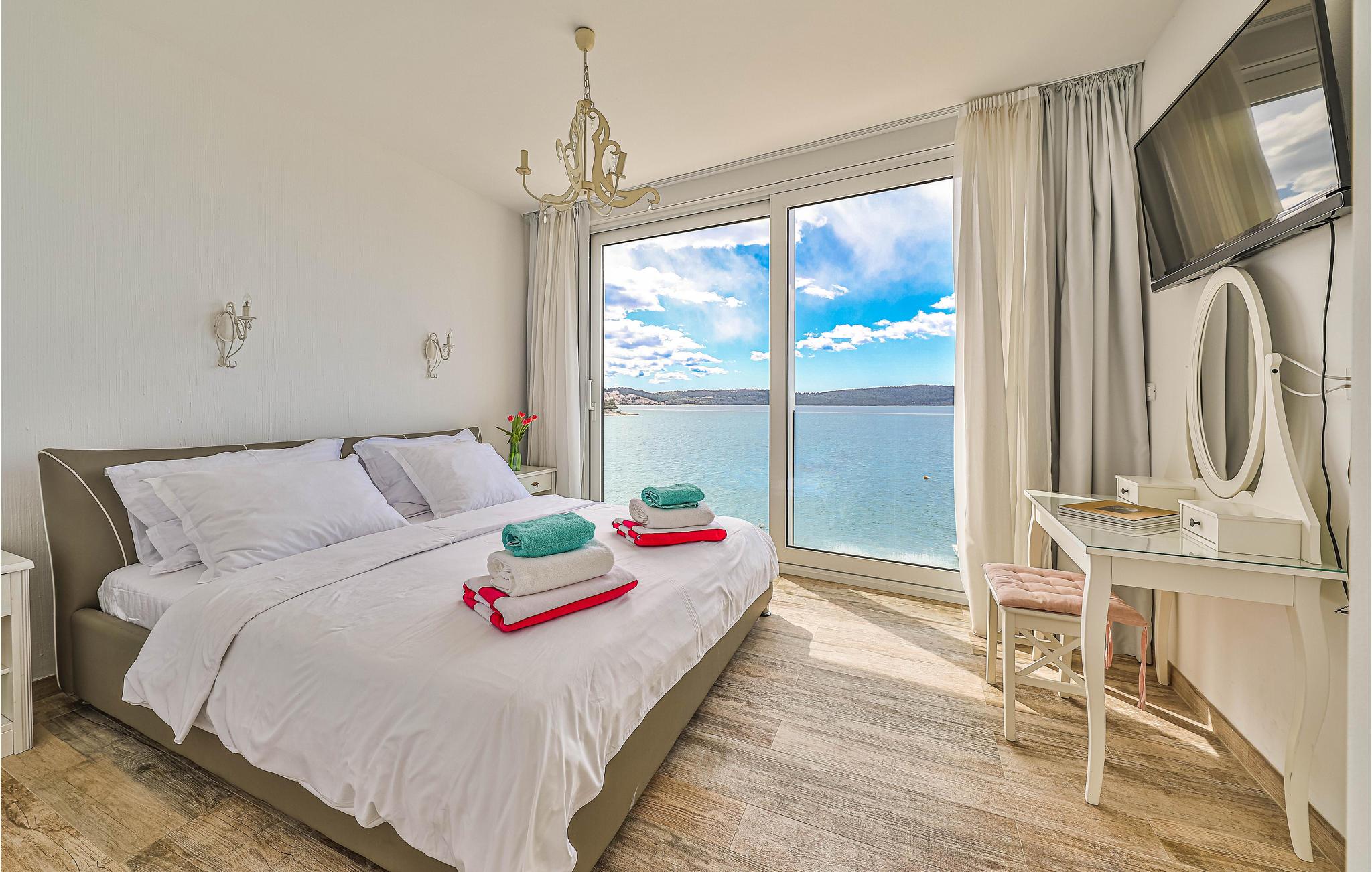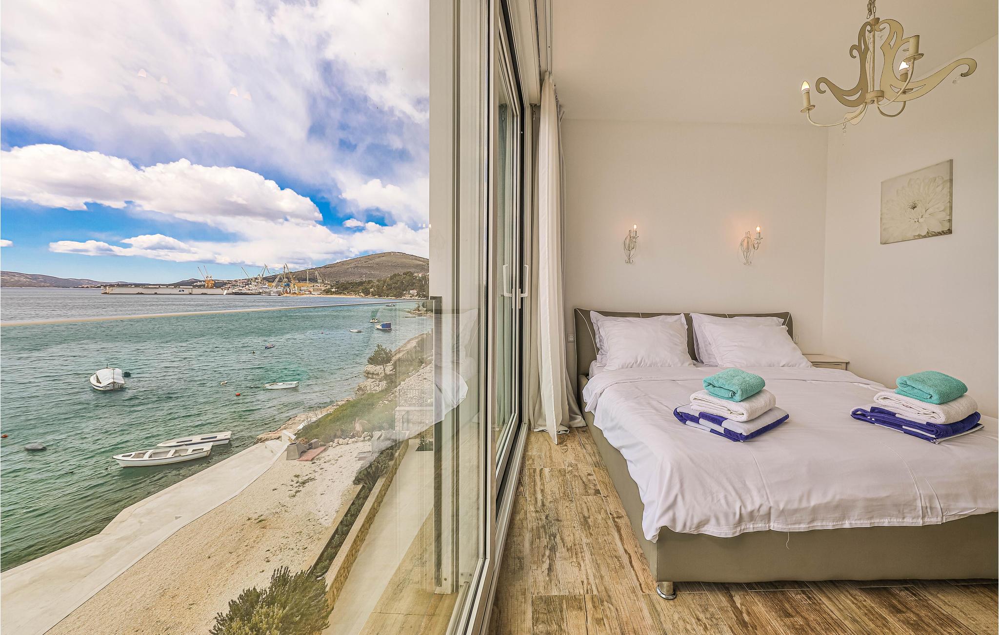 Denne eksklusive villa nyder godt af sin fremragende beliggenhed, lige ved stranden og med fortryllende panoramaudsigt. Huset er opført i moderne arkitektur og byder på enorme glasruder med panoramaudsigt fra alle værelser. I stueplan er der et køkken i åben forbindelse med den store stue, spisestue og yderligere gæstewc, mens der på første sal er et soveværelse med et badeværelse, et toilet og en sauna og ikke mindst en terrasse med betagende udsigt over havet. På anden sal er der to soveværelser med badeværelser, og på tredje sal er der et soveværelse med badeværelse. Der er klimaanlæg overalt og gulvvarme i badeværelserne. Lige i nærheden er der en børnevenlig kiesstrand. Gå en tur gennem Trogir, hvor der er mange fritidsaktiviteter til en underholdende og aktiv ferie.