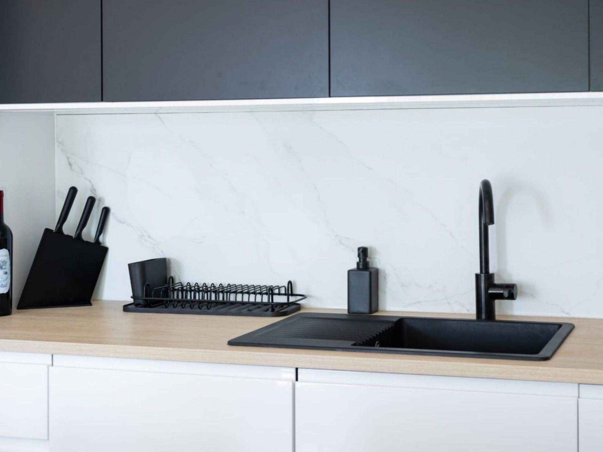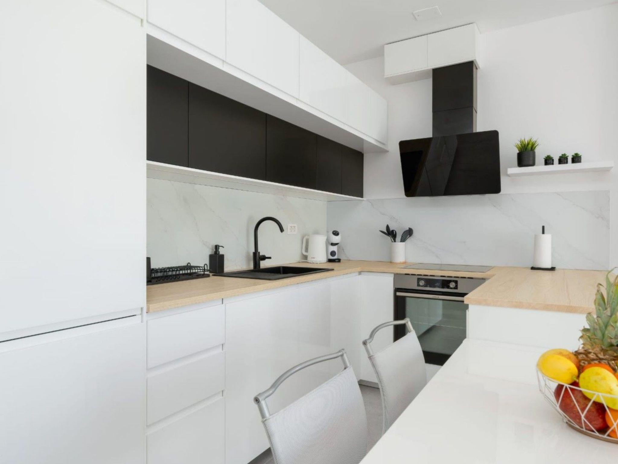 Charmingly furnished and carefully designed open concept living room with a comfortable sofa makes a perfect lounge area, while the fully equipped kitchen provides everything you need for preparing your favorite meals. The kitchen has access to the balcony, equipped with an outdoor table and chairs, where guests can enjoy the views of the town and the sea.
