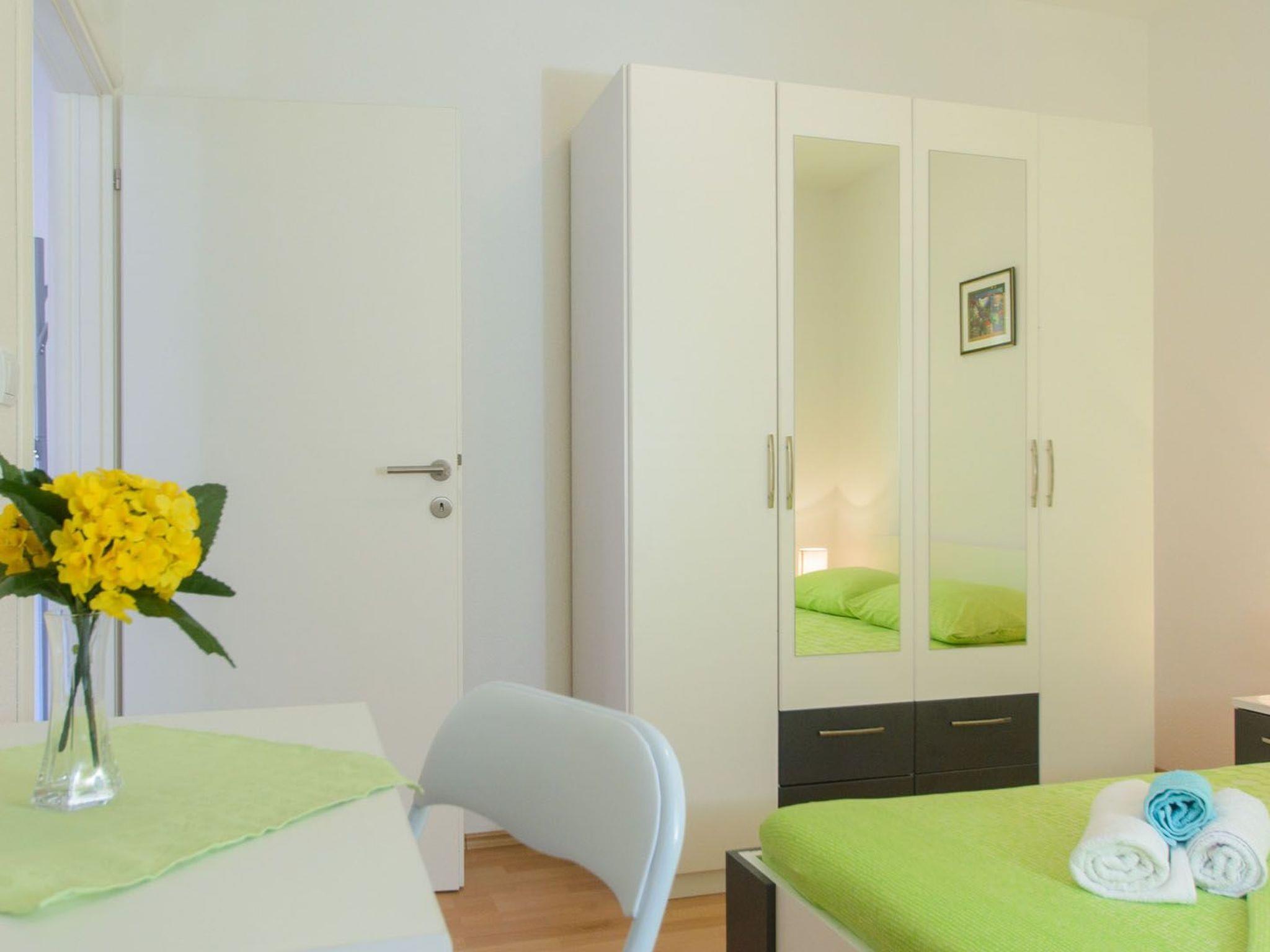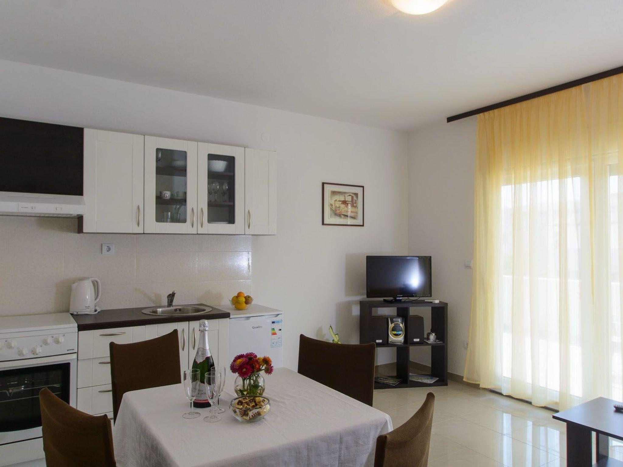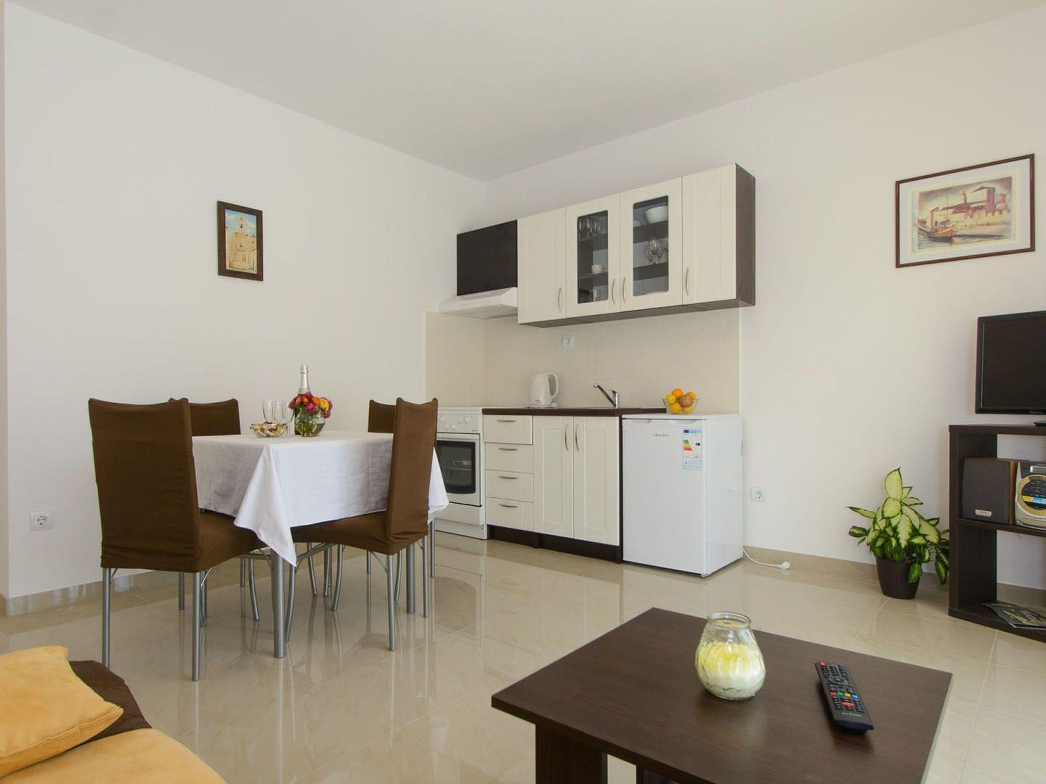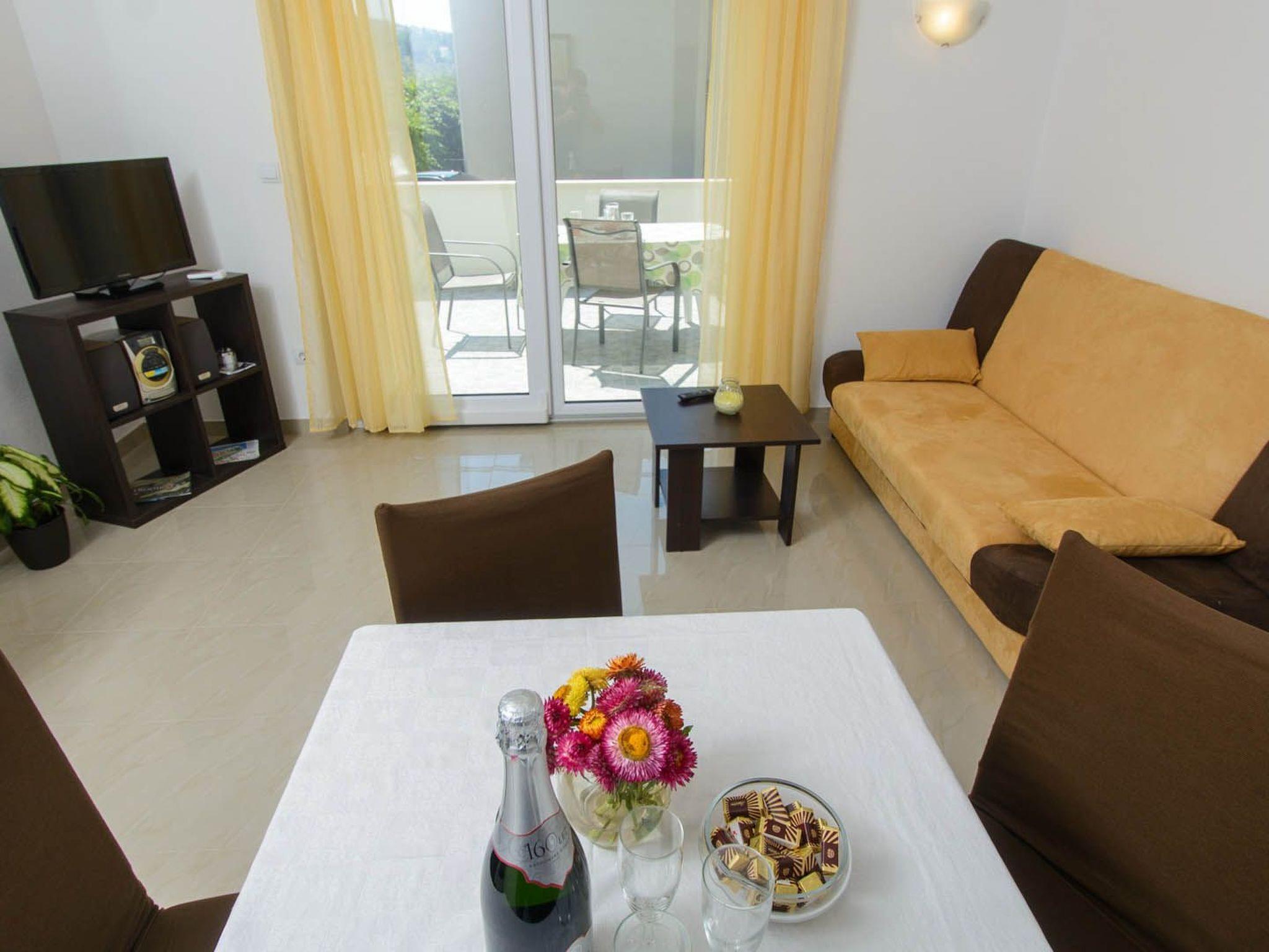 Apartment Sunrise covers 40 m2 and is located on the ground floor of a family house. The apartment consists of 1 bedroom with double bed, 1 bathroom with shower, modernly furnished living room with sofa bed for 2 persons, dining area and a kitchen. The living room has access to a spacious balcony with outdoor table and chairs. Apartment Sunrise can accommodate up to 4 persons (2+2). Apartment Sunrise is equipped with air condition, Wi-fi, SAT-TV, iron and ironing board, stove, oven, hood, refrigerator with freezer, electric kettle, coffee maker, washing machine and hair dryer. Baby cot and high chair are available on request. The property offers 1 parking place, free of charge.