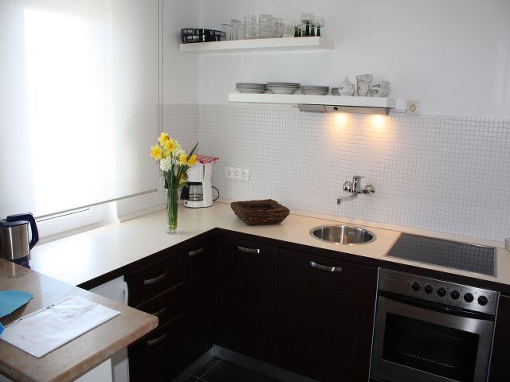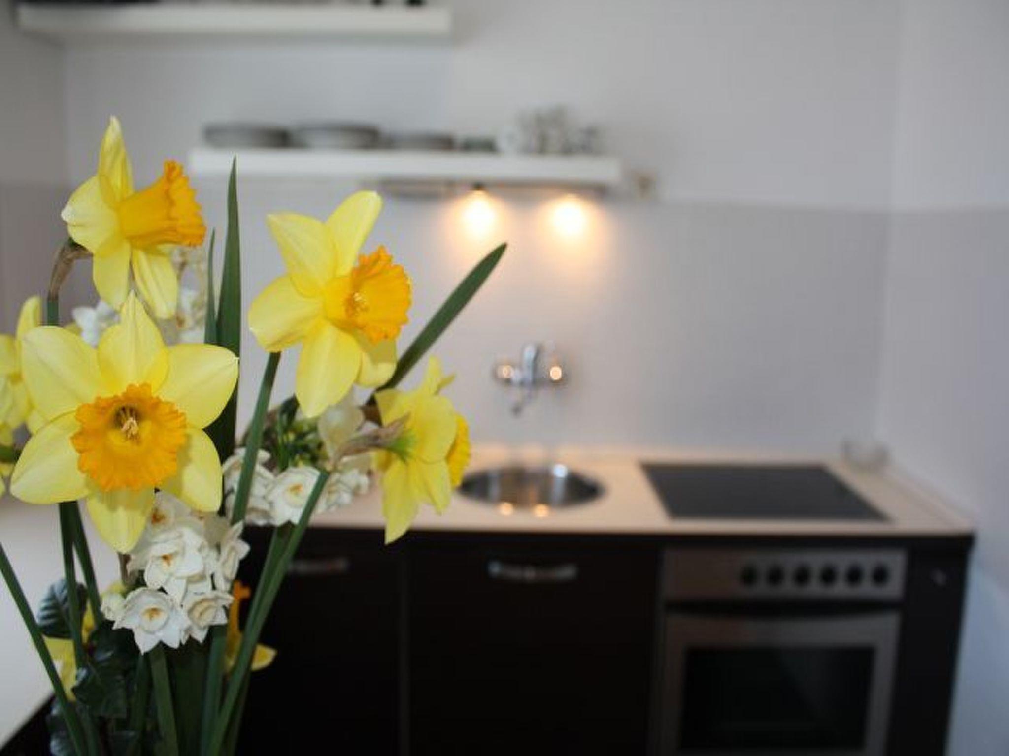 The studio apartment of around 40m² on the first floor provides a double bed and a sofa bed for two to three guests, air conditioning, a kitchen with a fridge, dishwasher, ceramic hob and oven, a bathroom with a shower. There is a Wi-Fi hotspot.