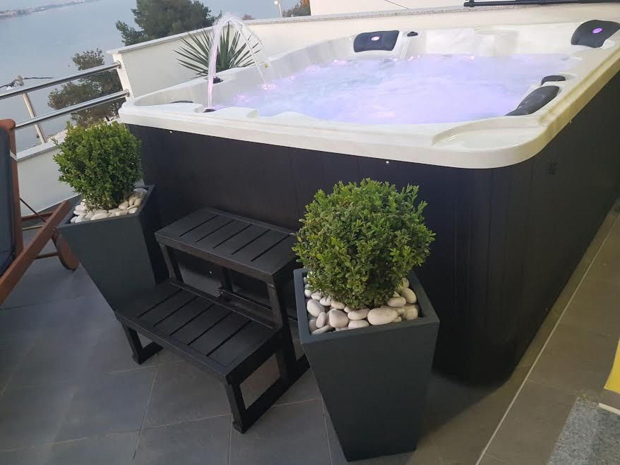 The 35m² terrace has a dining table with chairs, sun loungers and a parasol. As a highlight, there is a whirlpool for five people outdoors. Enjoy a wonderful view of the sea. Parking spaces are also available on site.