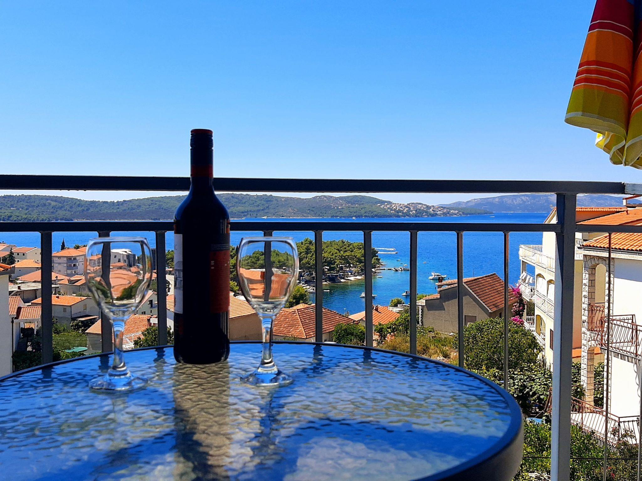 The apartment has two bedrooms, one with twin beds and a large wardrobe. The second, larger bedroom has a double bed and an additional sofa bed that can be folded into a comfortable single bed. From this bedroom, you can access a private loggia that also offers unobstructed views of the sea and the surrounding area of ??Ciovo.