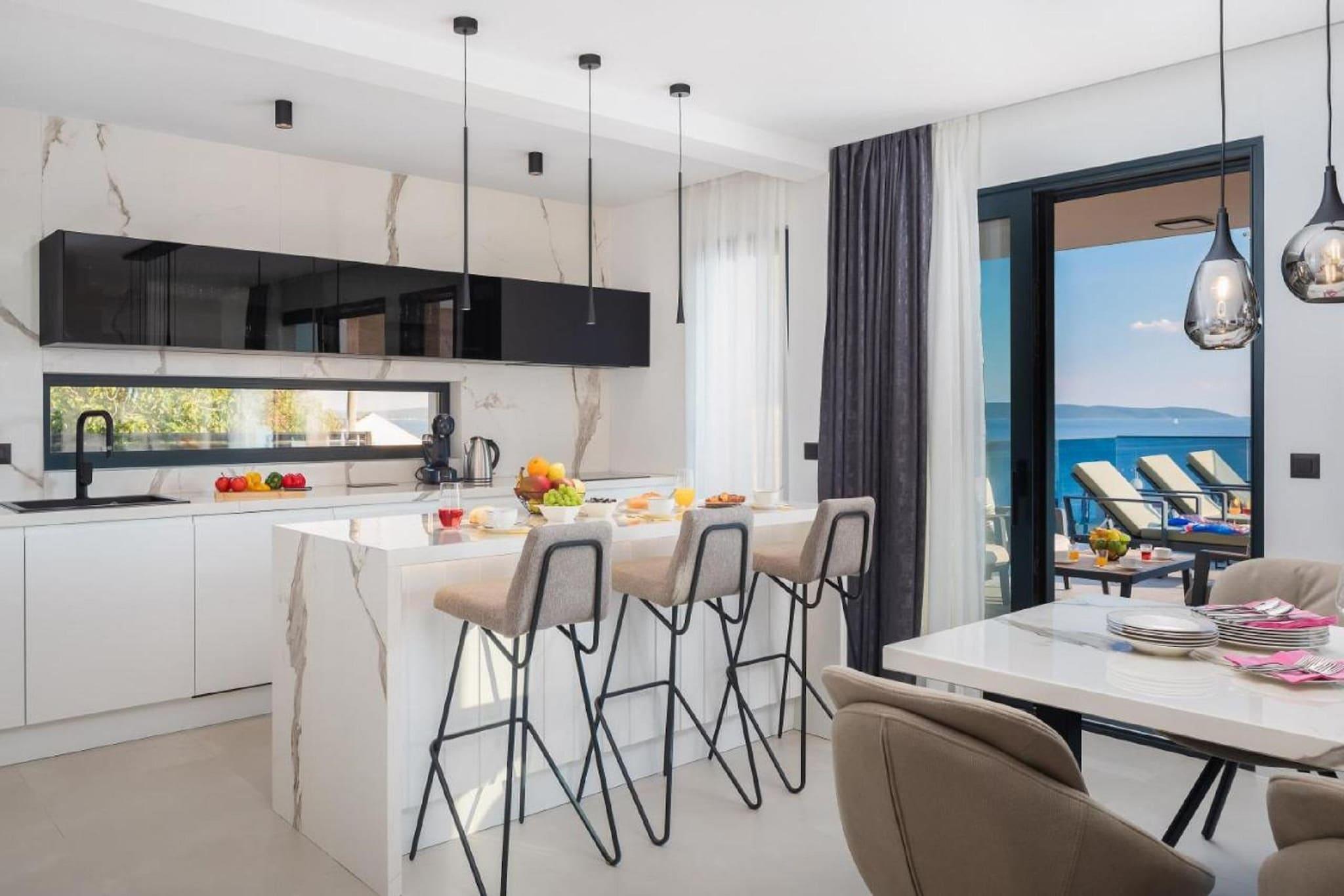 Denne elegante villa med 4 soveværelser ligger kun 350 m fra havet og 3 km fra Trogirs historiske centrum og tilbyder et luksuriøst ophold for op til 8 gæster. Med en privat pool, indhegnet have og flere terrasser er det en perfekt blanding af komfort og kystcharme, ideel til familier eller grupper. Hvert soveværelse har en dobbeltseng, en-suite badeværelse, smart-tv og aircondition, med de øverste værelser, der åbner til private balkoner. Stueetagen indeholder en stilfuld stue/spisestue, et fuldt udstyret køkken med moderne apparater og et ekstra toilet. Kælderen tilføjer et fitnessrum, sauna og ekstra badeværelse, plus en garage, vaskerum og udendørs køkken. Gæsterne kan nyde gratis WiFi, satellit-tv, bordfodbold og legeredskaber. Haven byder på liggestole, en grill og et loungesæt til afslappende aftener. Med Split Lufthavn kun 4 km væk, og butikker, caféer og restauranter inden for gåafstand, er denne villa en velindrettet base for at udforske den dalmatiske kyst.