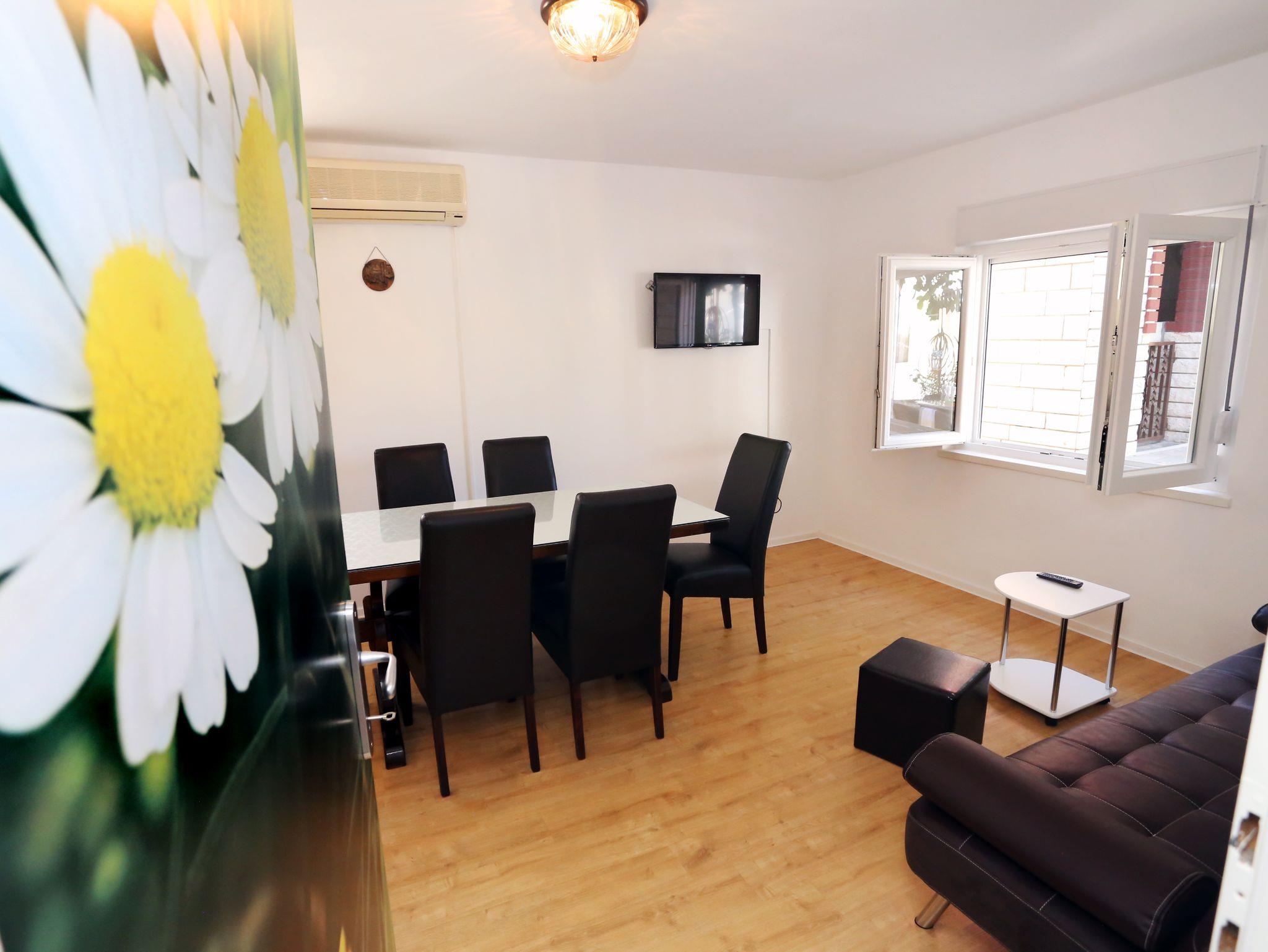 Ferienwohnung bietet Platz für 5 Gäste. Die Betten sind in Schlafzimmern, die es 2 gibt, innerhalb einer Gesamtfläche von 68m2, angeordnet. Die Gäste haben eine eigene Terrasse zur Verfügung, auf der sie in warmen Sommernächten genießen können. Es ist erlaubt, Speisen auf dem Gemeinschafts-Grill vorzubereiten. IM PREIS INBEGRIFFEN: Kurtaxe, Endreinigung, Klimatisierung, Parkplatz, Internet, Bügeleisen, Bügelbrett. VERBINDLICHE ZUSÄTZLICHE KOSTEN: Aufzahlung für Kurzaufenthalte (prozentualer Zuschlag pro Nächtigungsanzahl: 30% - 1, 20% - 2, 10% - 3). Die Verfügbarkeit zusätzlicher Dienstleistungen in Ihrem reservierten Termin und die Preise derselben (falls nicht aufgeführt) müssen im Voraus überprüft werden. Zusätzliche Dienstleistungen die in der Zahlungsaufforderung nicht aufgeführt sind werden direkt beim Vermieter bezahlt, angenommen der Gast nutzt auch diese. Ermäßigung auf den Grundpreis: Gratistag 14=13 (bei einem Aufenthalt von 14 Tagen oder mehr erhalten Sie einen Gratistag für den Aufenthalt bis 31.12.26).