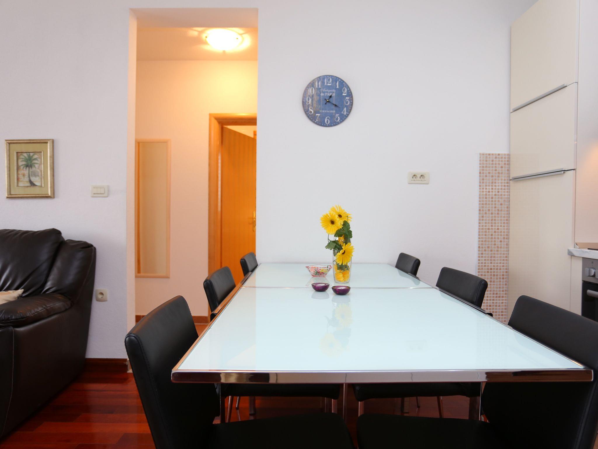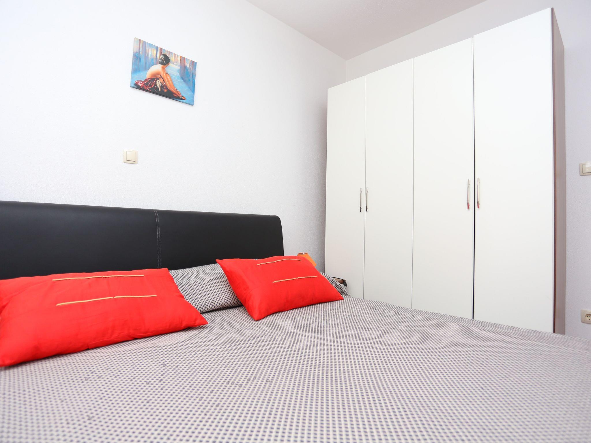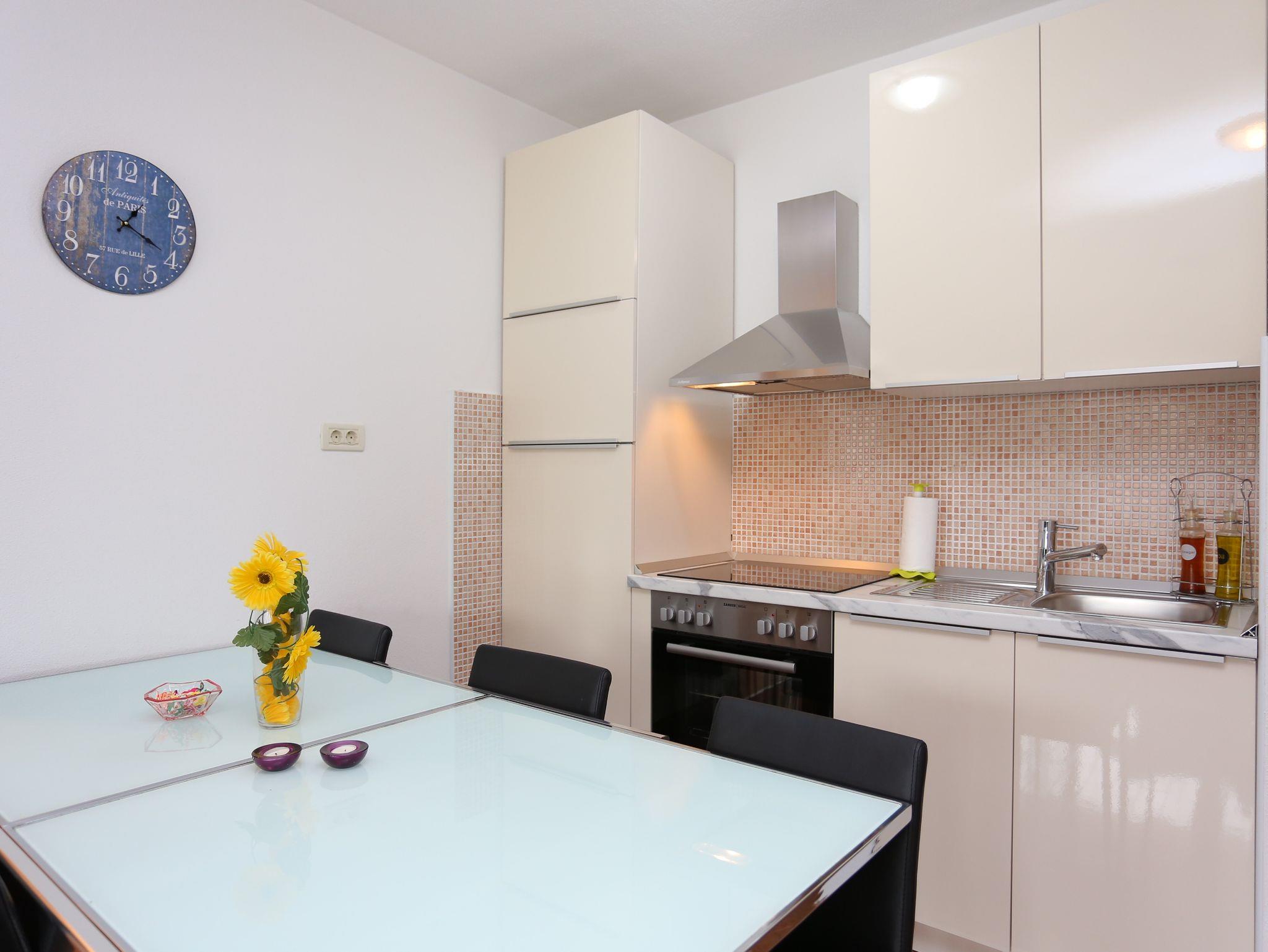 Ferienwohnung bietet Platz für 6 Gäste. Die Betten sind in Schlafzimmern, die es 2 gibt, und in Wohnzimmer, innerhalb einer Gesamtfläche von 48m2, angeordnet. Die Gäste haben eine eigene Terrasse zur Verfügung, auf der sie in warmen Sommernächten genießen können. Das Apartment bietet Meerblick. IM PREIS INBEGRIFFEN: Kurtaxe, Endreinigung, Klimatisierung, Parkplatz, Internet, Kinderbett, Bügeleisen, Bügelbrett, Föhn. VERBINDLICHE ZUSÄTZLICHE KOSTEN: Aufzahlung für Kurzaufenthalte (prozentualer Zuschlag pro Nächtigungsanzahl: 30% - 1, 20% - 2, 10% - 3). Die Verfügbarkeit zusätzlicher Dienstleistungen in Ihrem reservierten Termin und die Preise derselben (falls nicht aufgeführt) müssen im Voraus überprüft werden. Zusätzliche Dienstleistungen die in der Zahlungsaufforderung nicht aufgeführt sind werden direkt beim Vermieter bezahlt, angenommen der Gast nutzt auch diese. Ermäßigung auf den Grundpreis: Gratistag 14=13 (bei einem Aufenthalt von 14 Tagen oder mehr erhalten Sie einen Gratistag für den Aufenthalt bis 31.12.26).
