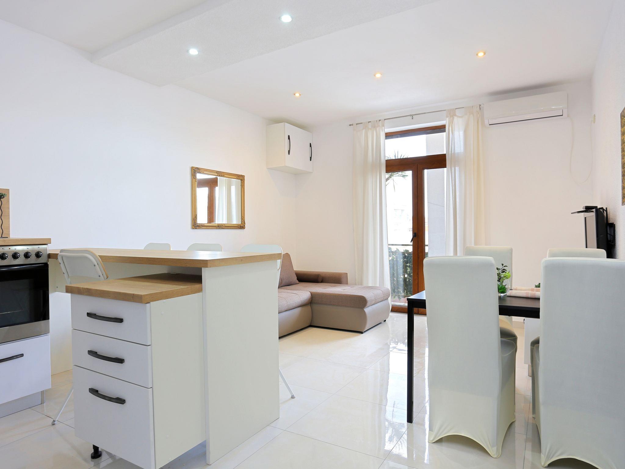 Ferienwohnung bietet Platz für 5 Gäste. Die Betten sind in Schlafzimmern, die es 2 gibt, und in Wohnzimmer, innerhalb einer Gesamtfläche von 54m2, angeordnet. Die Gäste haben eine eigene Terrasse zur Verfügung, auf der sie in warmen Sommernächten genießen können. Das Apartment bietet Meerblick. Es ist erlaubt, Speisen auf dem Gemeinschafts-Grill vorzubereiten. In der Unterkunftseinheit besteht die Möglichkeit des Mitbringens von Haustieren gegen Aufpreis. Unterkunftseinheit hat Räume, die von dem Rest der Einheit abgetrennt werden. IM PREIS INBEGRIFFEN: Kurtaxe, Endreinigung, Klimatisierung, Parkplatz, Garage, Internet, Kinderbett, Bügeleisen, Föhn, Liegestühle. UNVERBINDLICHE ZUSÄTZLICHE KOSTEN: Haustiere (5,00 € pro Nacht). Die Verfügbarkeit zusätzlicher Dienstleistungen in Ihrem reservierten Termin und die Preise derselben (falls nicht aufgeführt) müssen im Voraus überprüft werden. Zusätzliche Dienstleistungen die in der Zahlungsaufforderung nicht aufgeführt sind werden direkt beim Vermieter bezahlt, angenommen der Gast nutzt auch diese.
