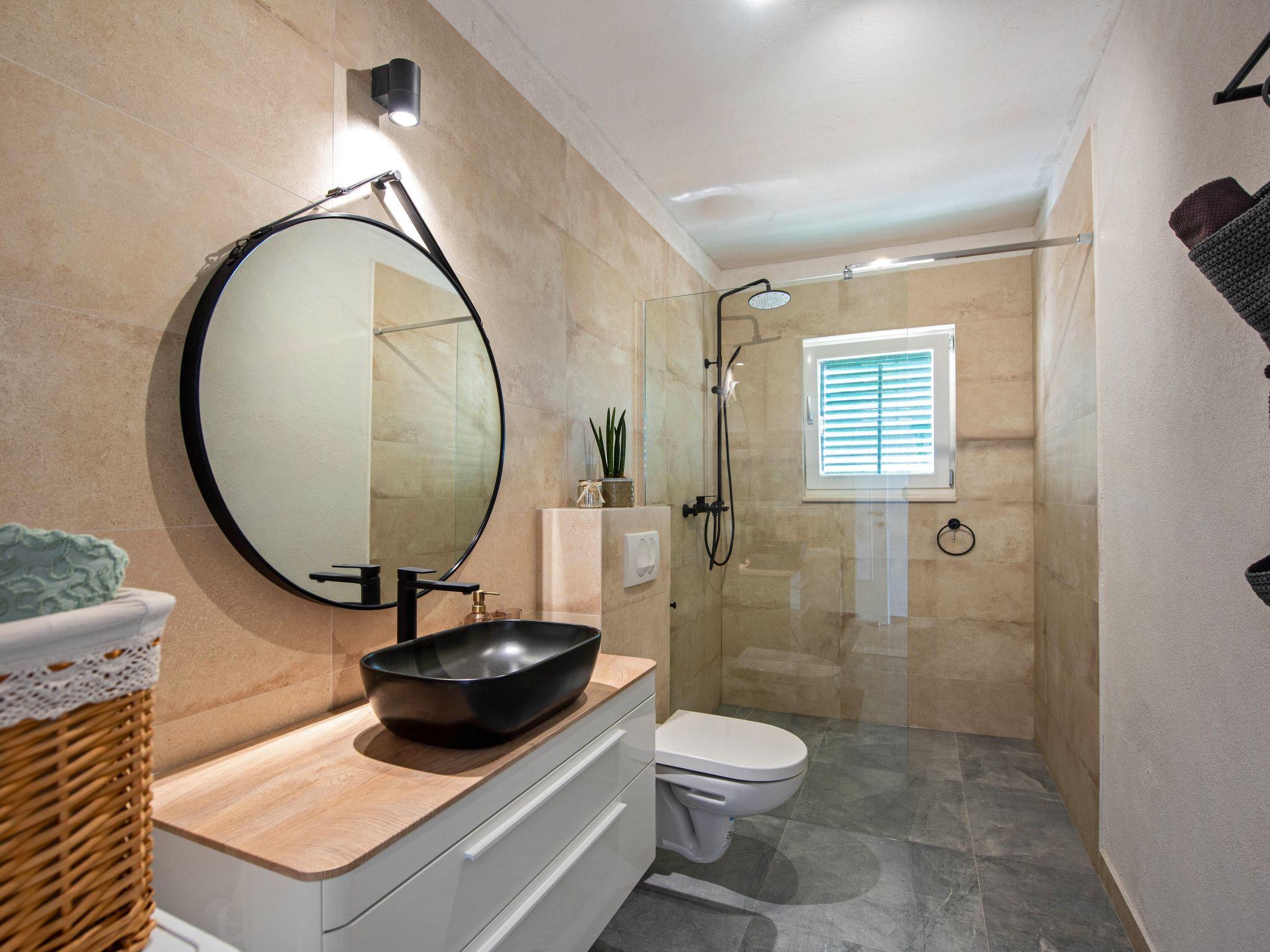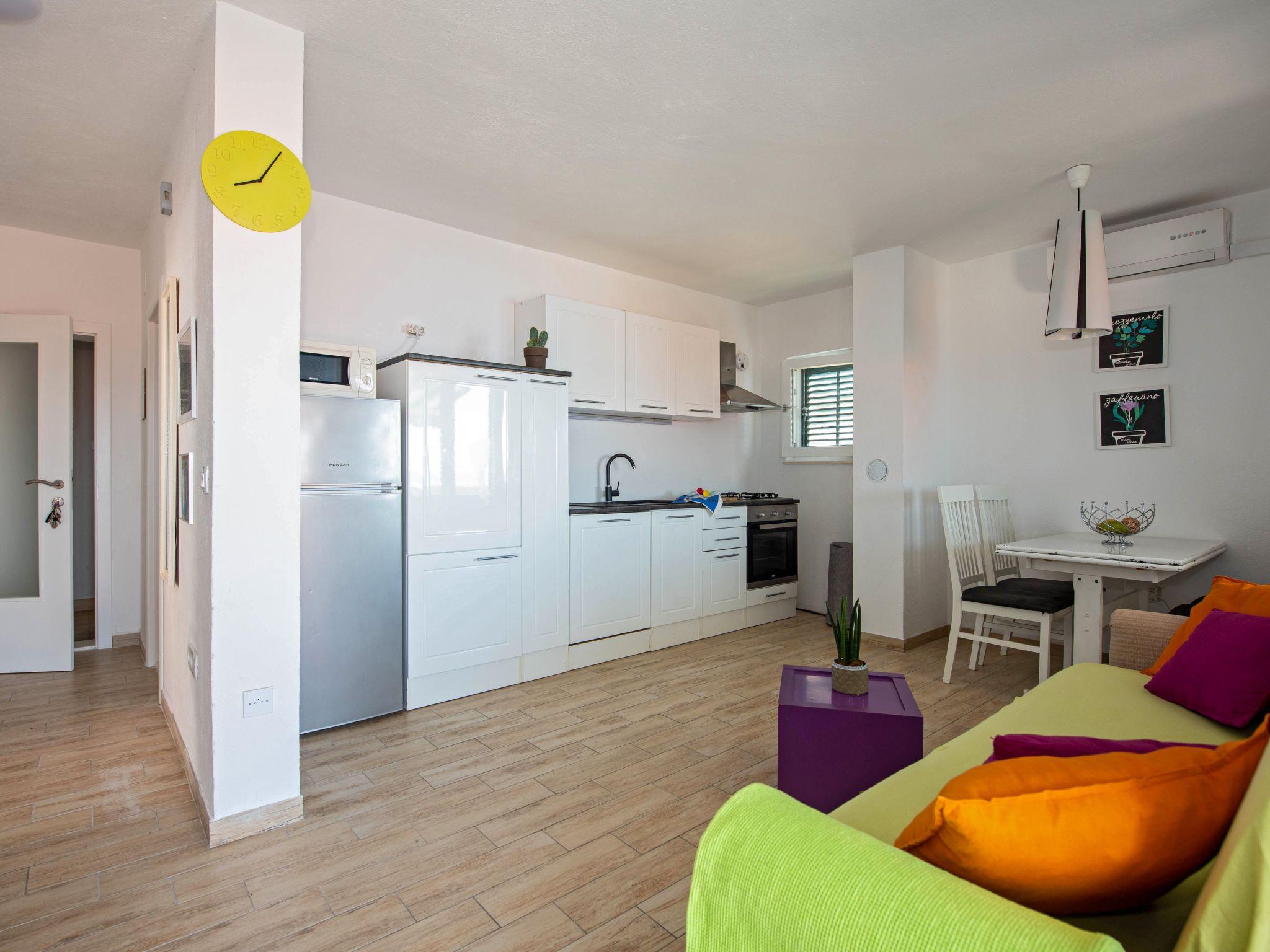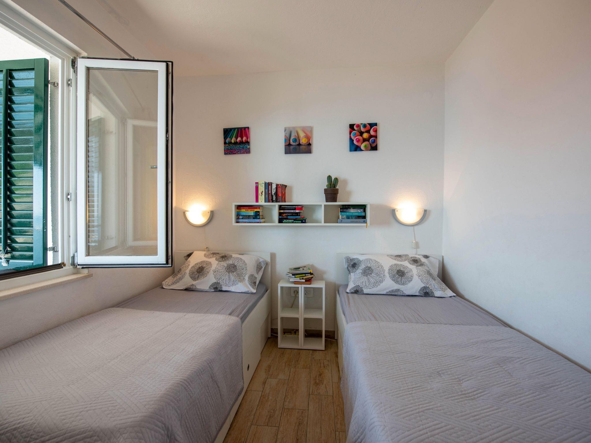 Your holiday apartment is only about 100 metres from the sea with crystal clear water. A narrow path leads right past the apartment, leading to a little boat jetty just a few minutes away. The nearest café is just 50 metres away. There is a sandy beach about 1km away. It is about 3km to the village centre of Okrug Gornji with a good selection of shops, colourful markets, cafés and restaurants.