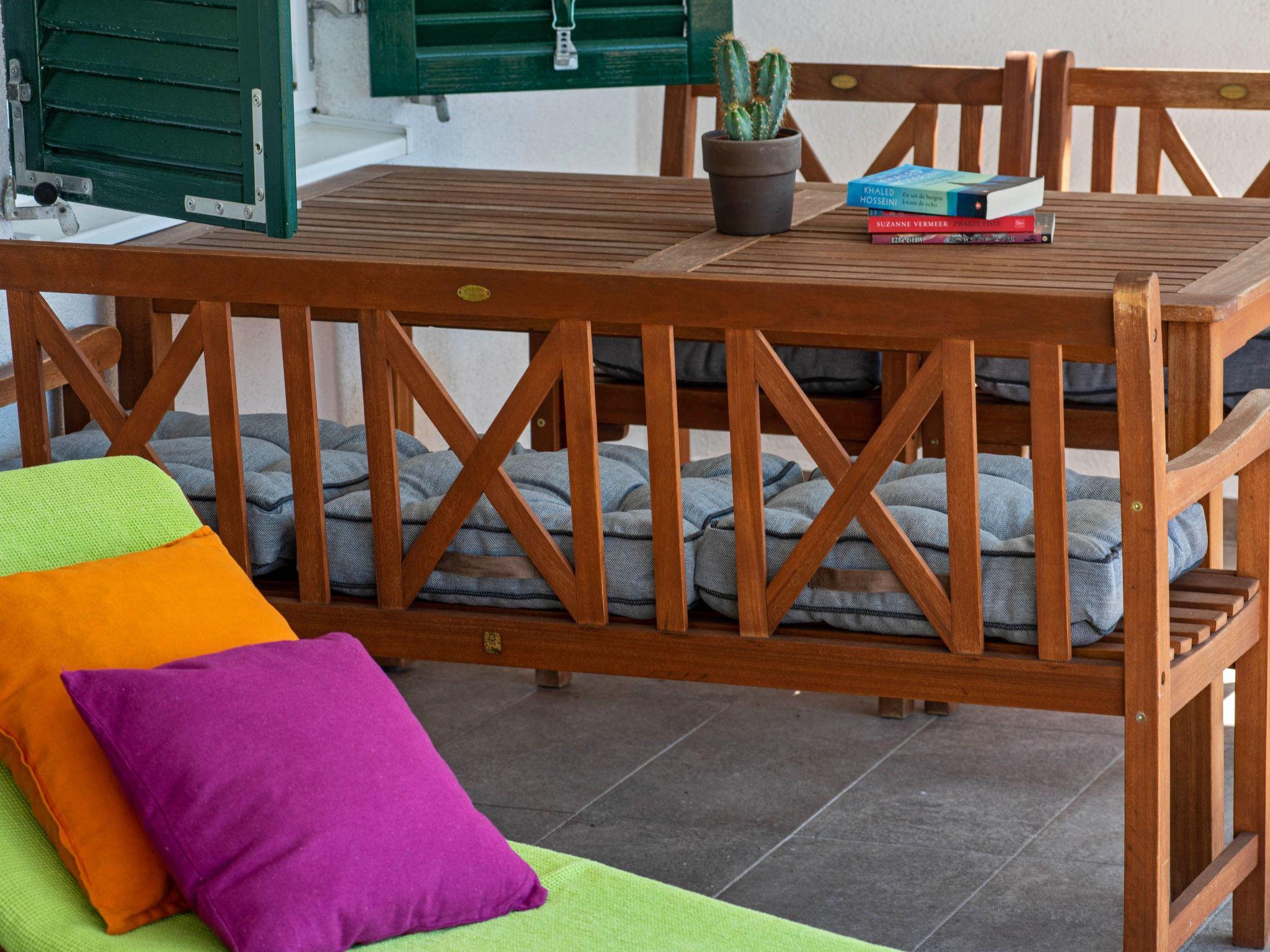 The living room opens directly onto the private terrace with modern seating and a table, as well as an awning for pleasant, cool shade. The garden area right in front of the house is shared with the apartments on the ground floor and on the second floor, which are occupied by the owner’s aunts in the summer. The barbecue invites you to spend long, leisurely evenings under the starry sky. Secure and free parking spaces are available right in front of the building.